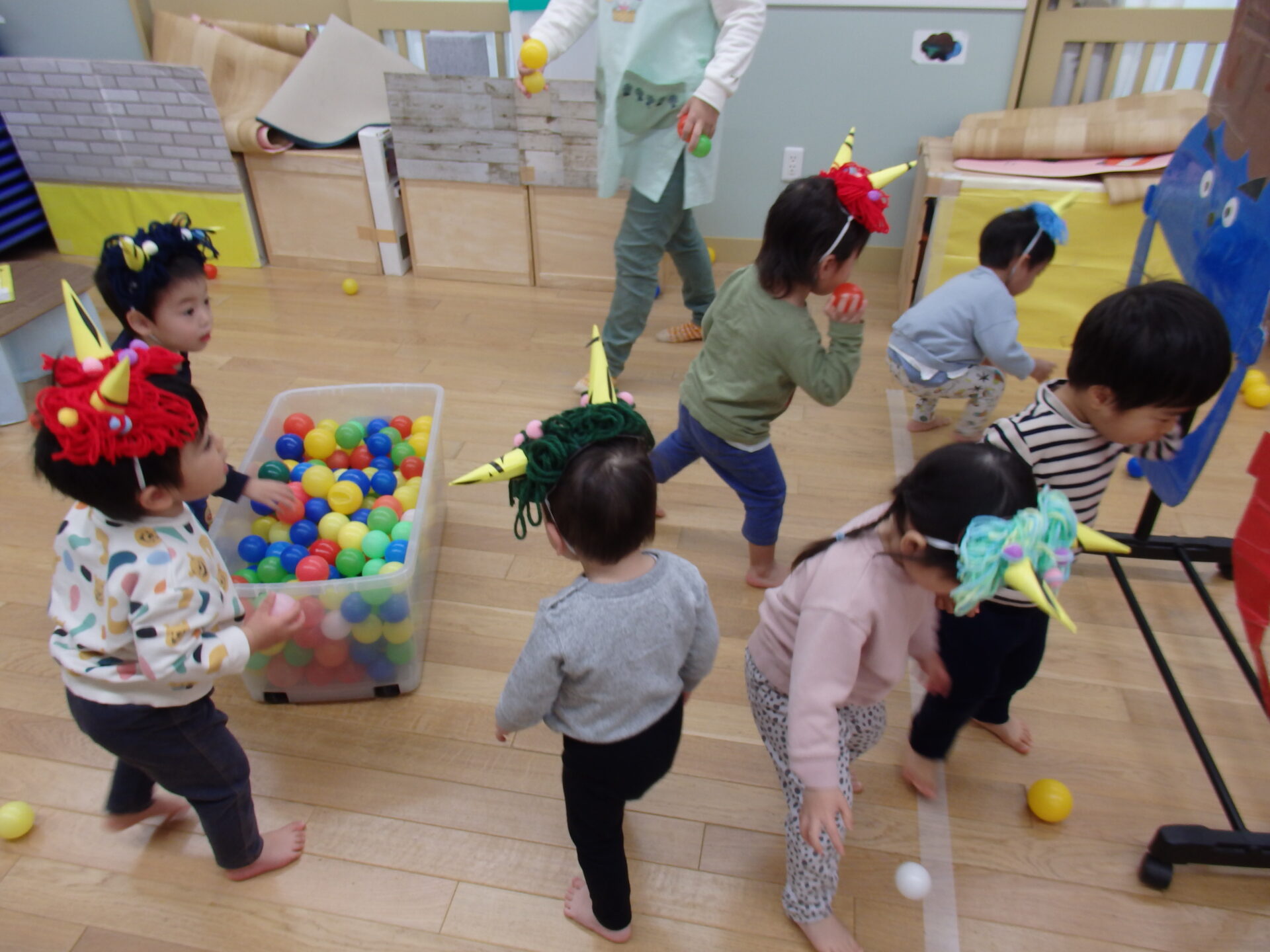 ゲームの内容:乳児→鬼の的当て 幼児→鬼と一緒に玉入れです。