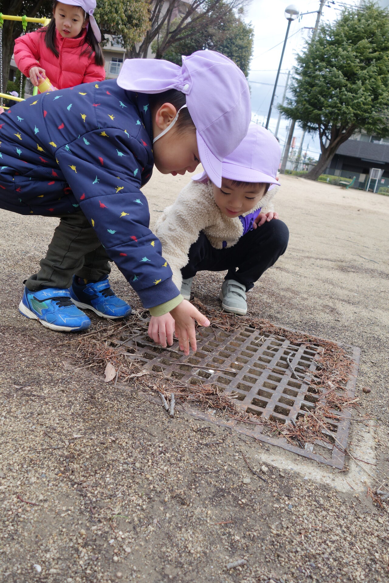 排水溝にどんぐりを落としてみたら、何か音がしたことに気が付いて