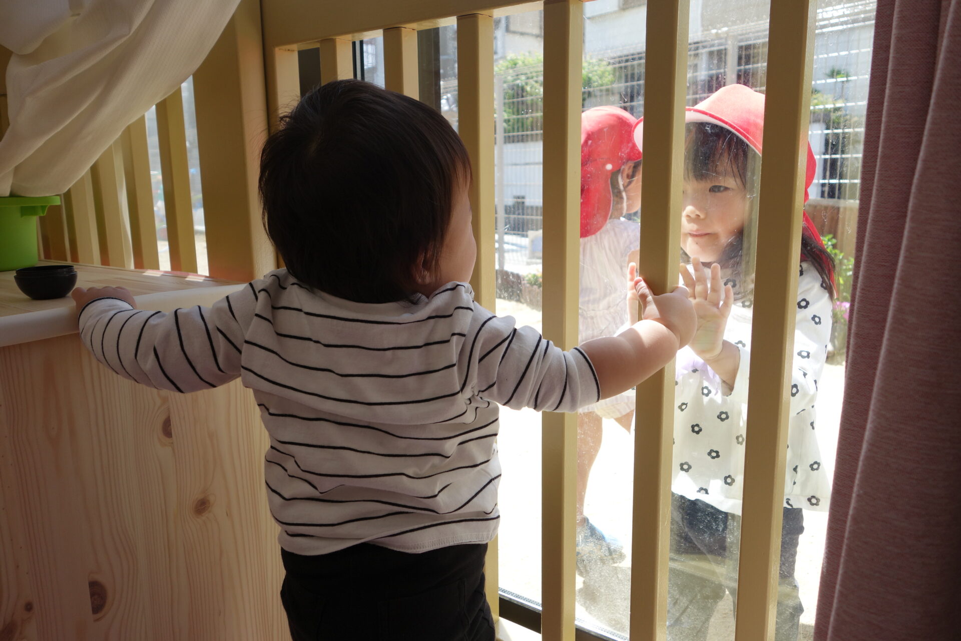 お部屋にいると、園庭から「おーい!赤ちゃーん!」と大きいクラスのお友だちが呼んでくれます。