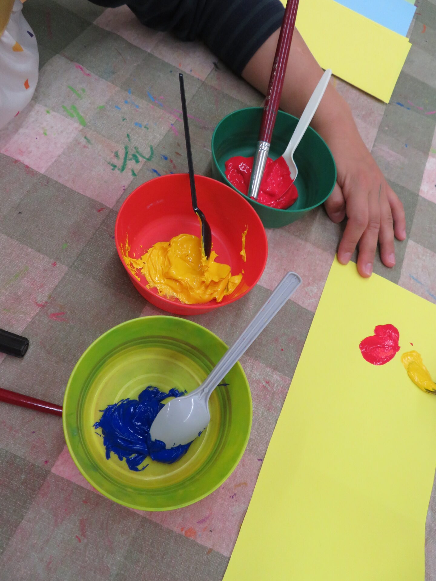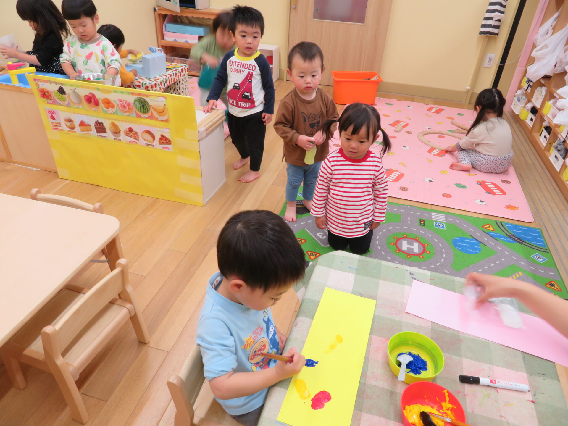 2歳児のこいのぼりは、この3色の絵の具を使って製作を行いました。
