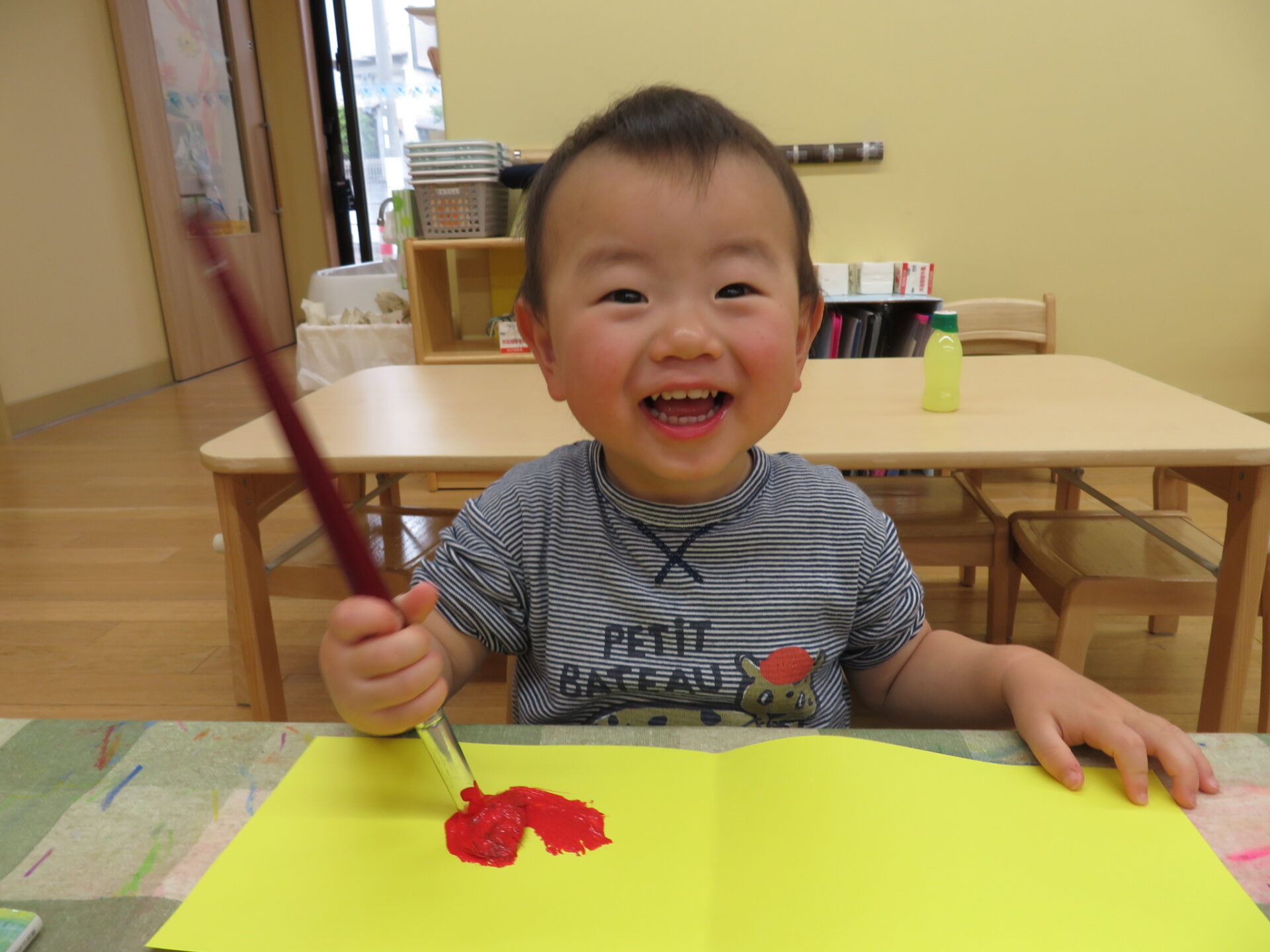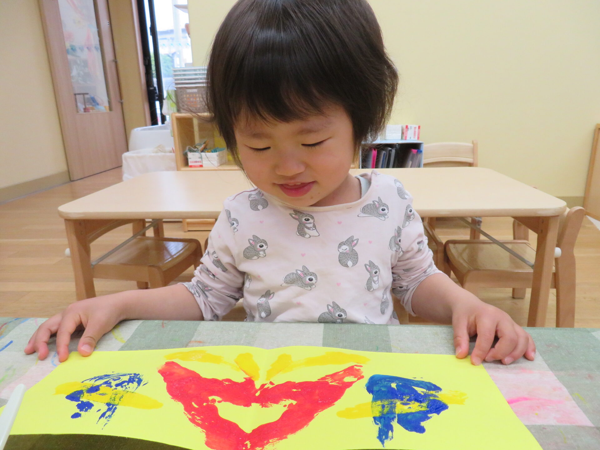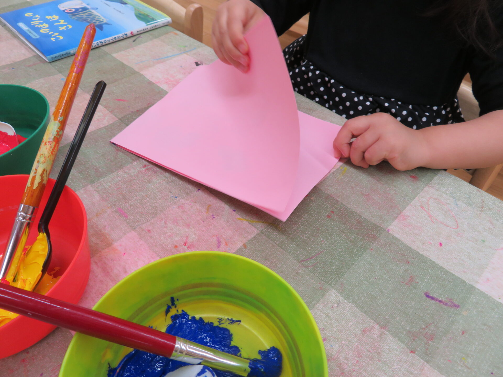 絵の具をたっぷりとつけた画用紙を、自分で半分に折りたたみます。