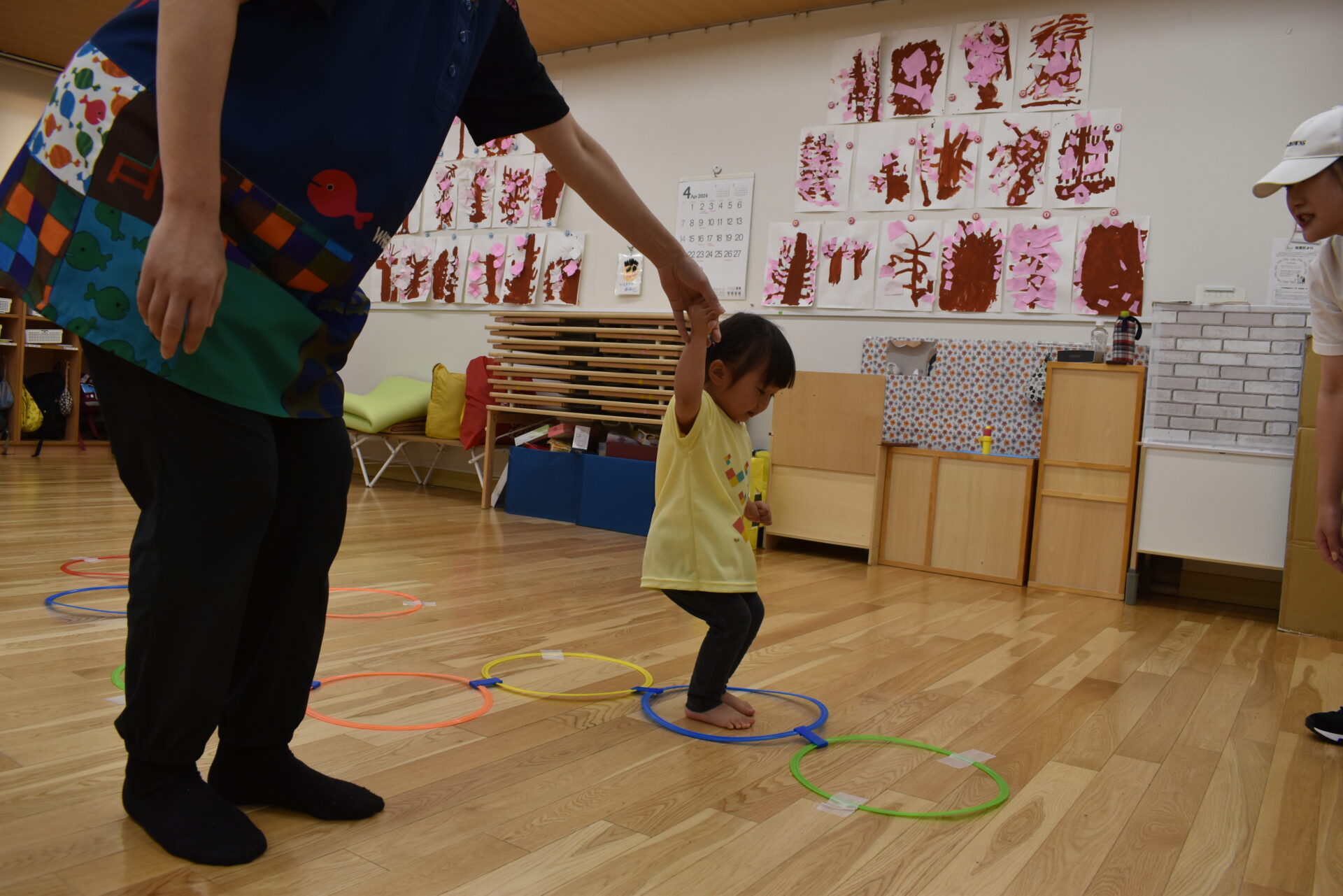 一人では少し怖いな…という子は、保育士と一緒にジャンプです!