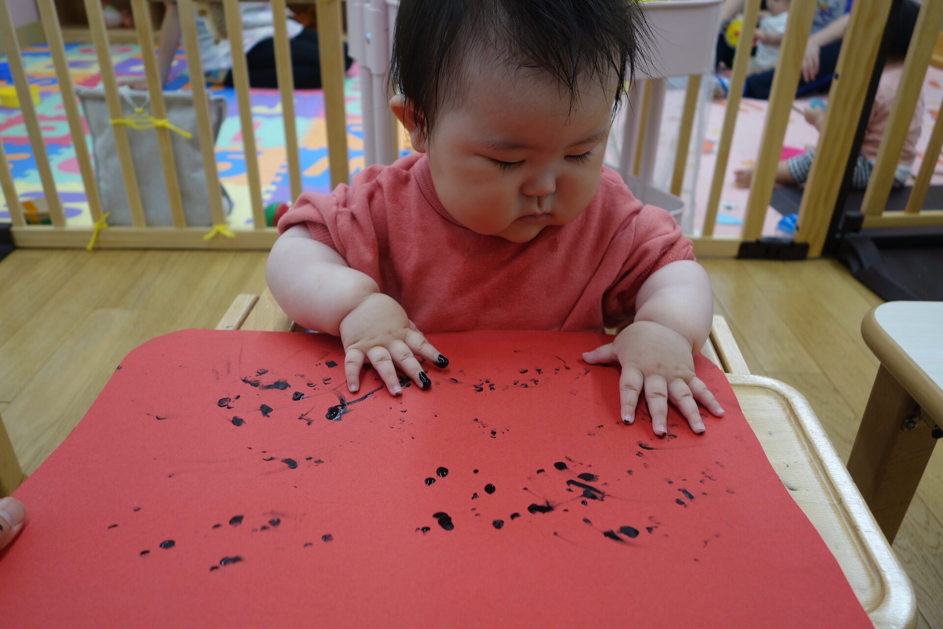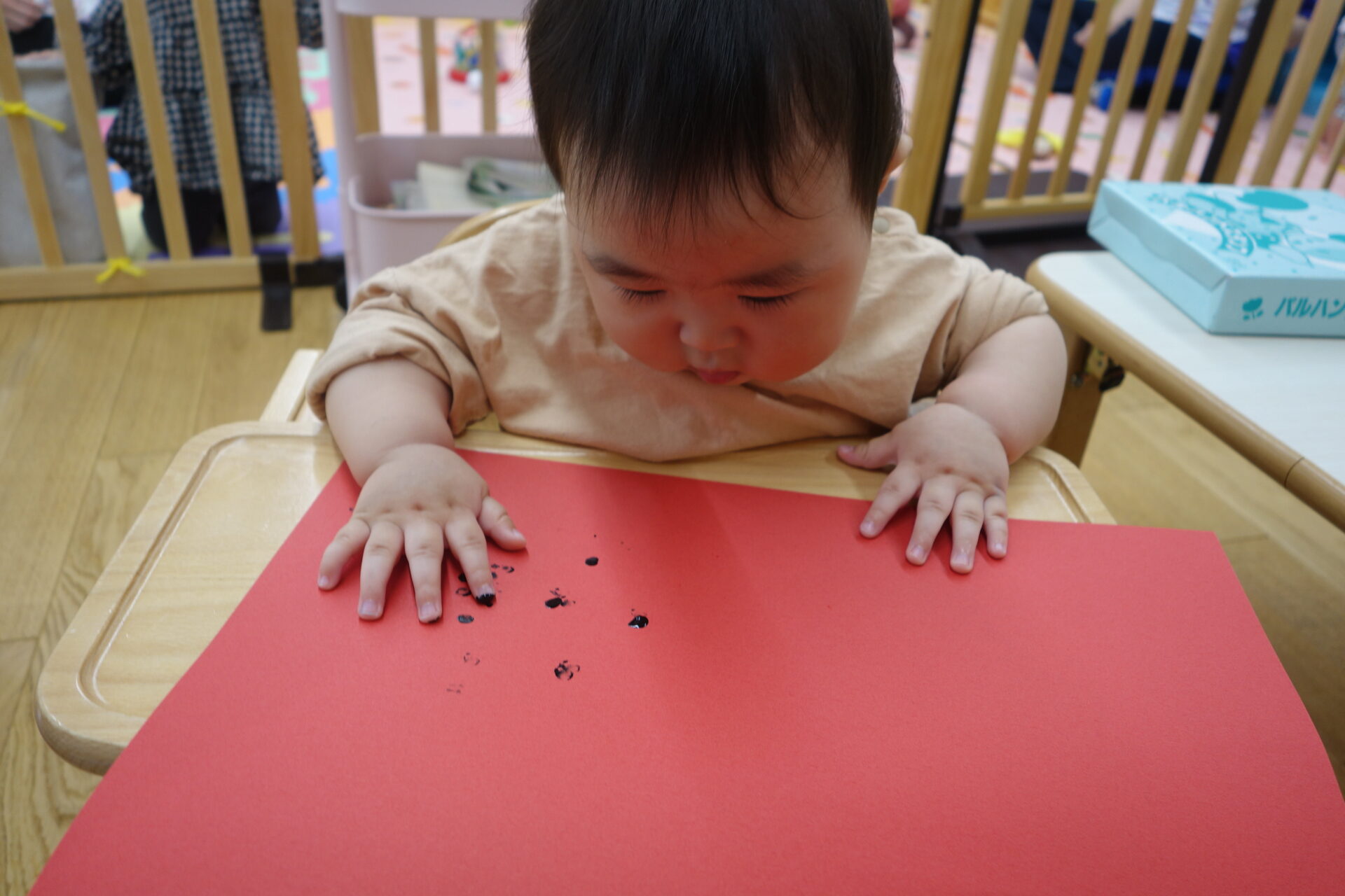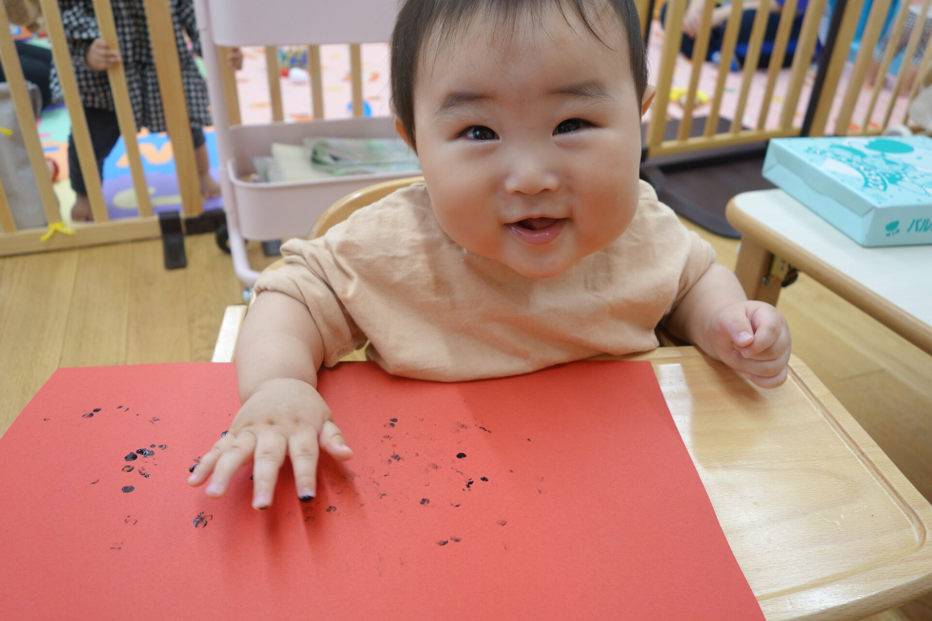 そして保育士と一緒に画用紙の上に手を置くと…