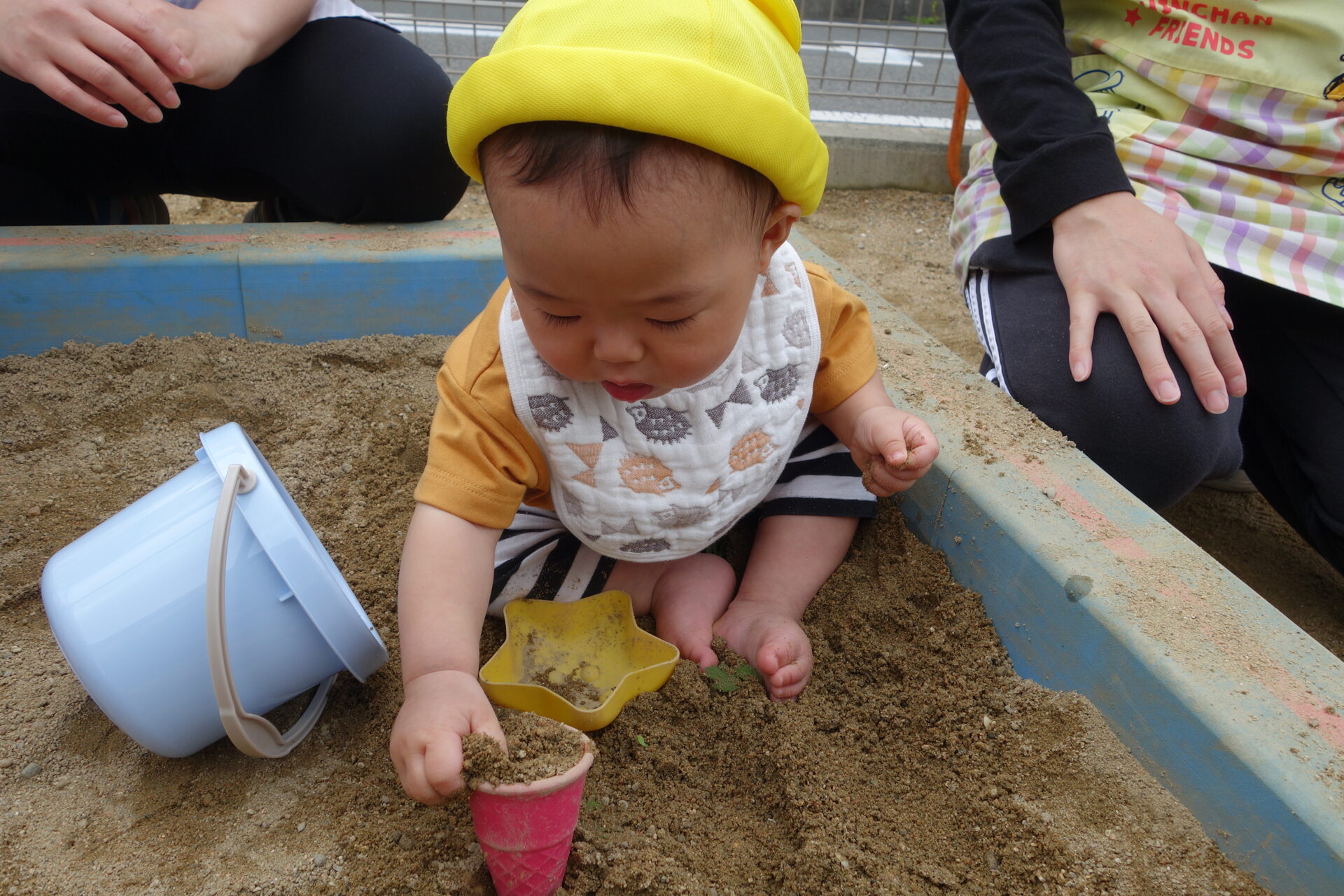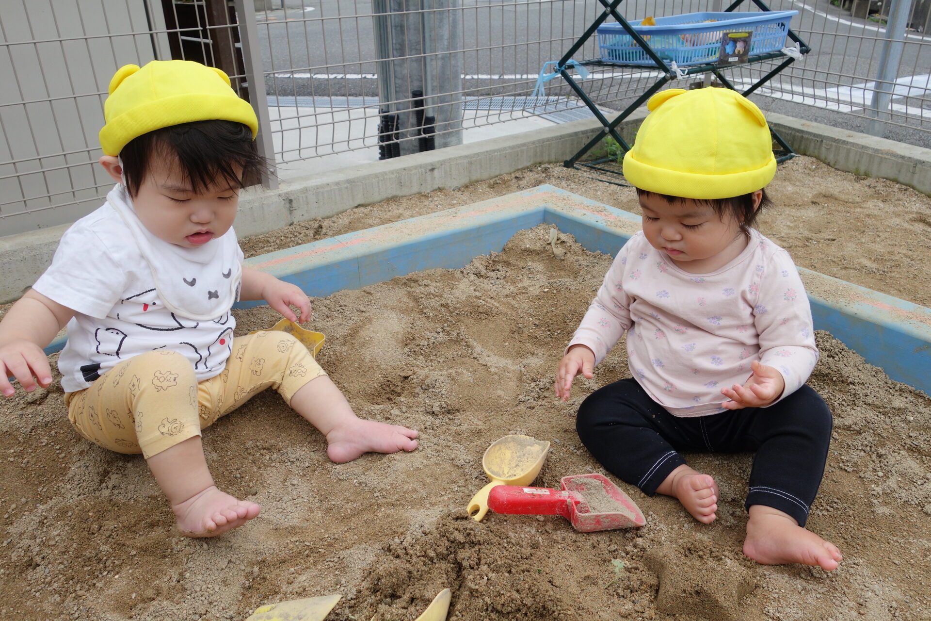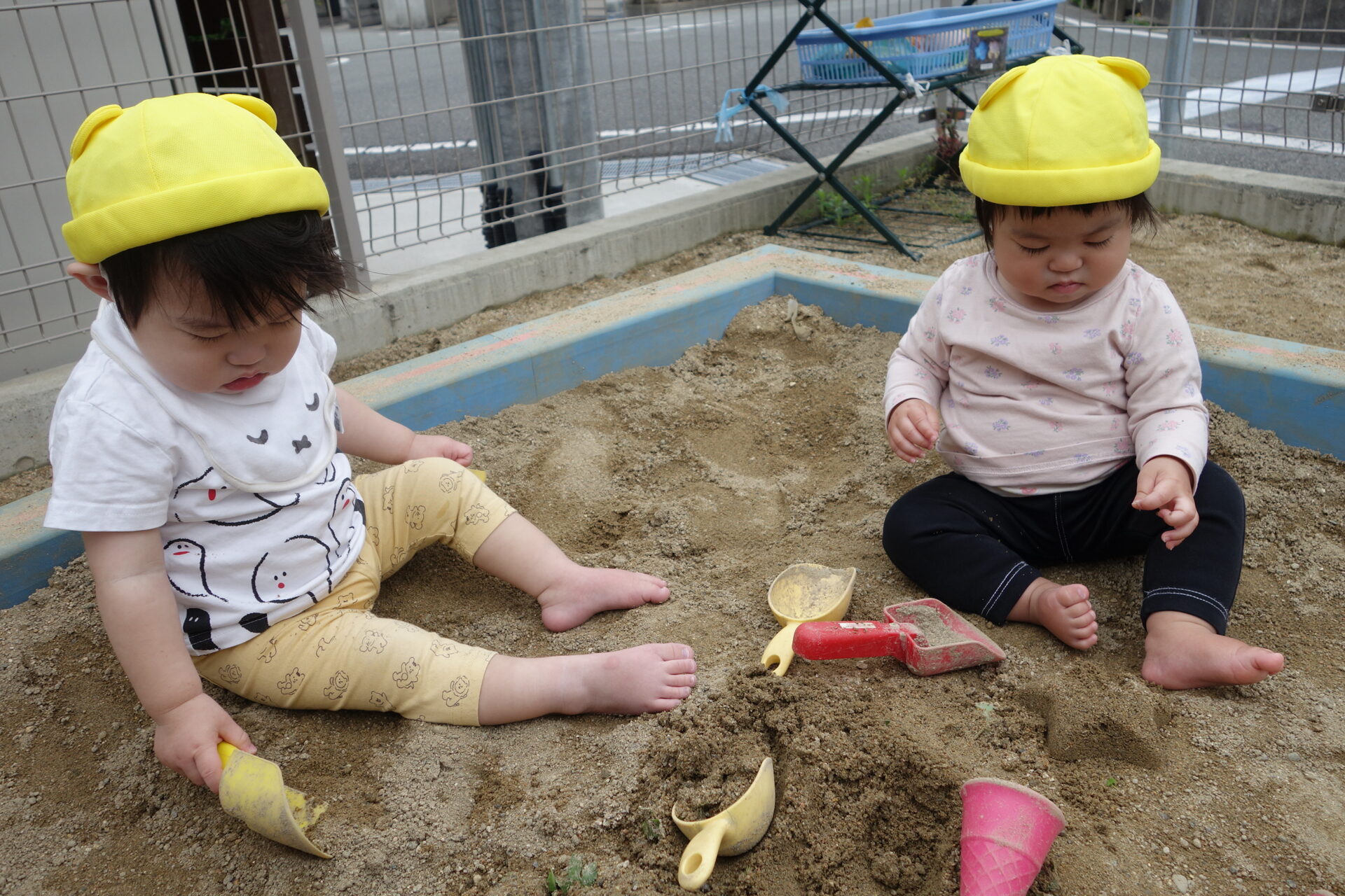 もっと慣れてくると、保育士の作った砂のお山を崩して遊んだり、