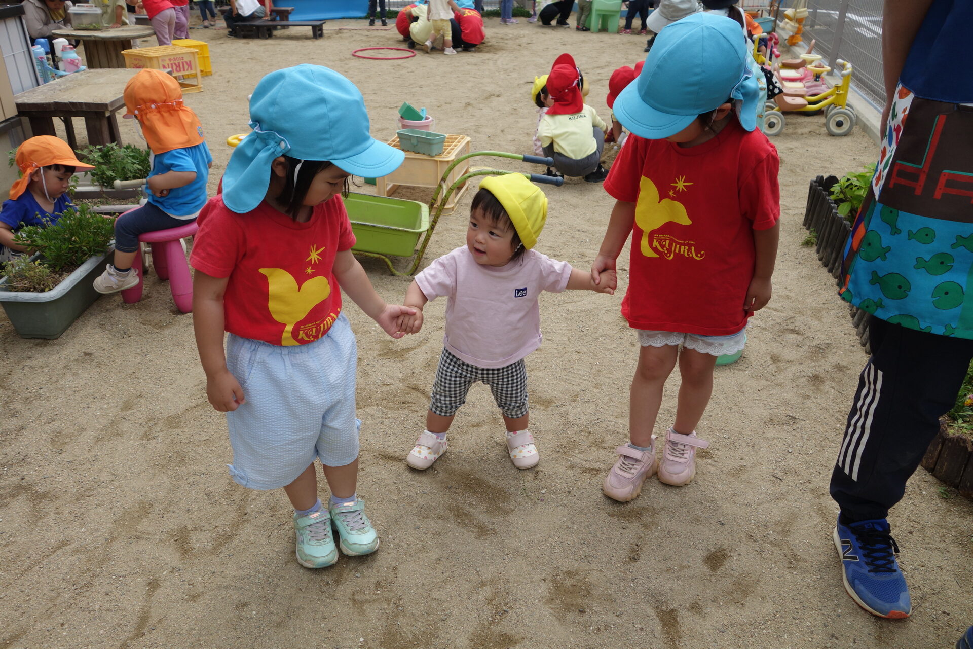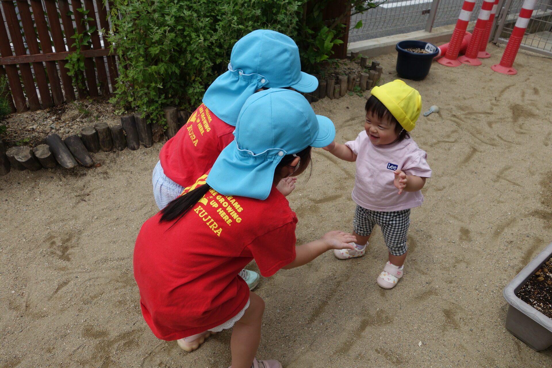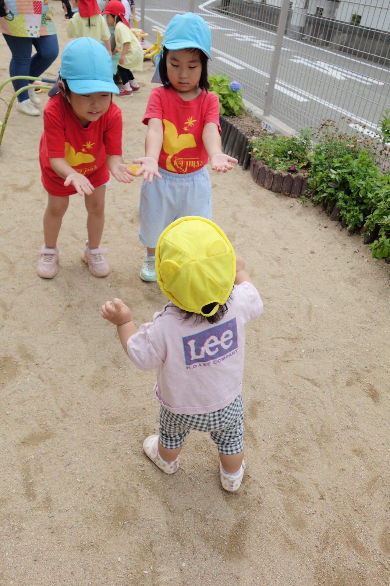 お外では靴を履いて歩いていると、くじら組のお姉さん達が「おいで!」と