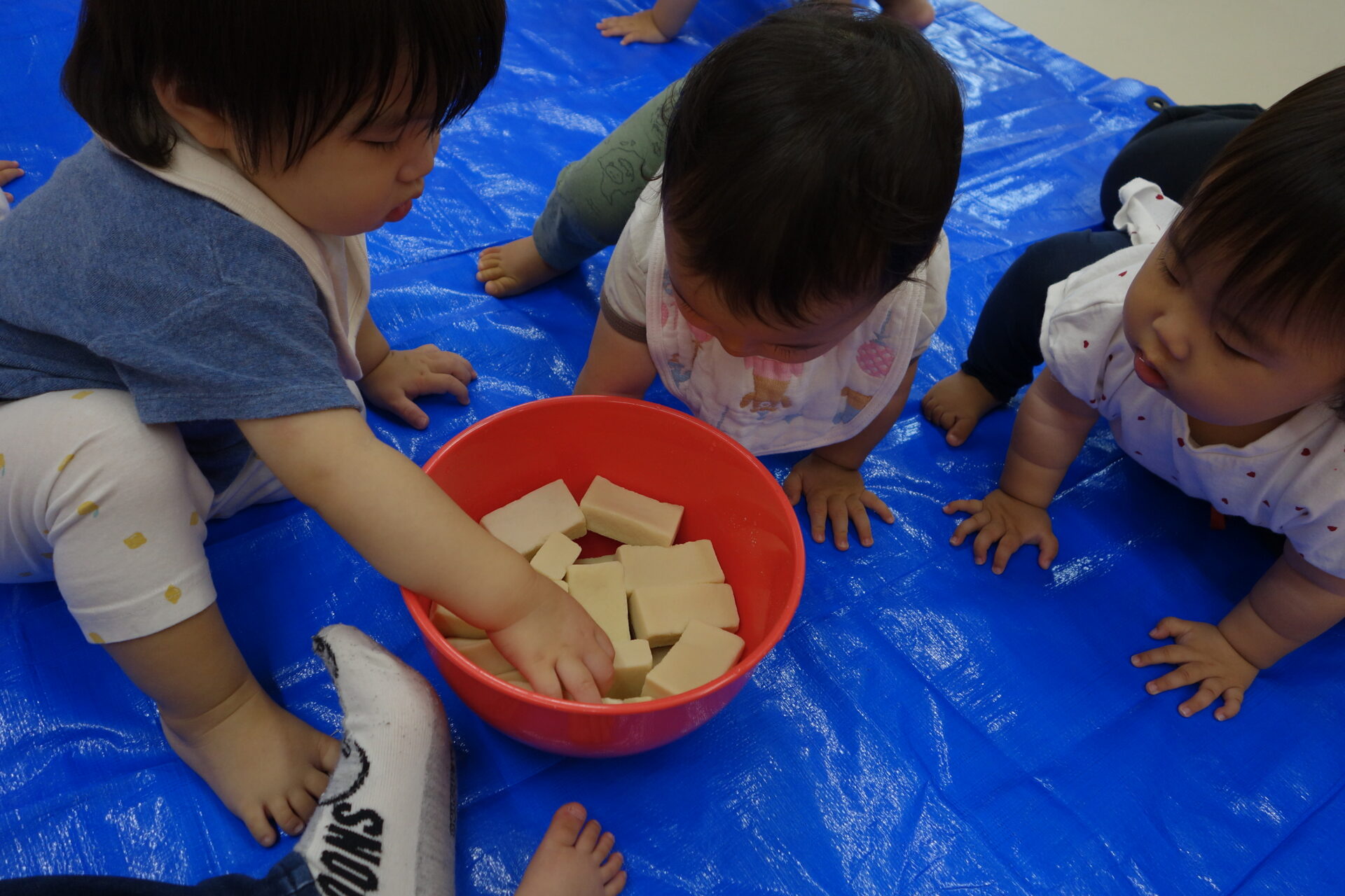 初めて触れる物はちょっとドキドキして、最初は首を振って嫌がる子どももいました。そんな時は無理せず、保育士のお膝に座ってみんなの様子を見れるようにします。すると、だんだん遊んでみたい気持ちが芽生え、自分のペースでゆっくり慣れていつのまにか遊べるようになっていました。これからも色々な物に触れて遊ぶ機会を作っていきたいと思います。