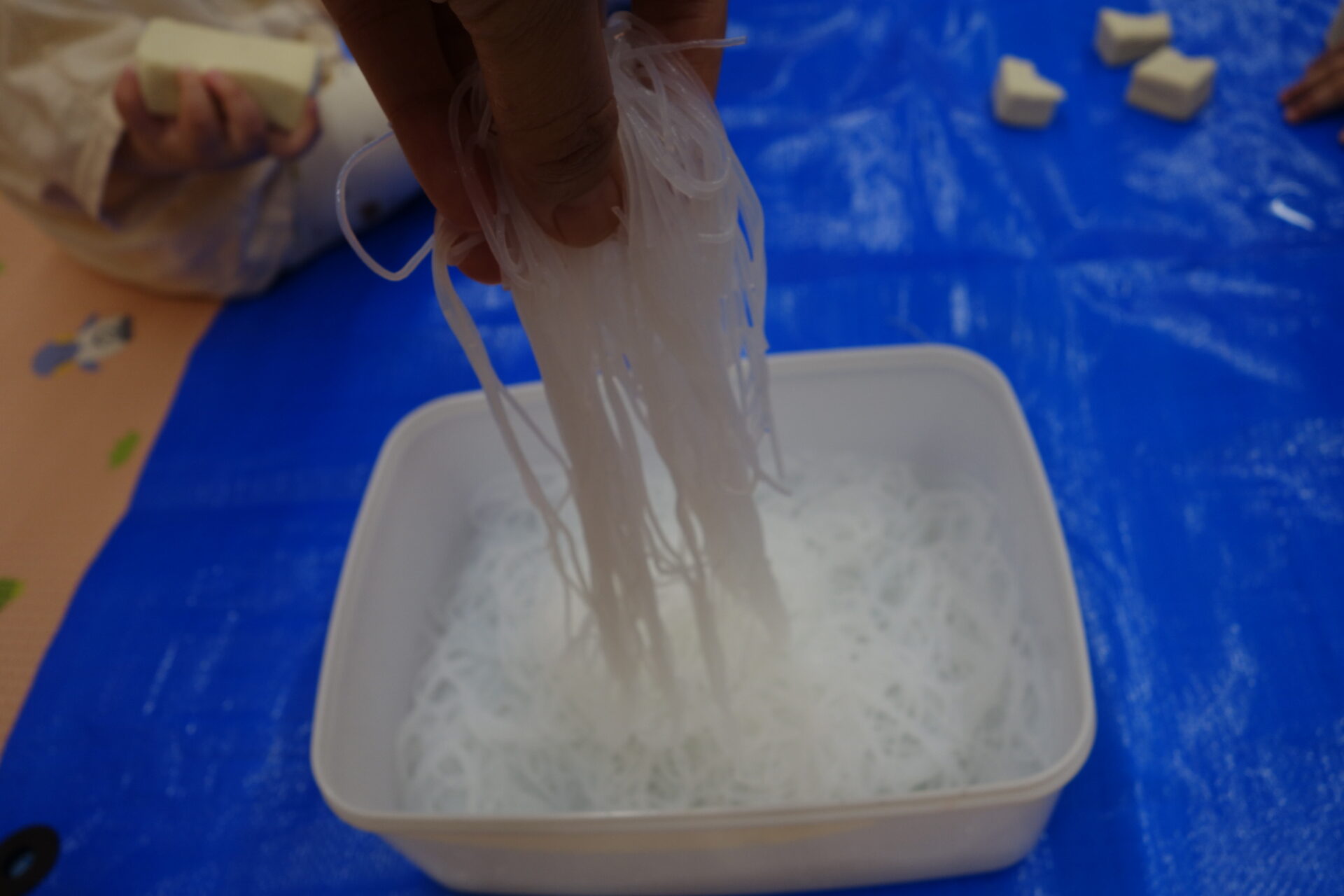 水につけておくと、ふわふわのスポンジみたいな感触になります。手で少し握ると水がぽたぽた垂れておもしろいです!高野豆腐をちぎったり握ったりして遊んでいました。