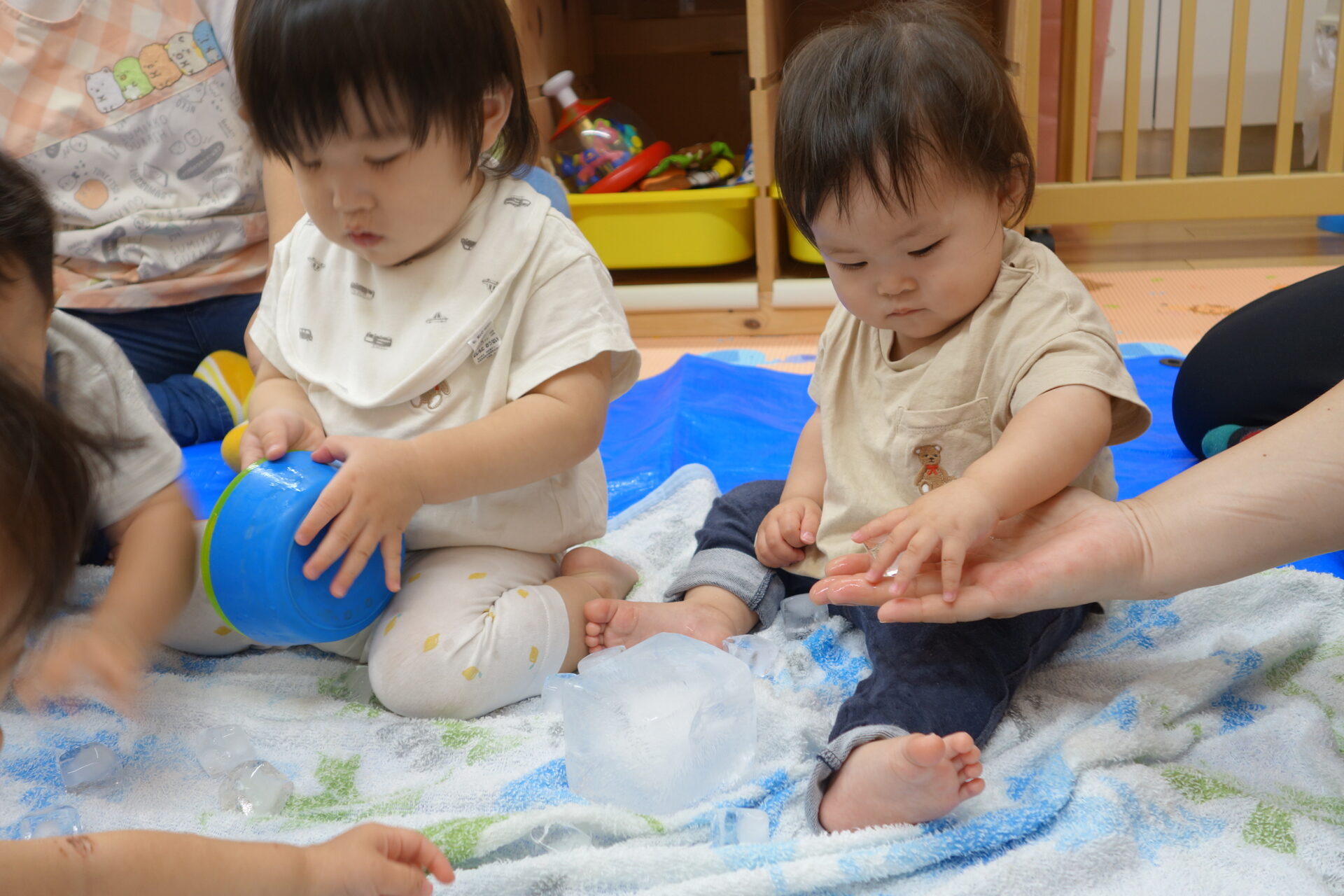 冷たい感触に最初はびっくりしていましたが、まずは指先で触って確かめて、大丈夫だと分かると握ってお皿にいれたり、氷のつるつるした感触を楽しんだりしていました。