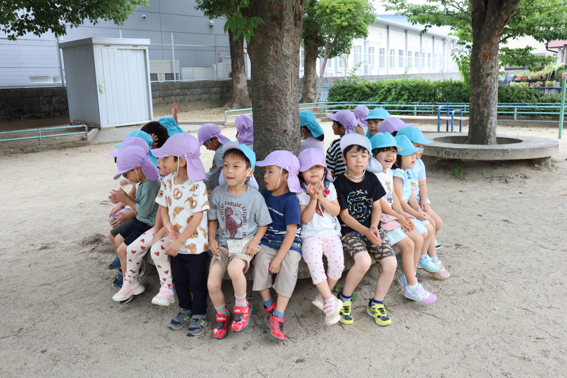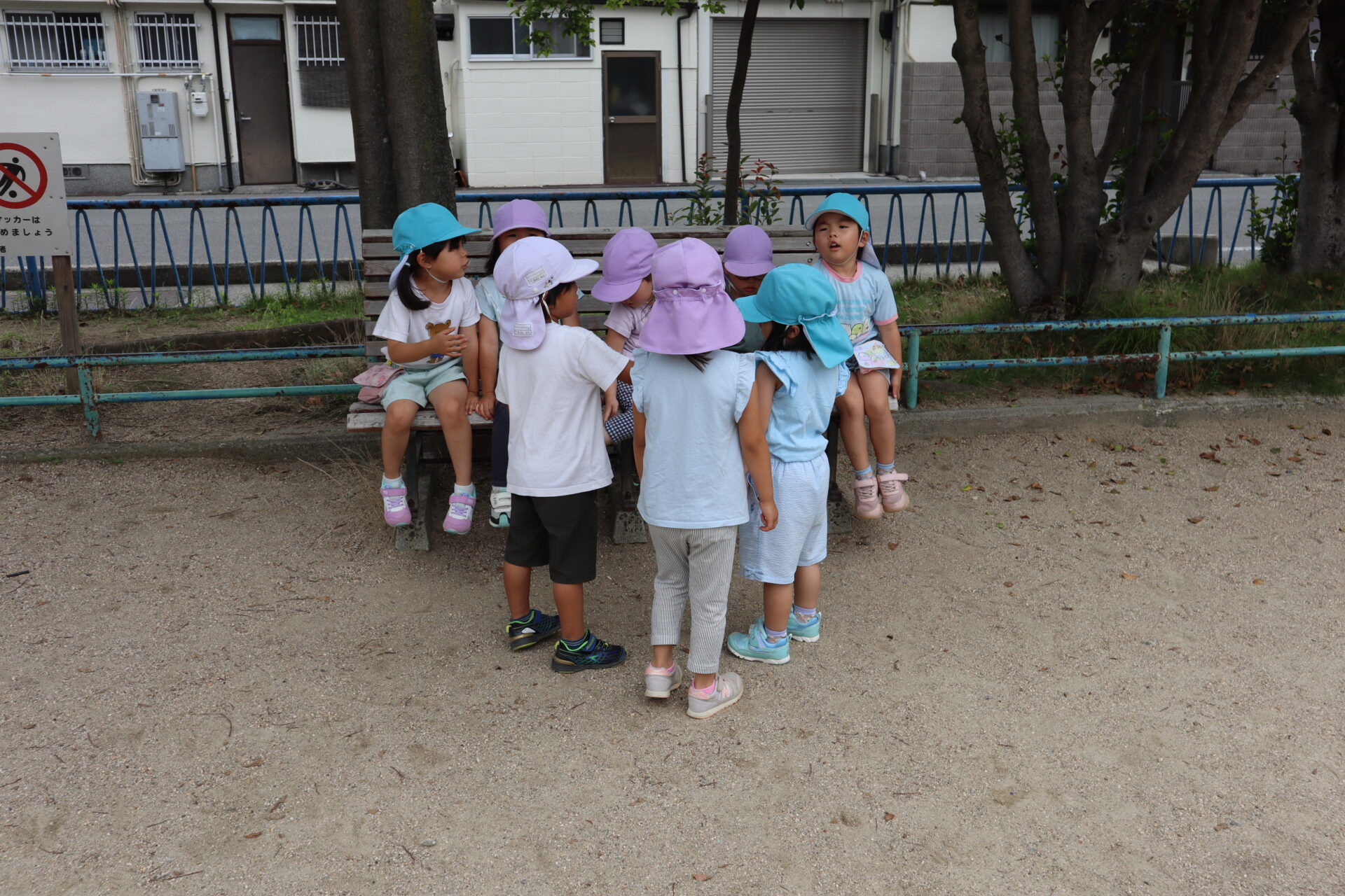 公園に着き、仲良くみんなで椅子に座って保育士の話を聞きます。