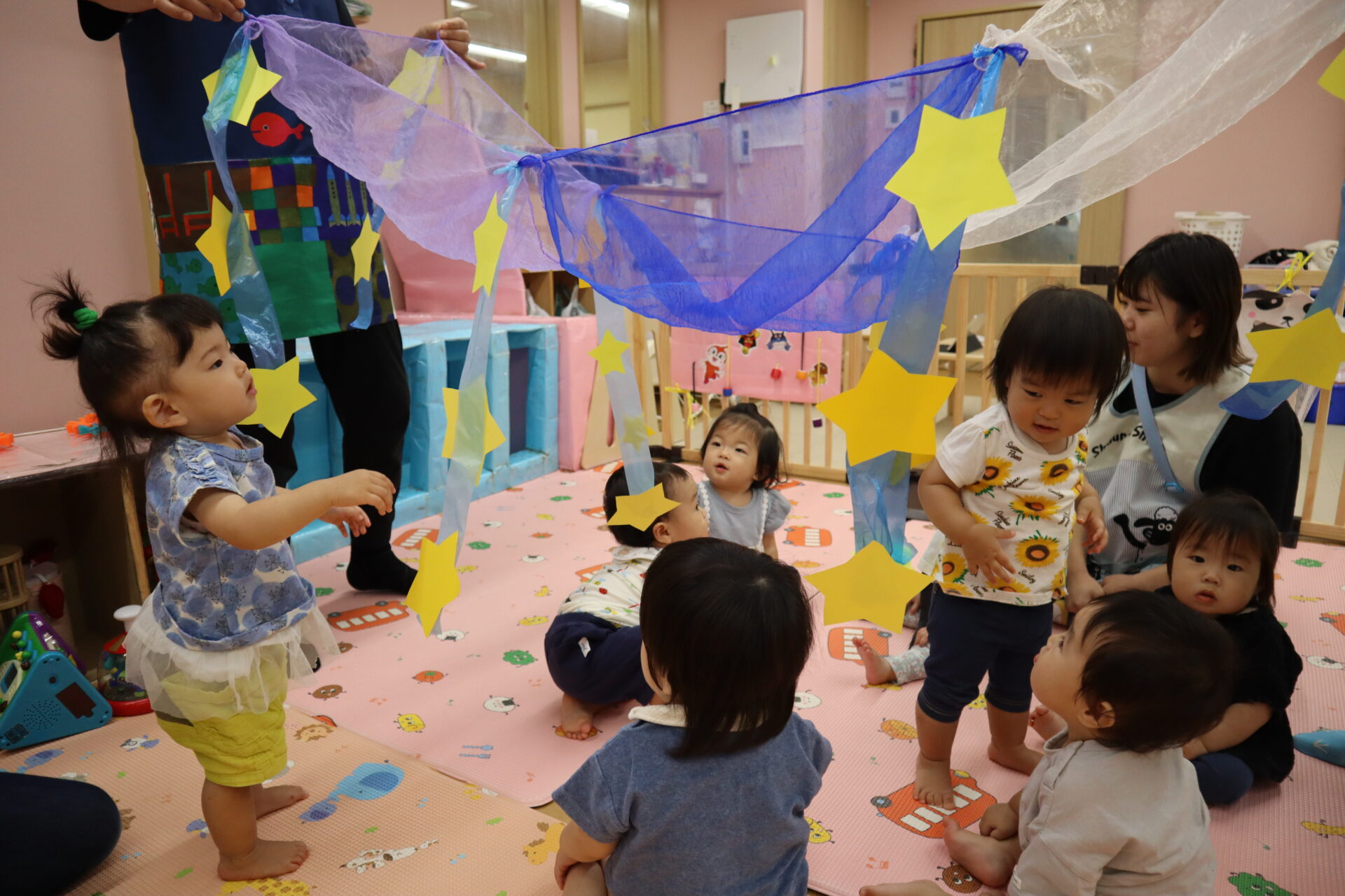 子ども達は、立って手を伸ばして触りに行ったり、保育者がたなばたさまの歌をうたいながら