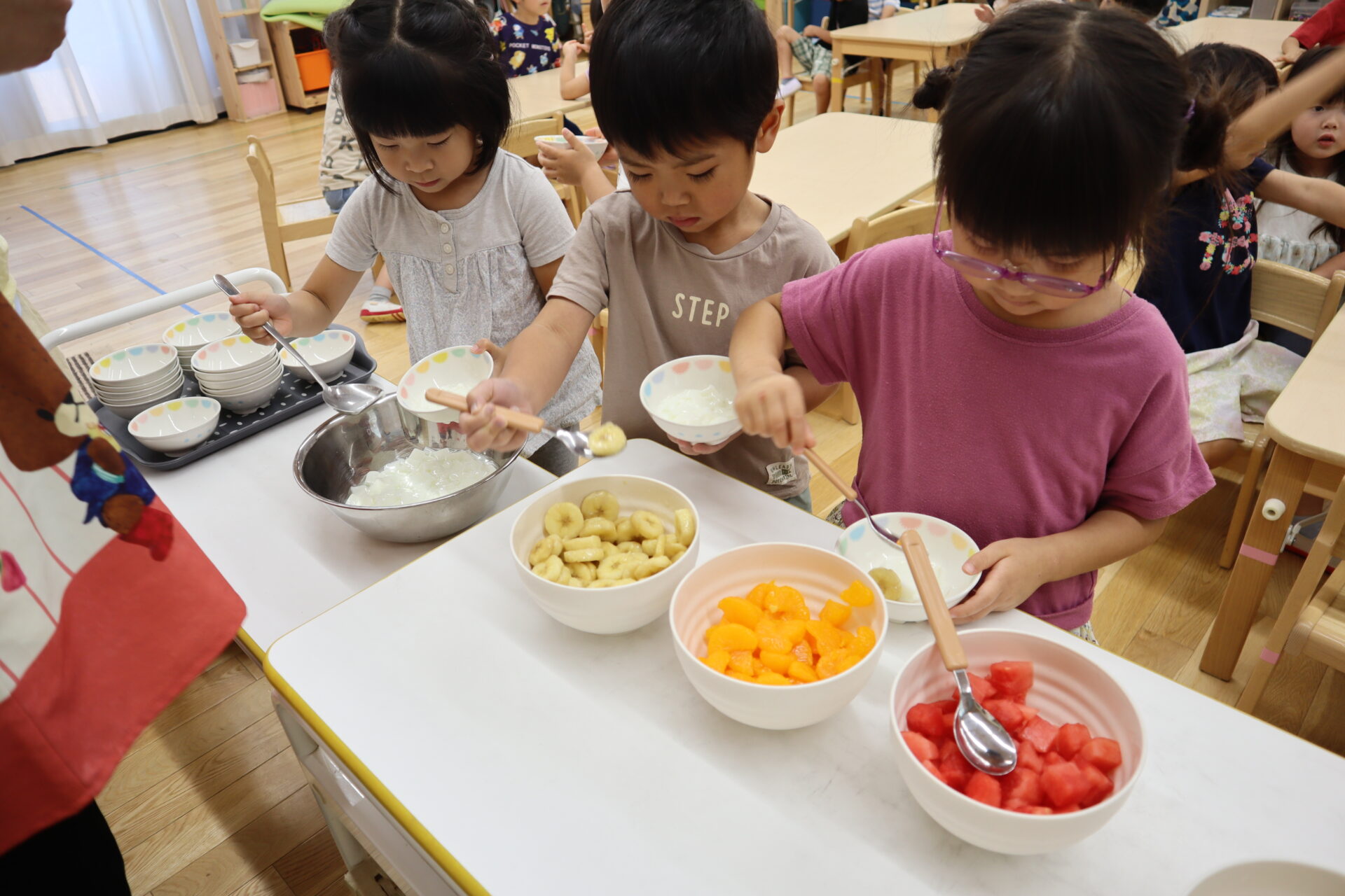 奥の3歳児はお皿・中央の4歳児は木のフライパン・手前の5歳児は木の大き目スプーンです。
