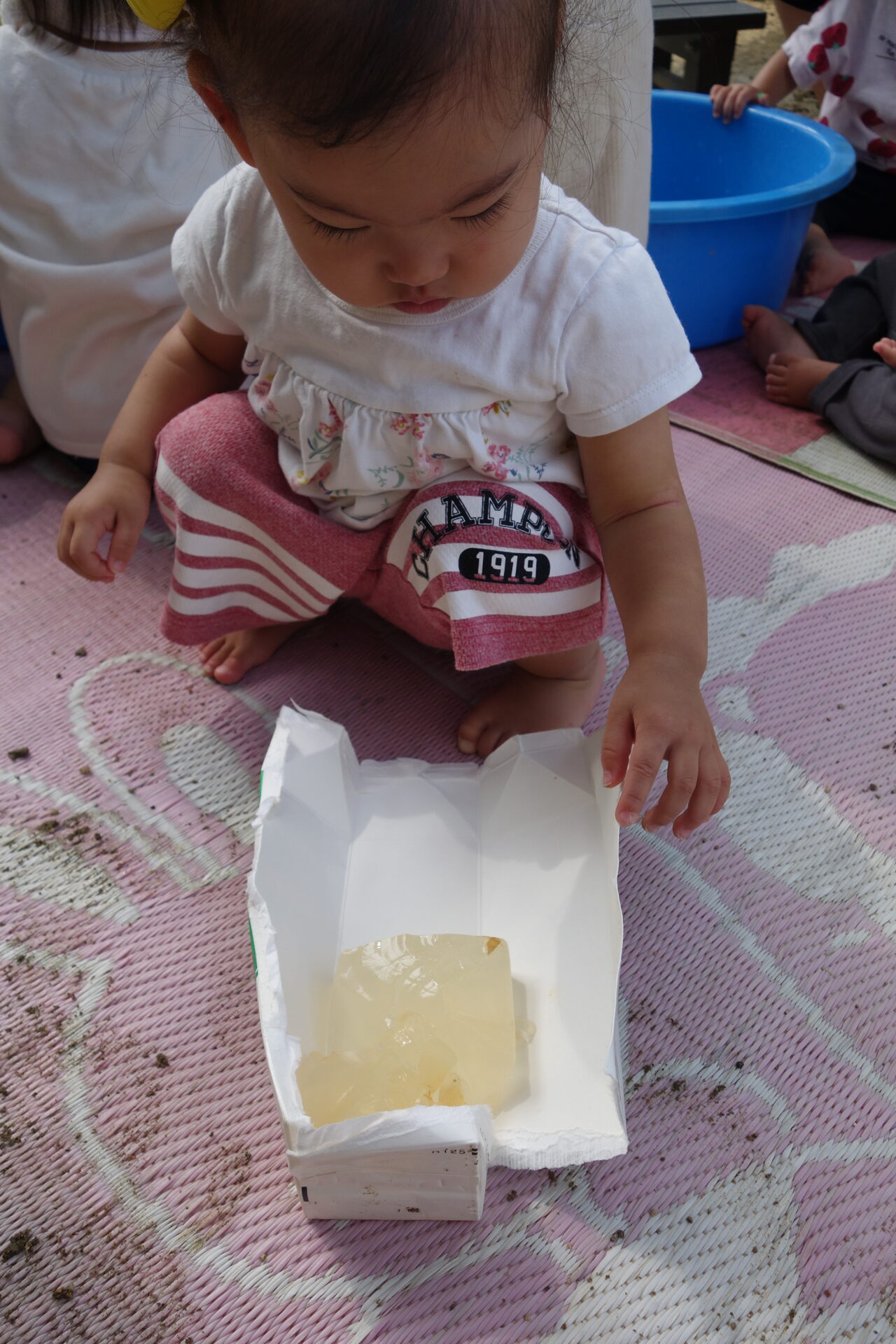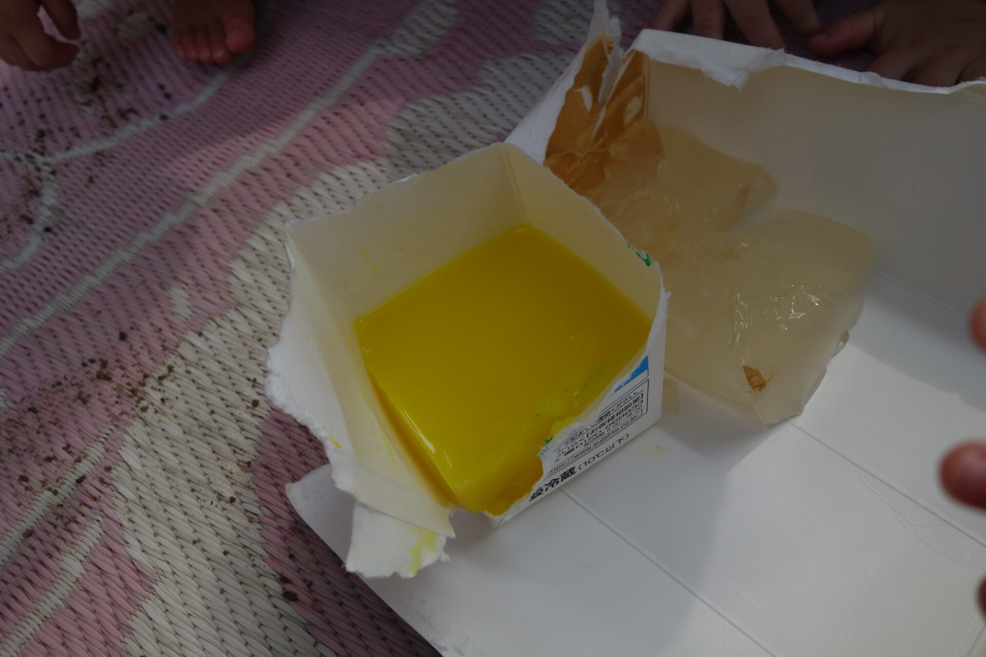 今日は色水をゼラチンで固めた色水ゼリーを使って遊びました。