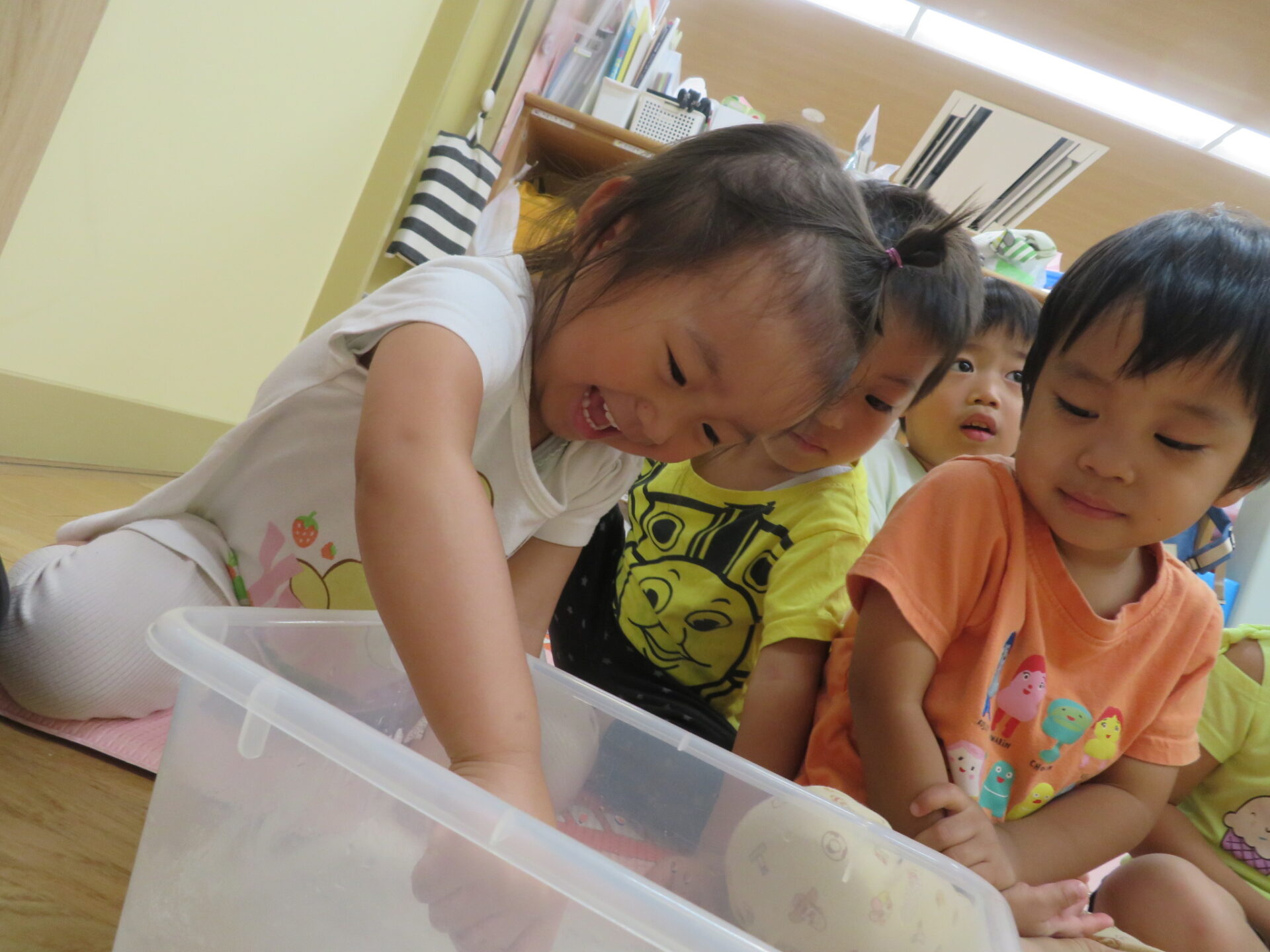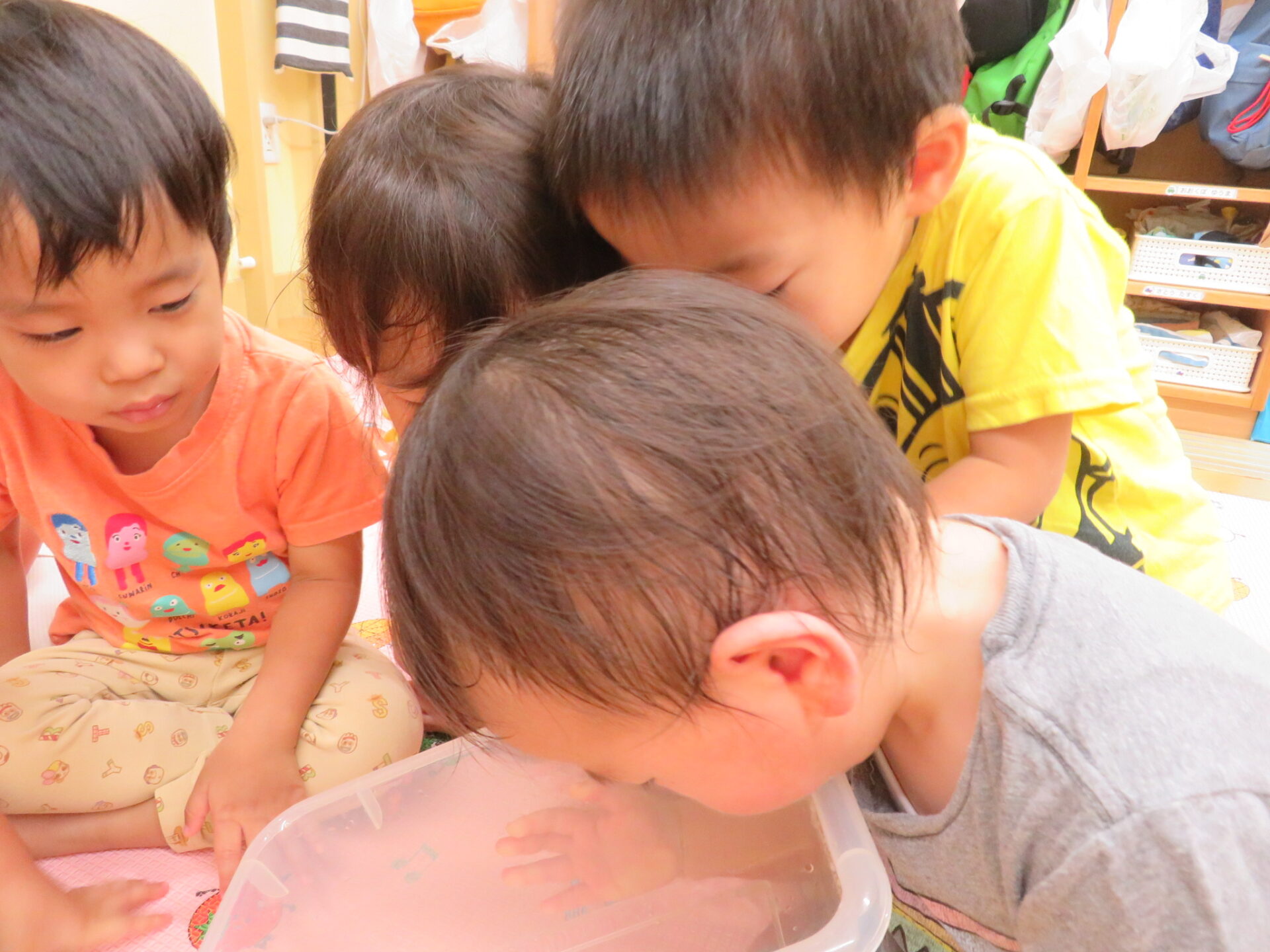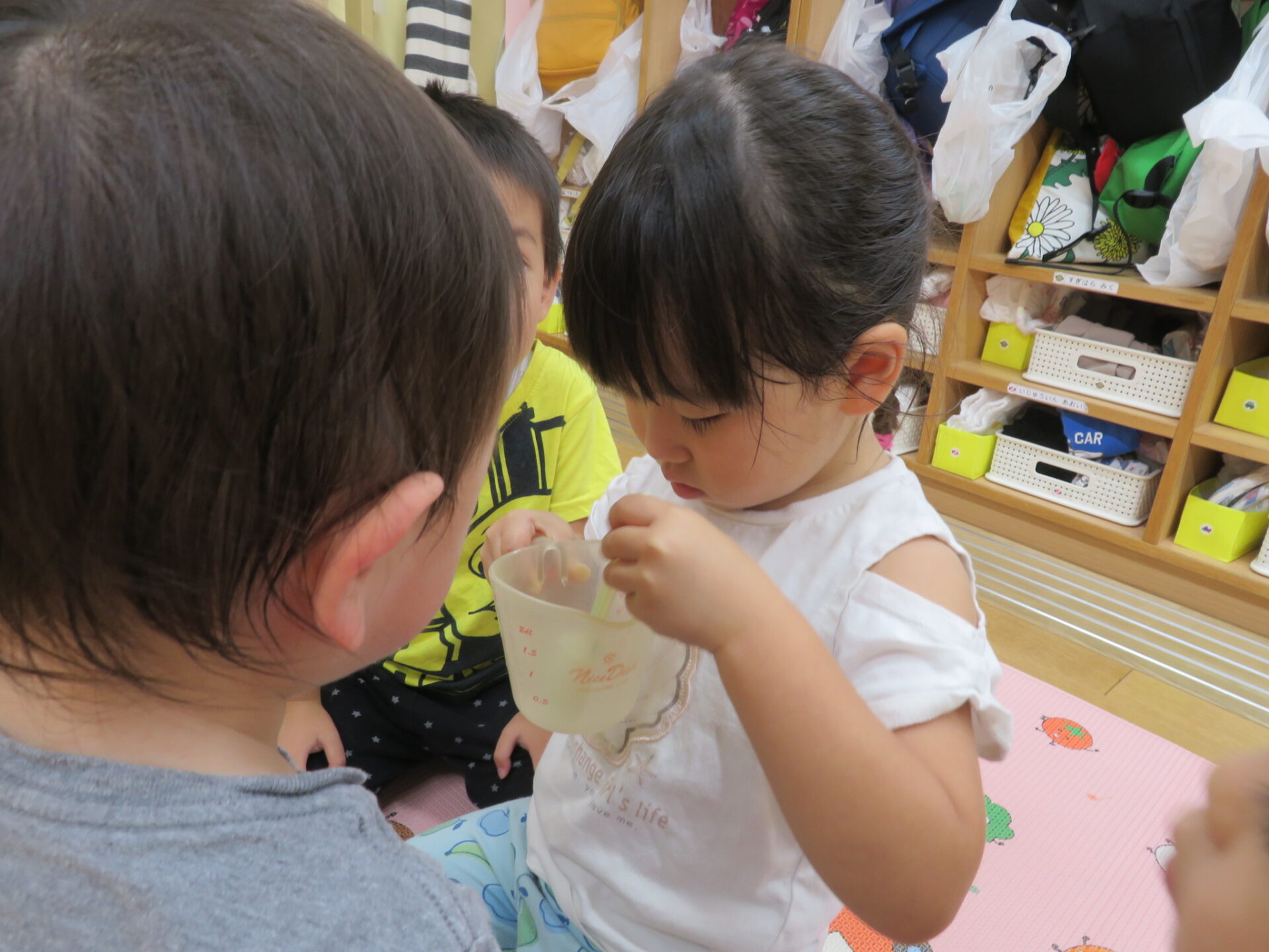 全て容器に移し終ると、、「それどんな匂いなん?」と子どもたちが興味を持ち始めました。なんでも直ぐに匂いを嗅ぎたくなるあめ組の子どもです☺