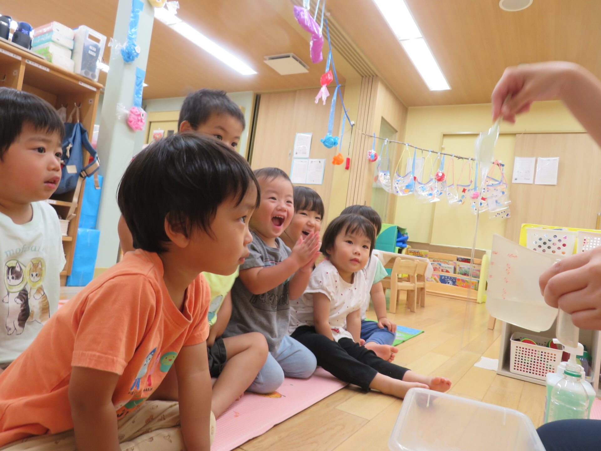 まず洗濯のりを容器に入れました。とろとろっとした見た目に目をキラキラさせながらときめく子どもたち。保育者は「洗濯のりは服をピシッときれいに伸ばすものなんだよ」と説明しました。