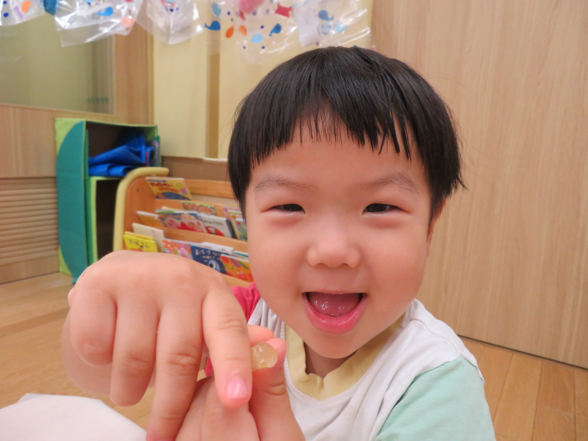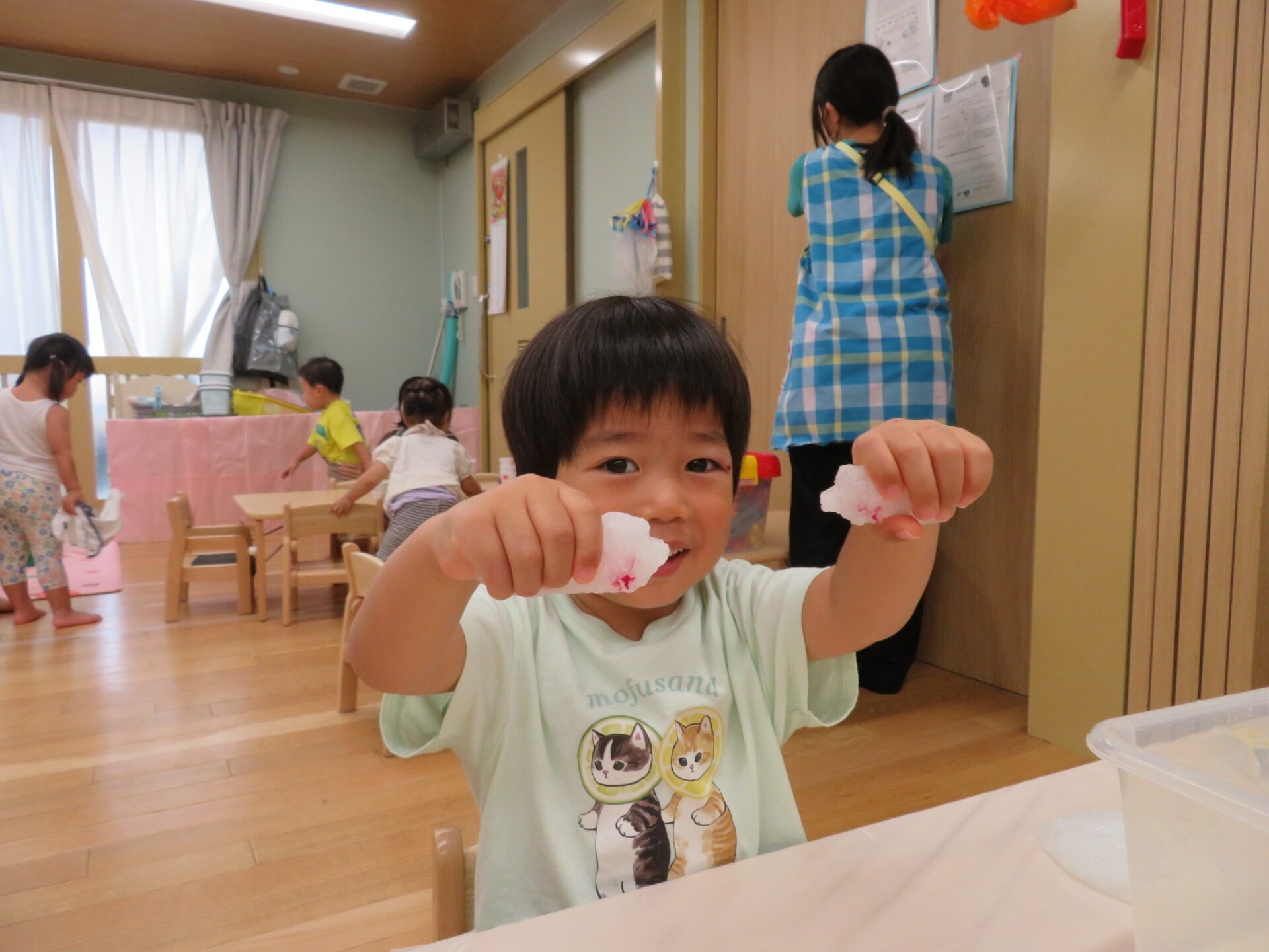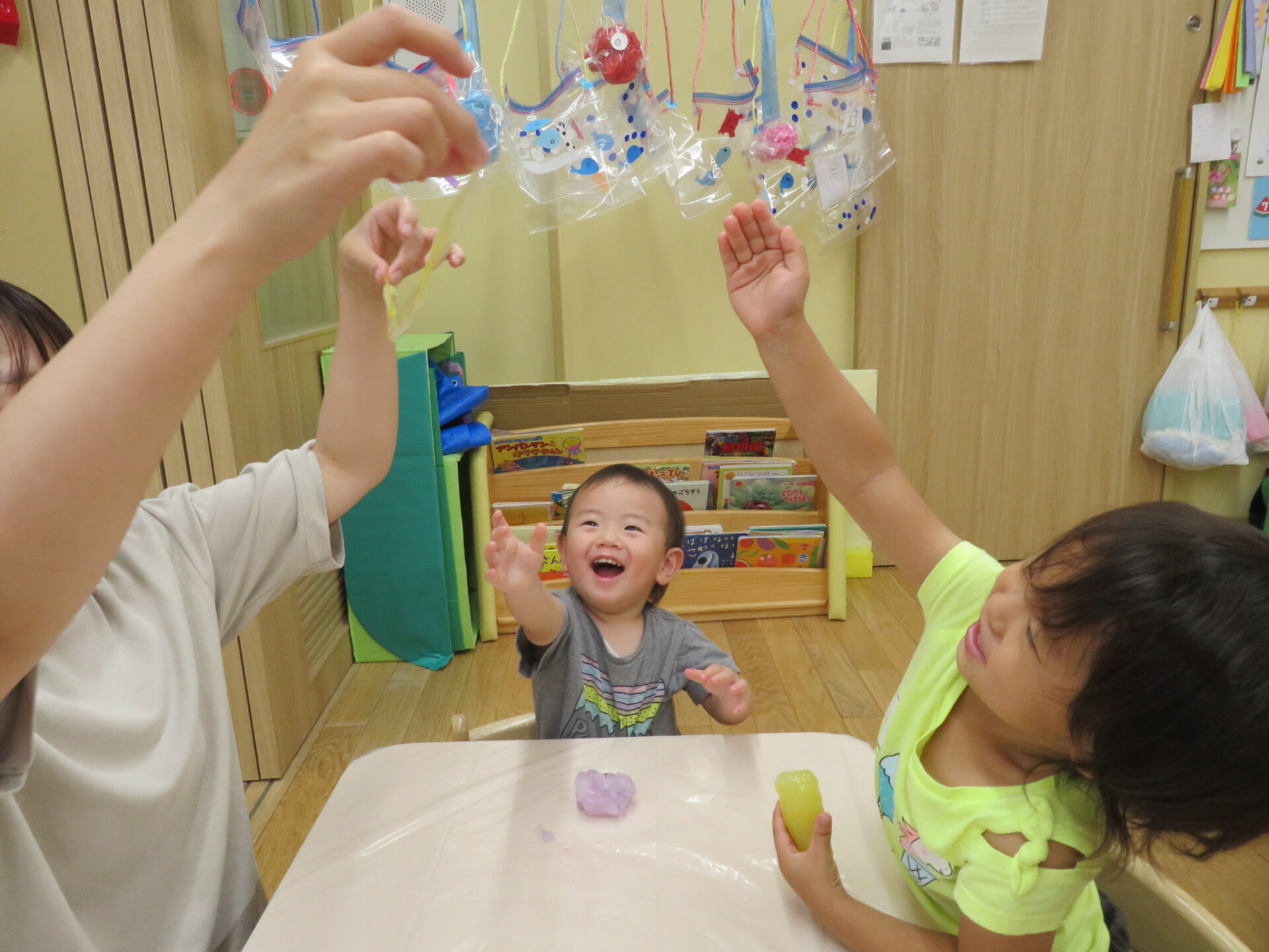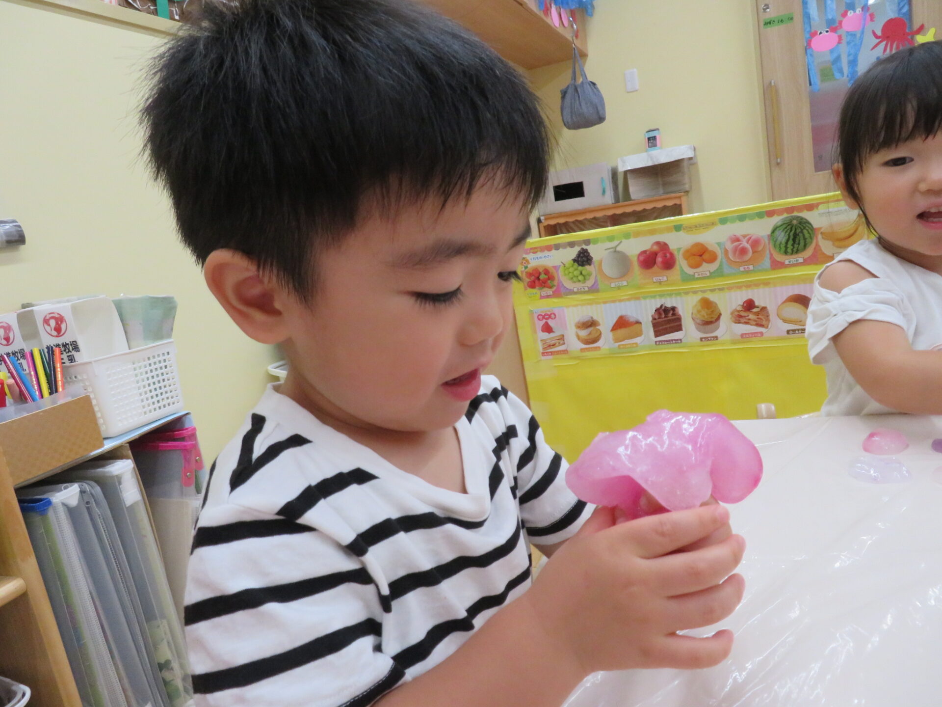 硬めのスライムなので形を自由自在に変えられ見立て遊びが次々と始まりました。手の体温によってと硬さや光沢が変わっていて面白い変化でした。
