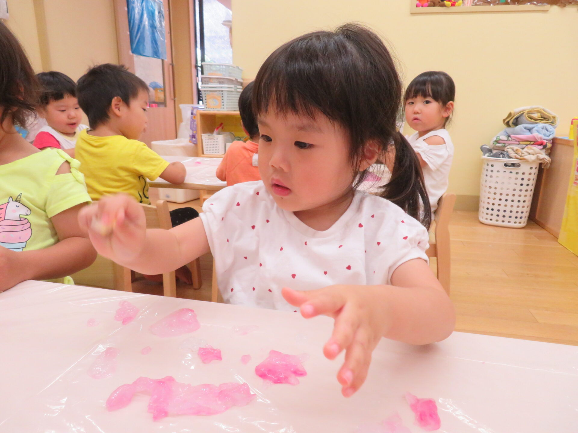 今回のスライム遊びでは手の感触だけでなく、耳で感じる音や目で見て楽しんだりと五感を刺激するいい経験となりました。次はどんな感覚に触れようかな。