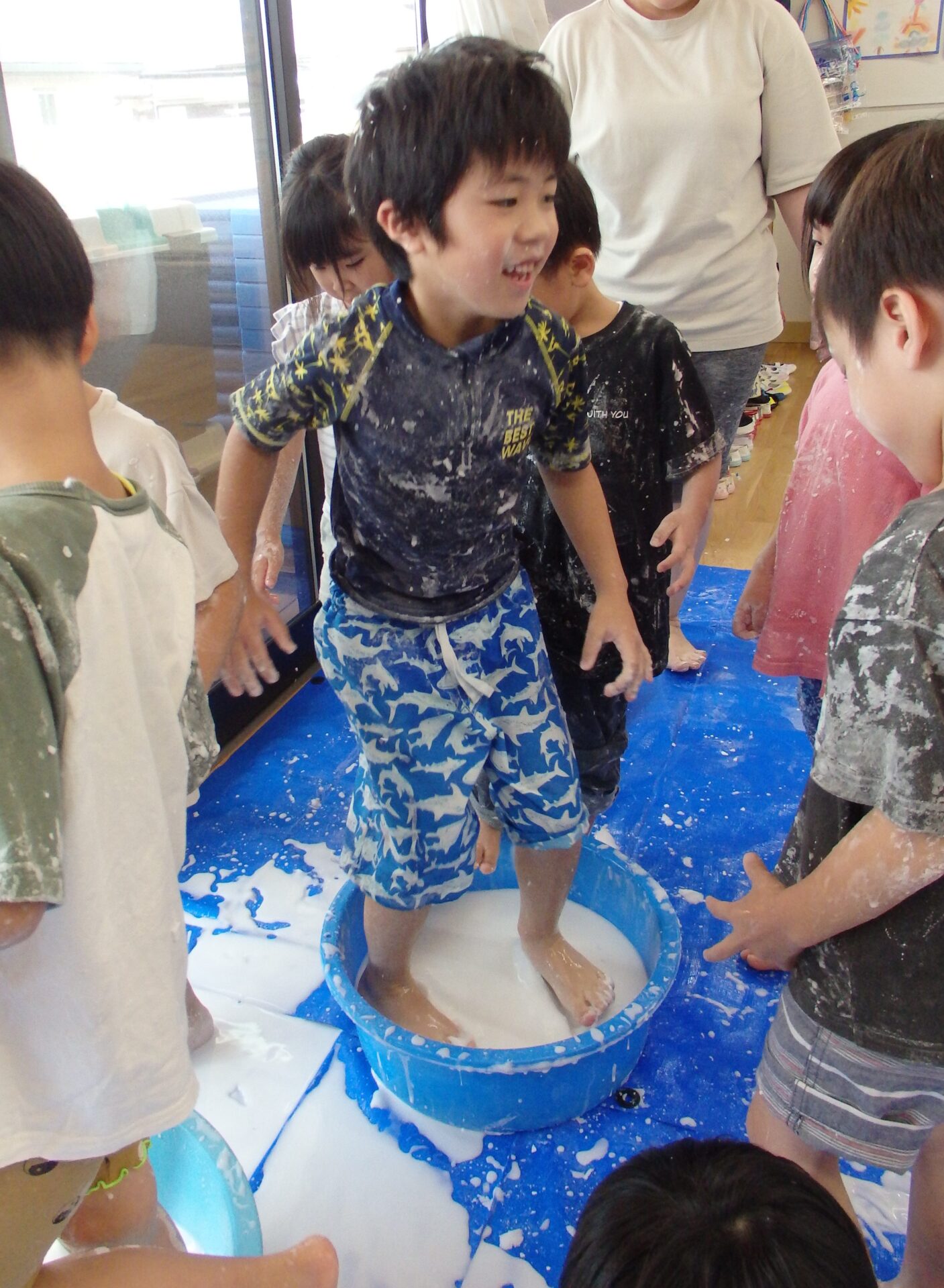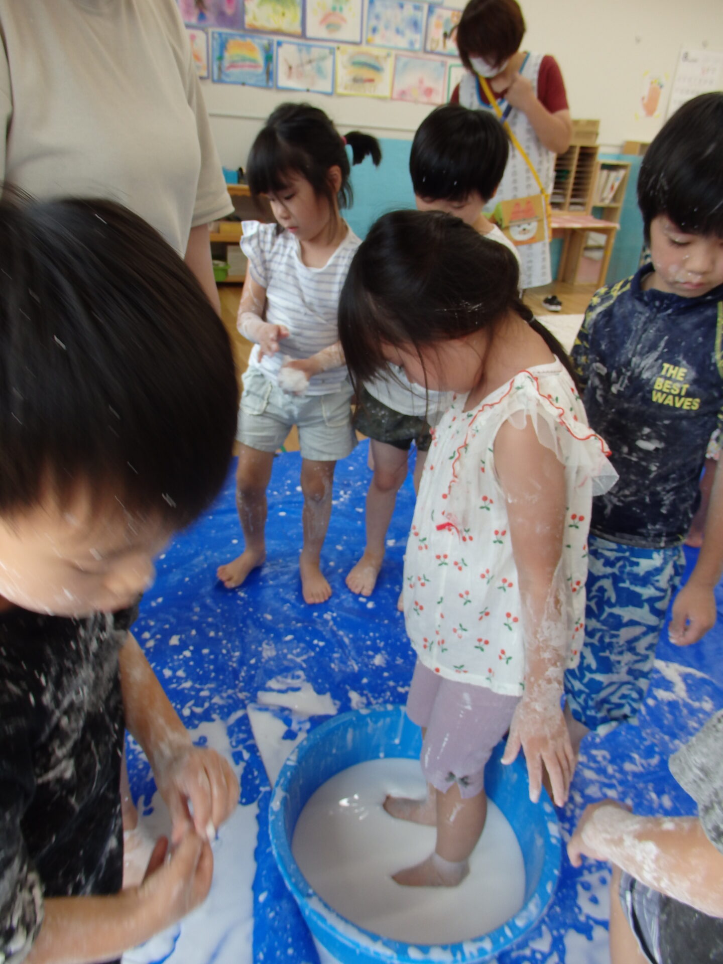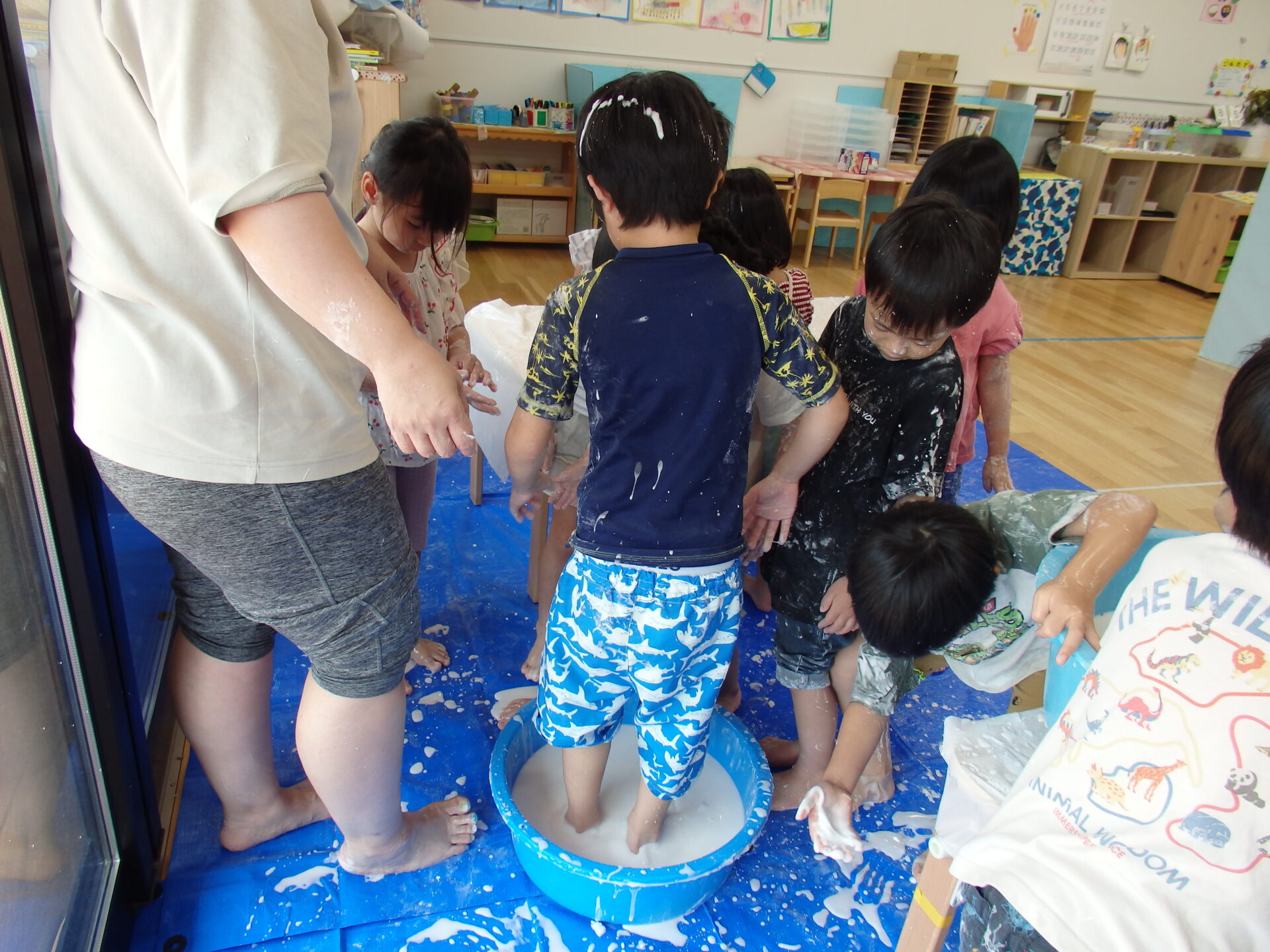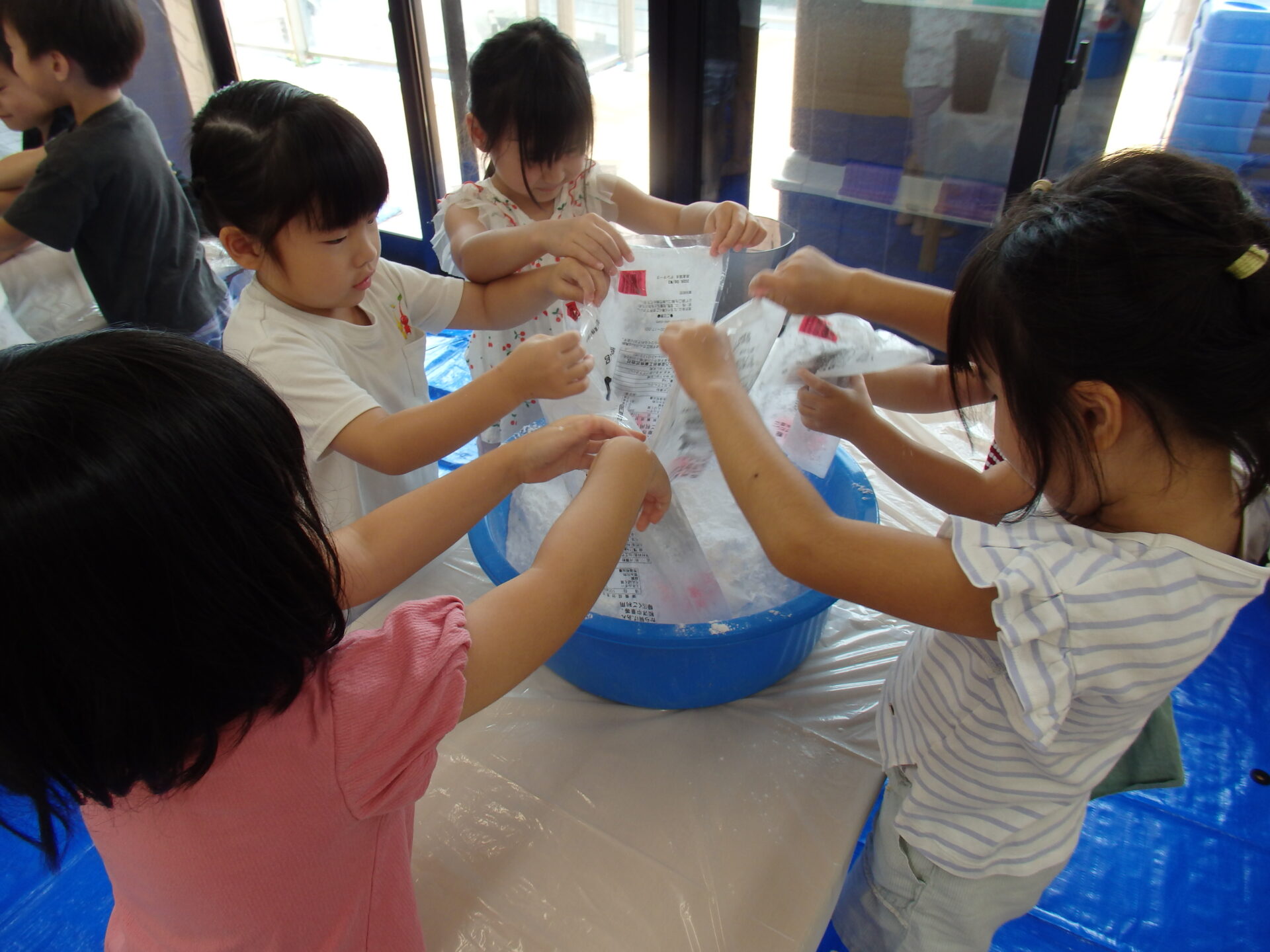 様々な夏の遊びを楽しんでいるくじら組さんですが、今月は様々な実験にも挑戦しています。