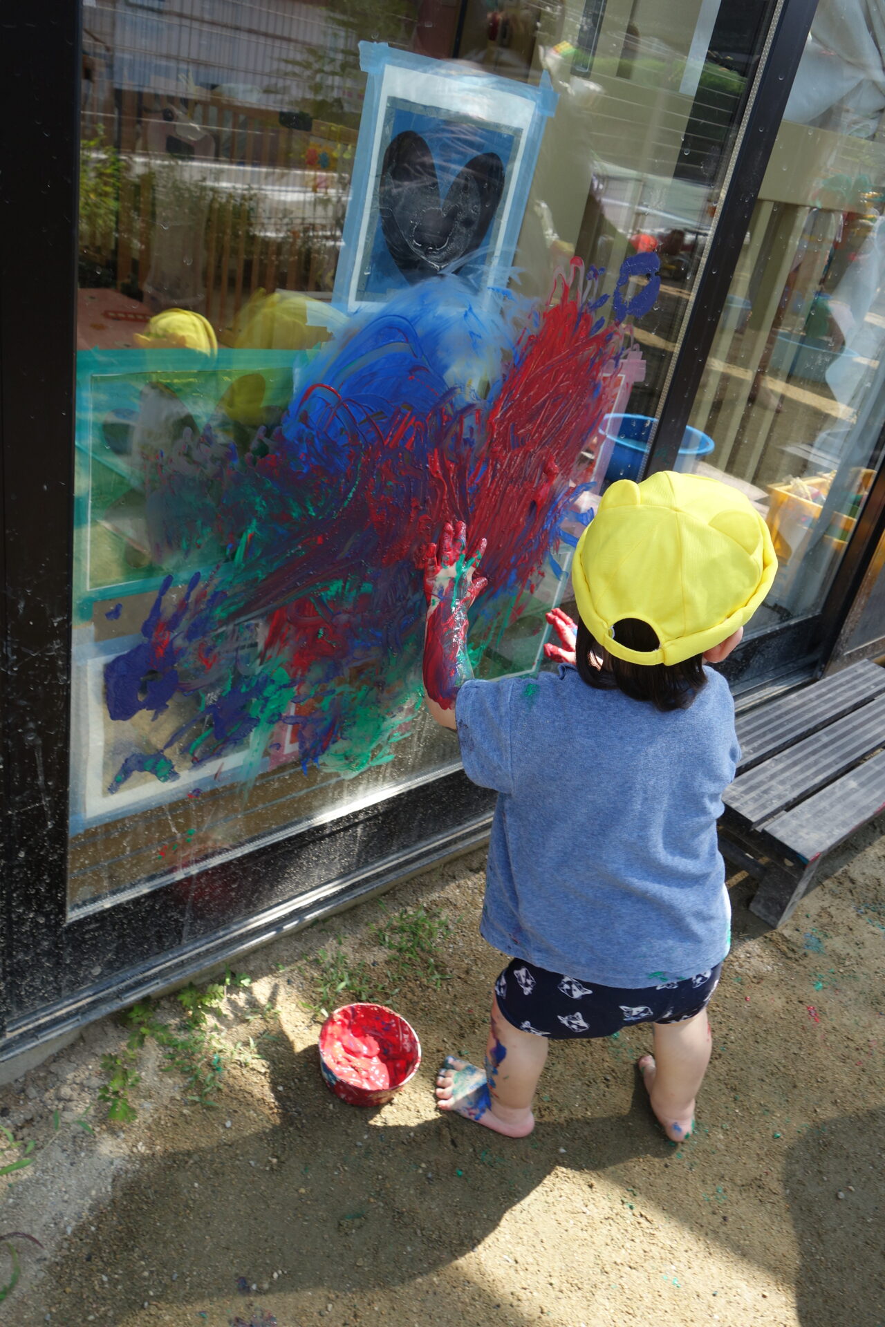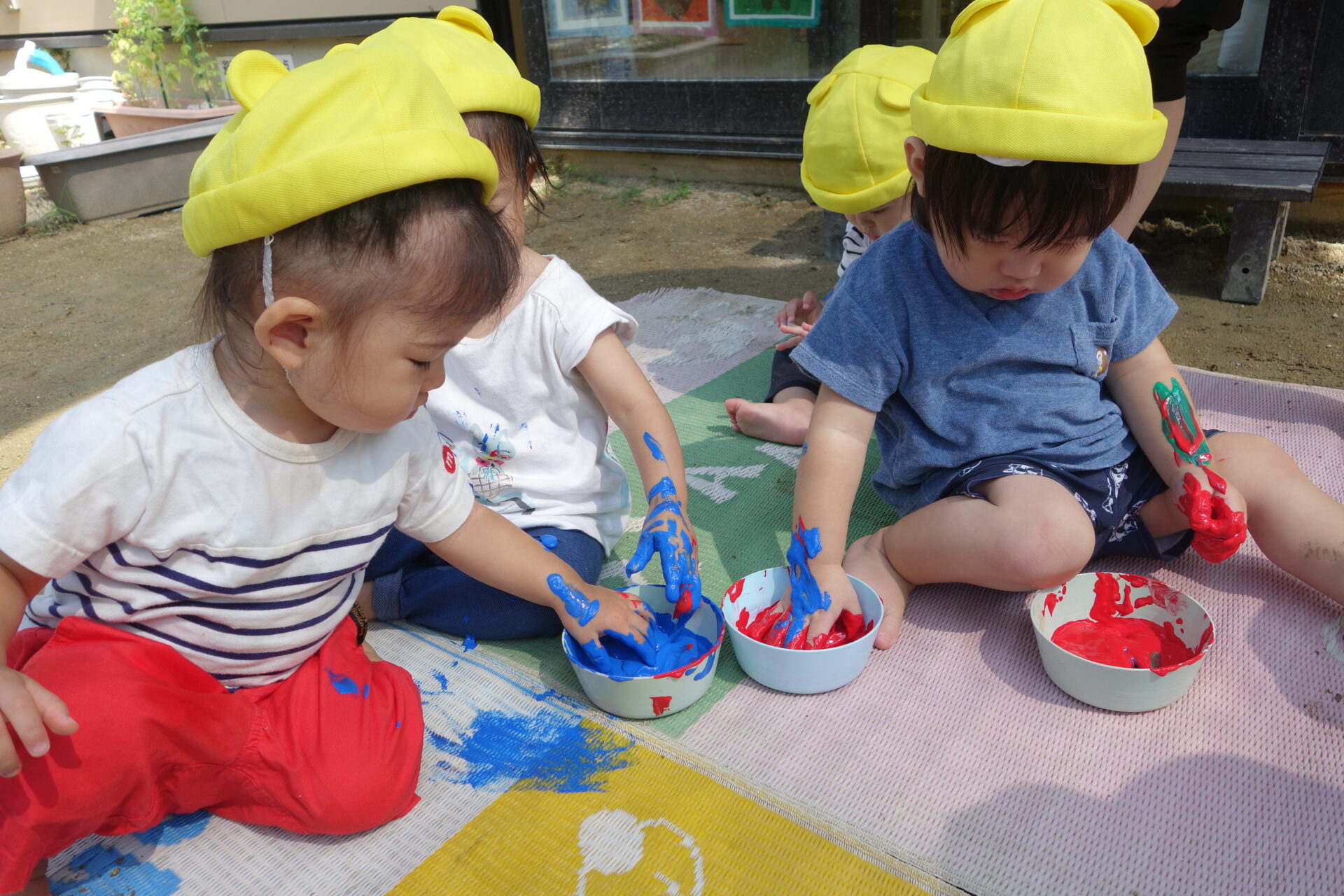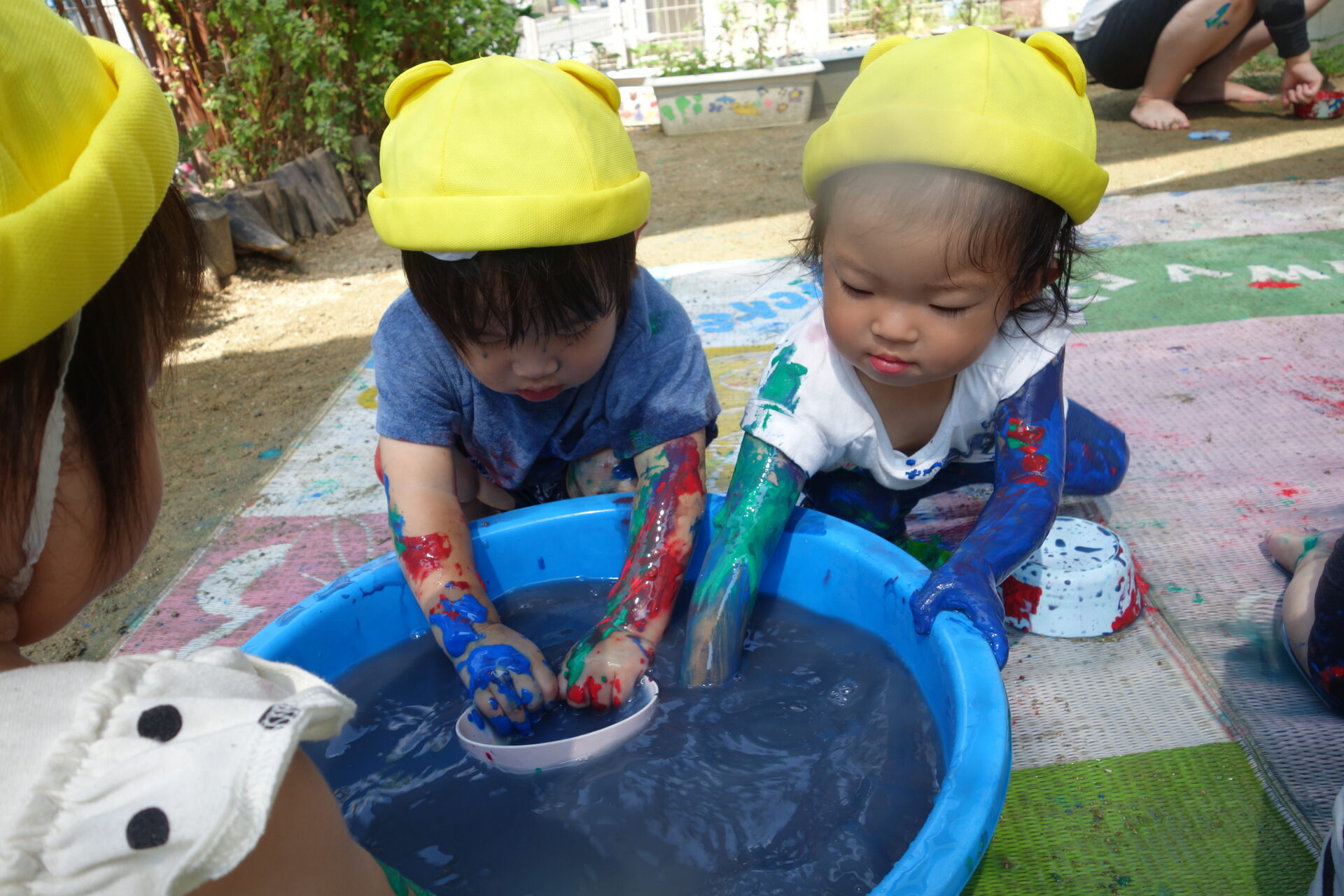 子どもたちの側に置いてあげるとすぐに手に絵の具を付けて遊び始めていました。
