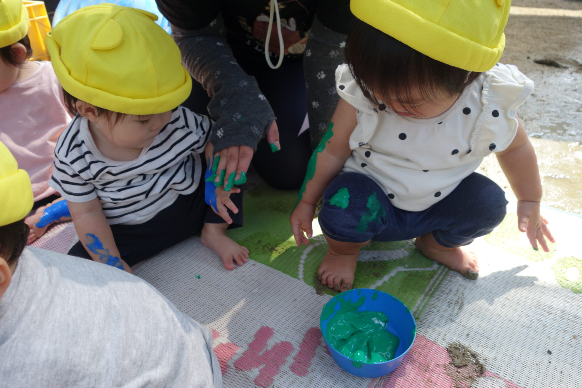 汚れることがちょっと苦手なお友だちもいますが、保育士に体に塗ってもらうと慣れて、自分でも触りはじめていました。