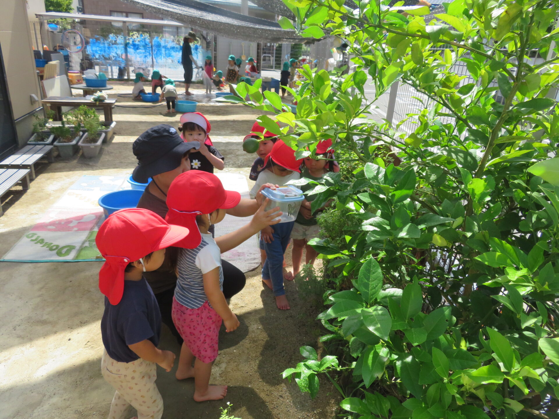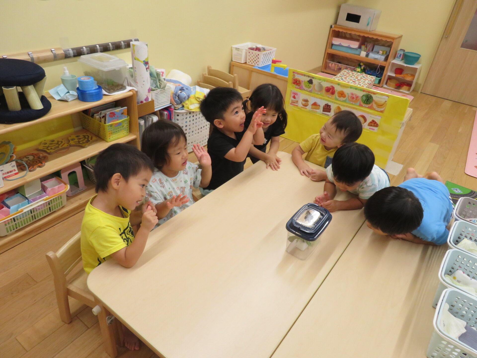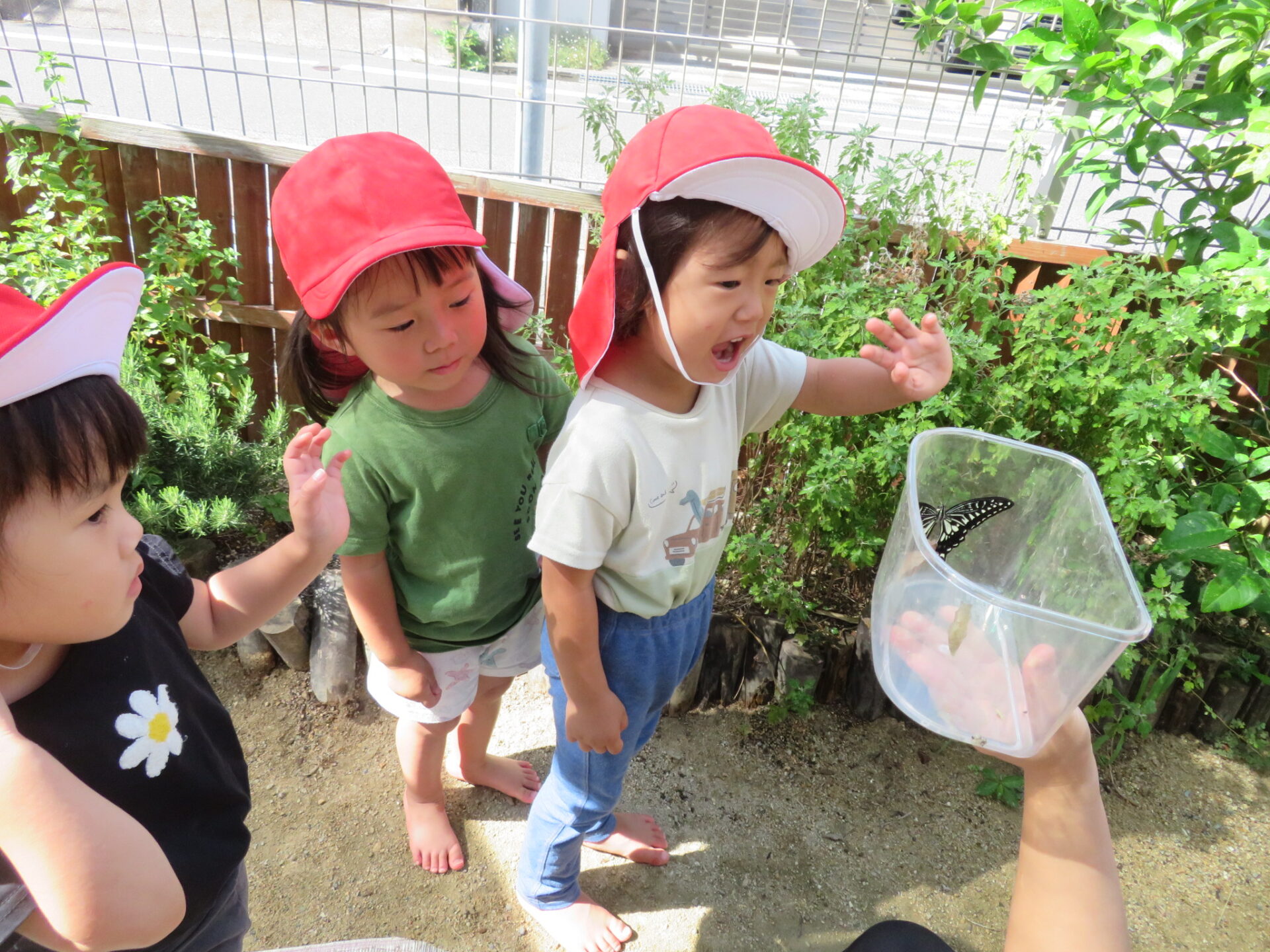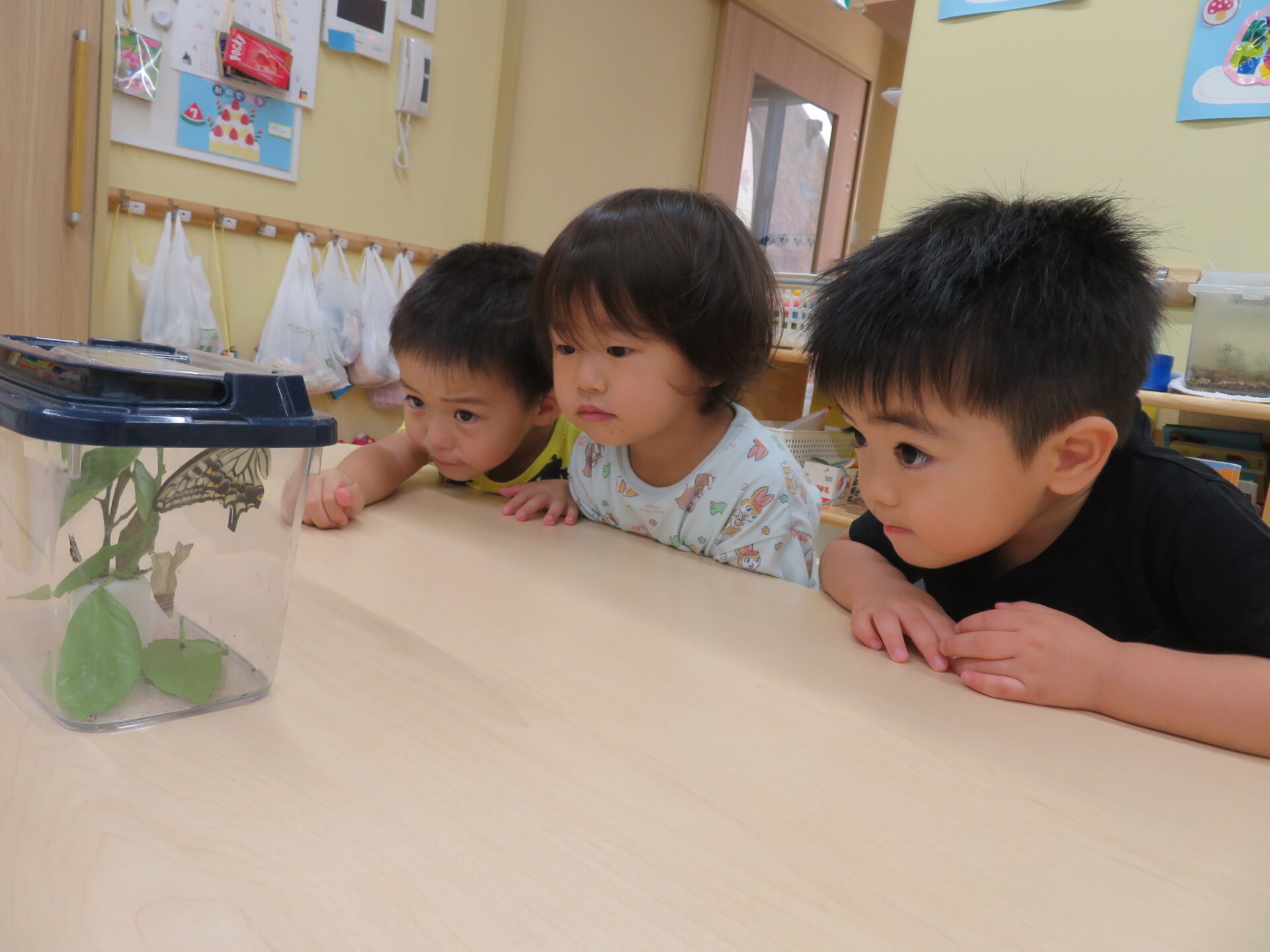 「次は、何色の羽かな〜?」と、アゲハ蝶の成長を楽しみにしている2歳児の子ども達です!