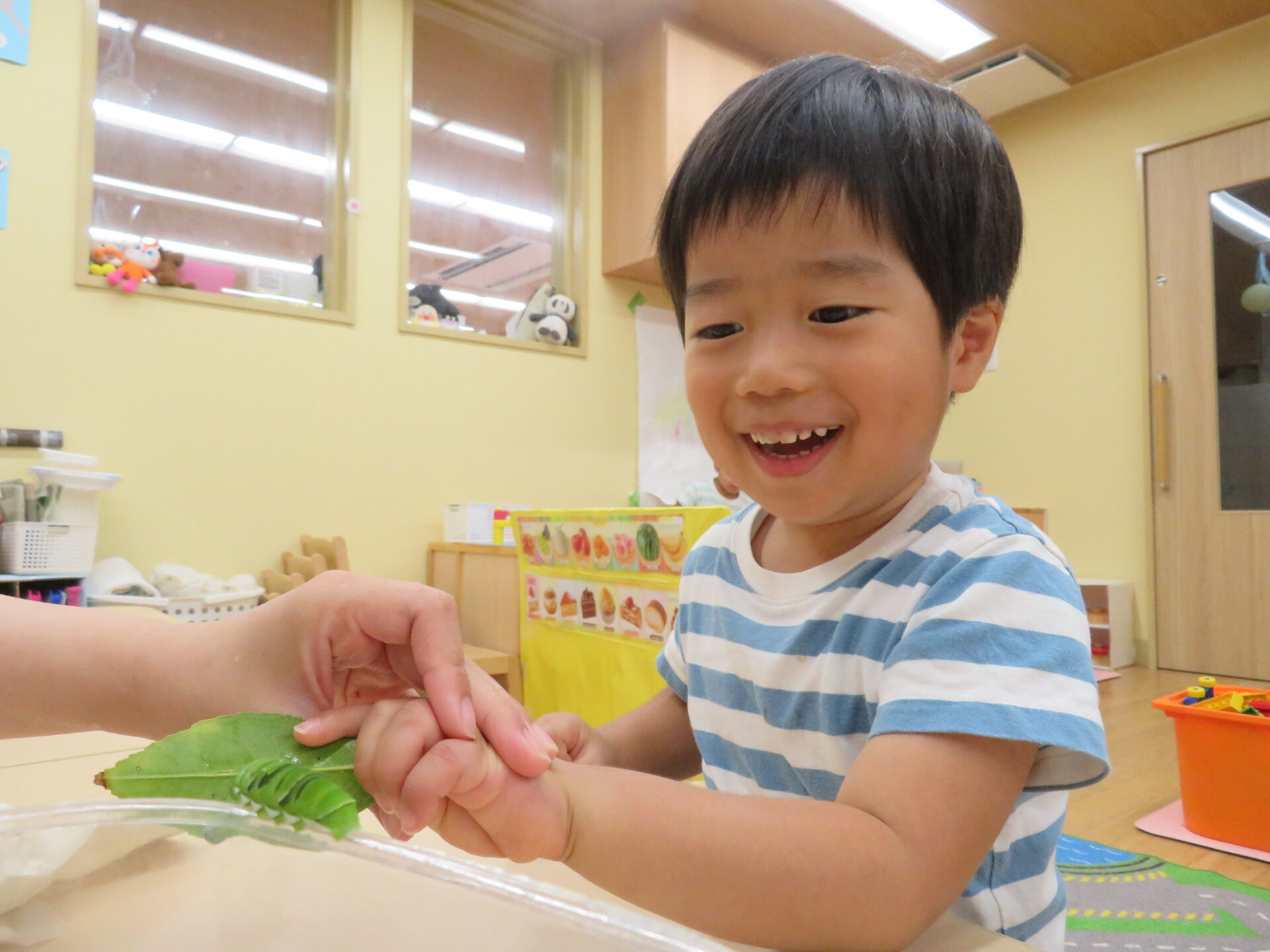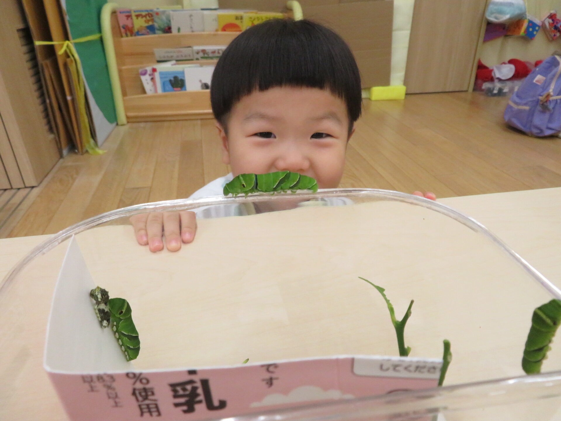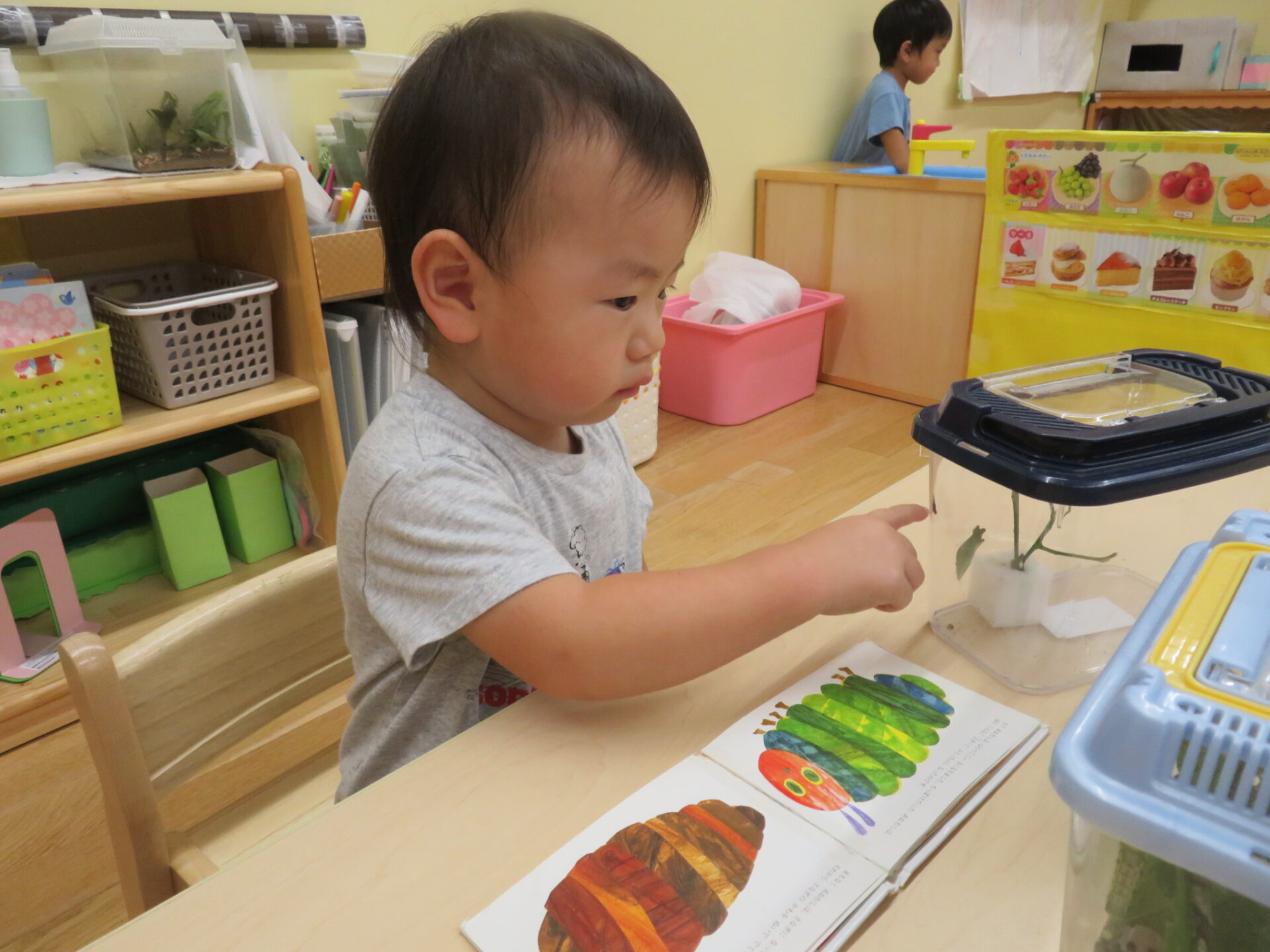 『はらぺこあおむし』の絵本をケースの近くに持ってくると、「一緒!」と保育者に教えてくれました。