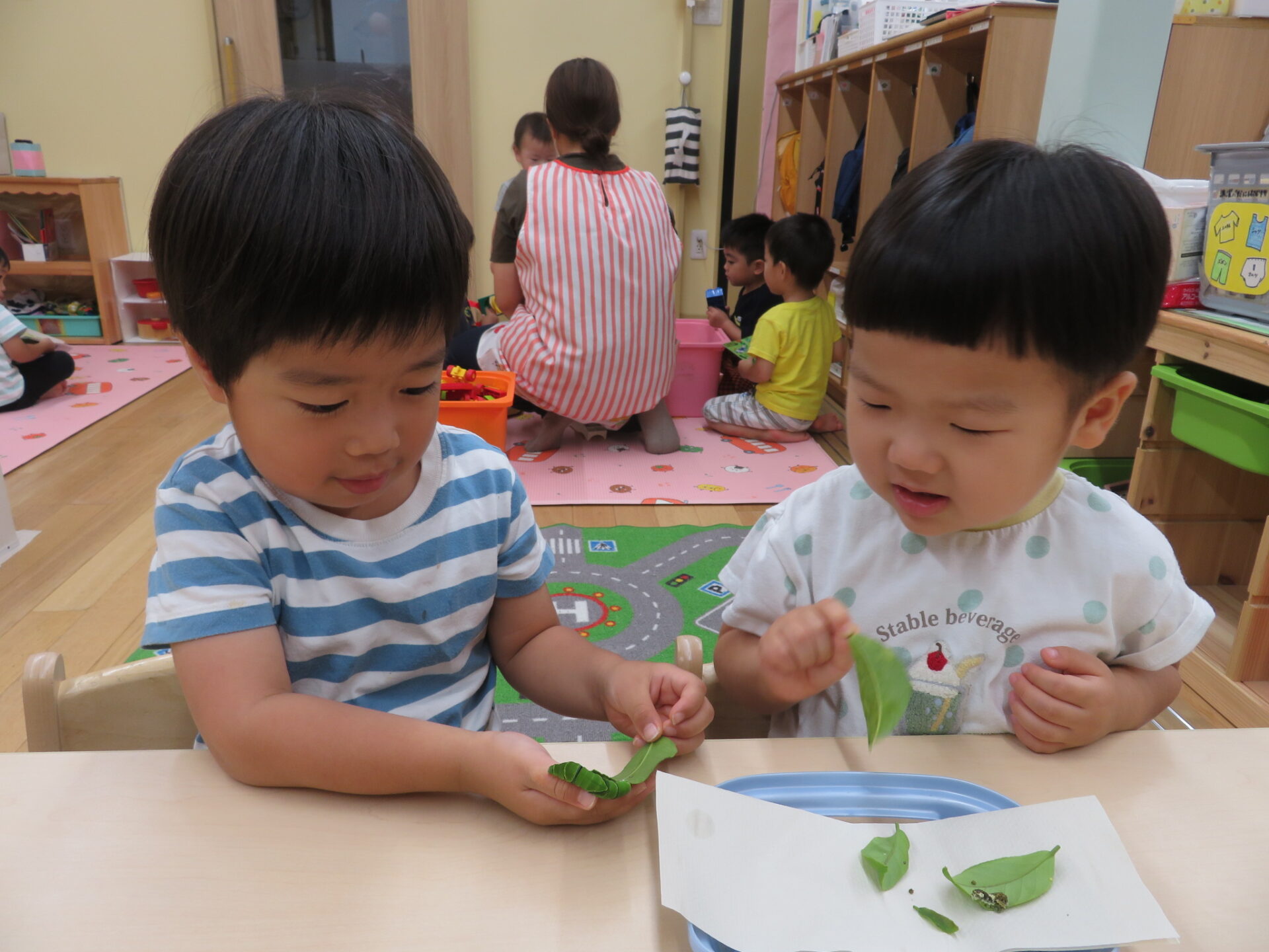 ゆっくり移動してくる青虫に、お友だちと喜びを共有していました。