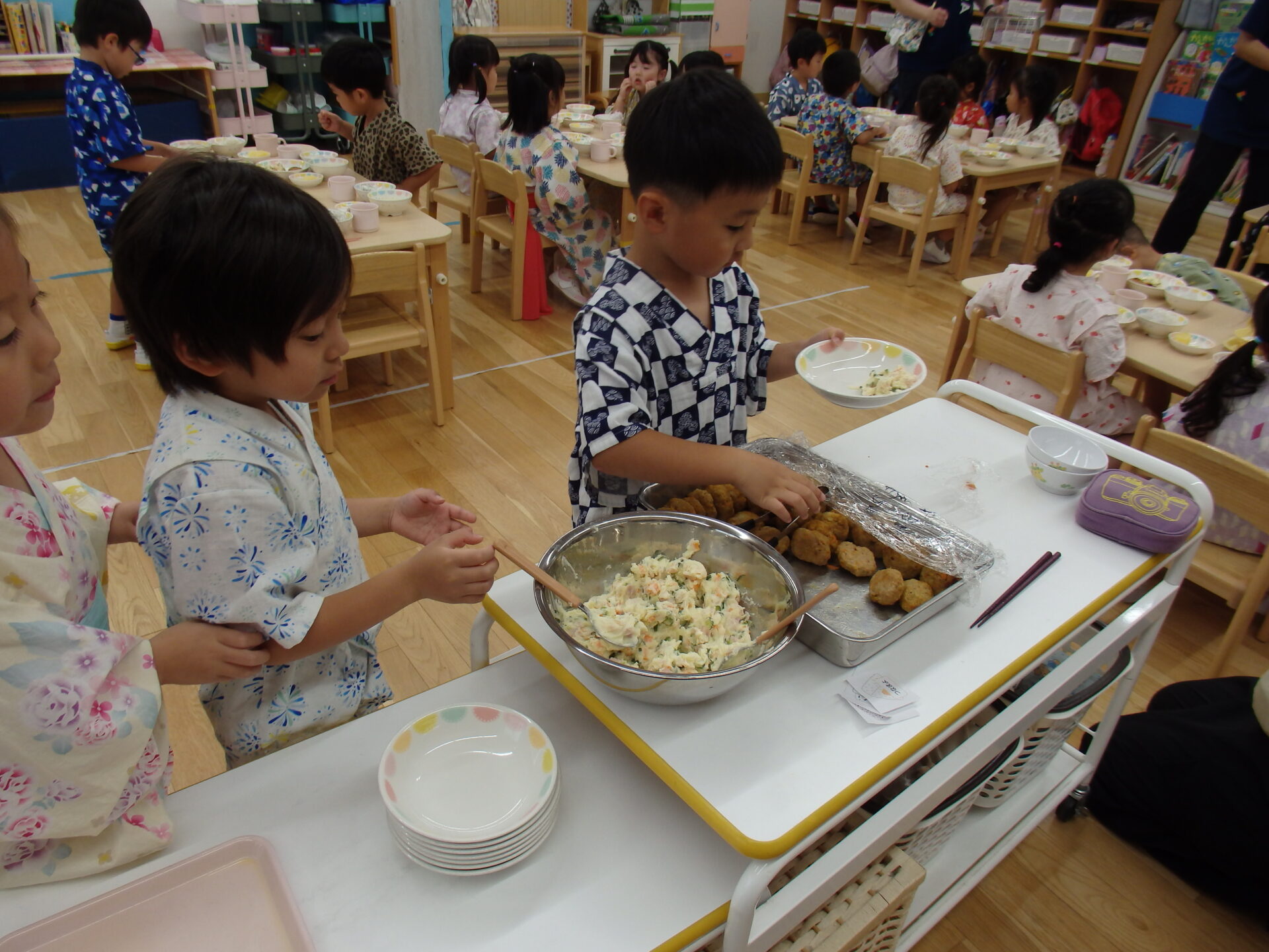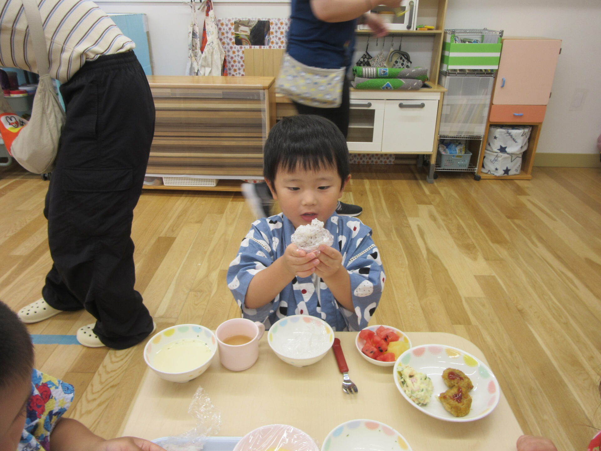 この日はハンバーグやコーンスープなど、大好きなメニューをリクエストしてそれをバイキング形式でいただきます。