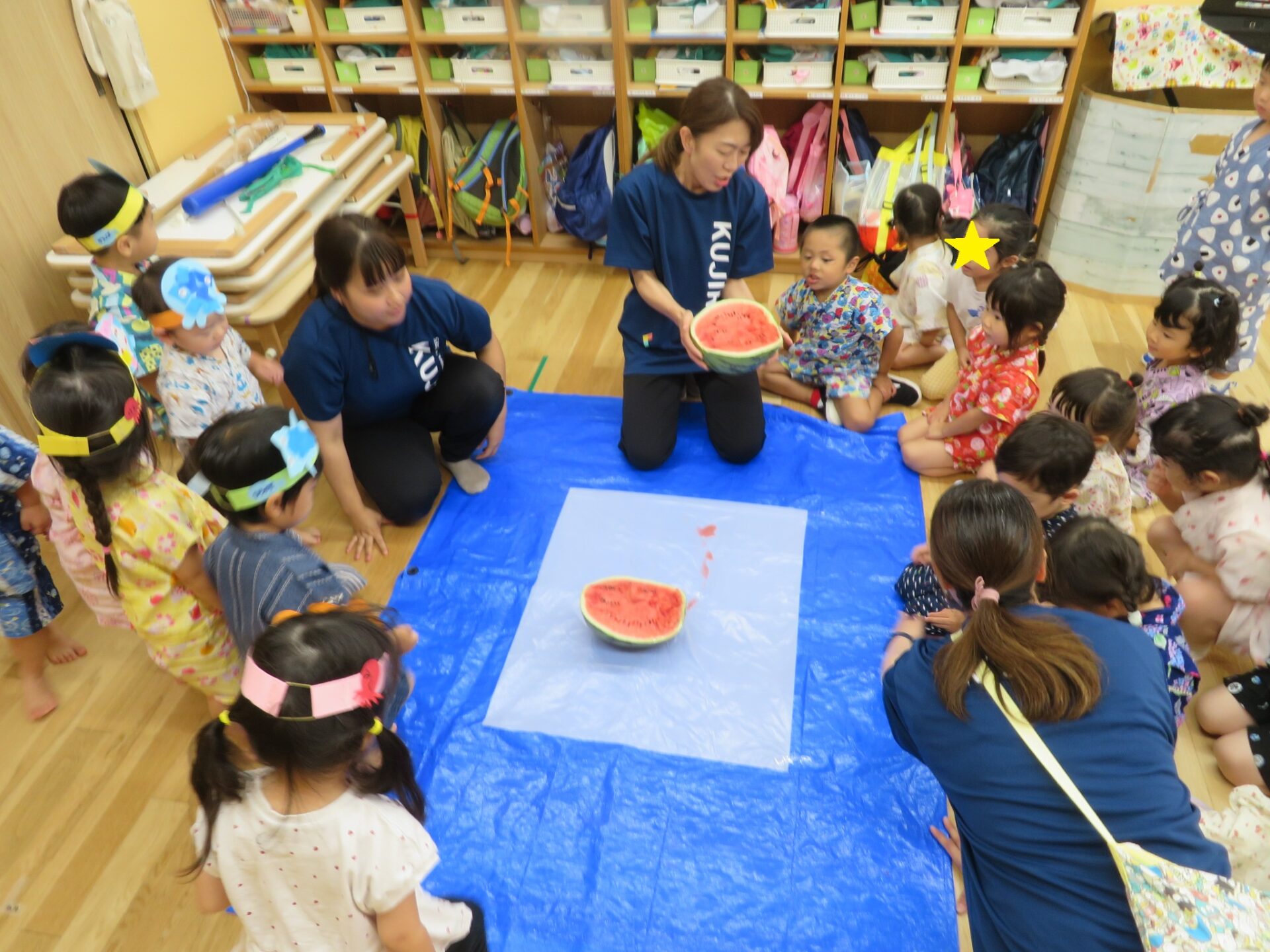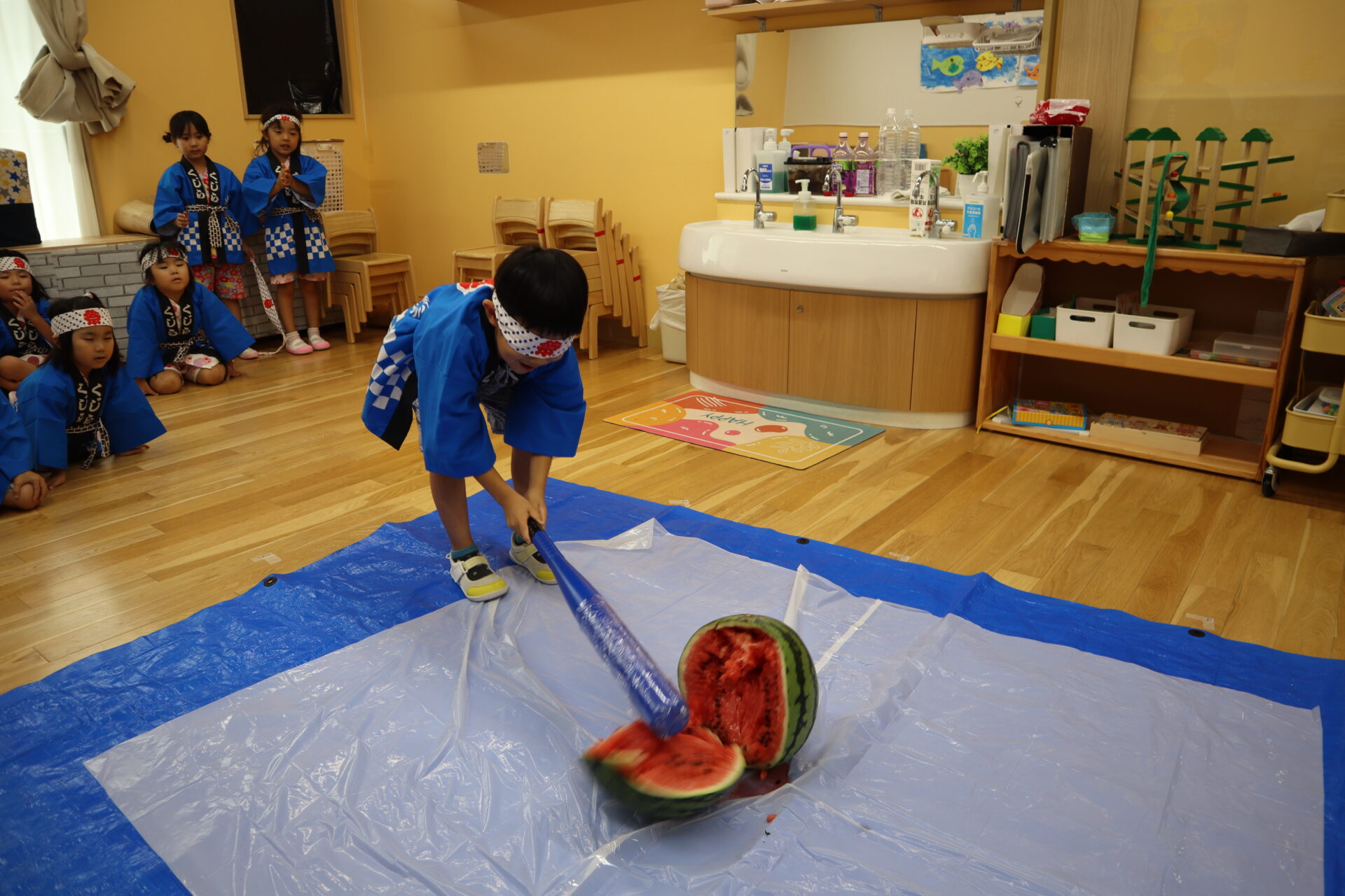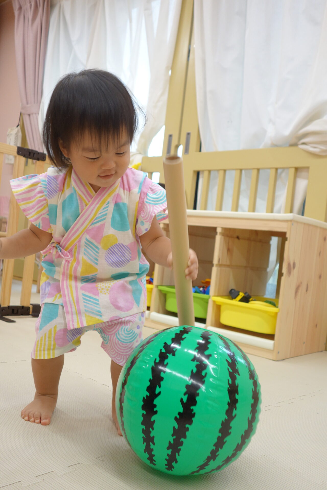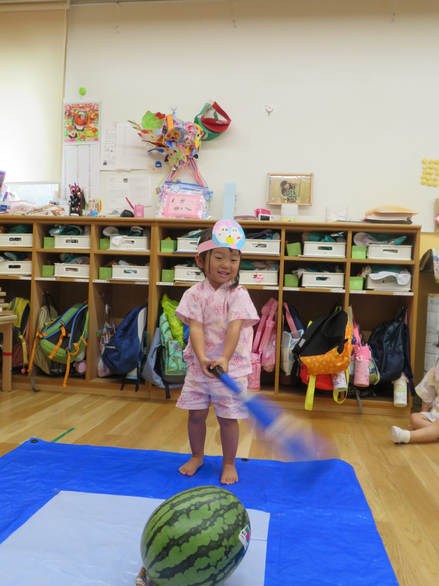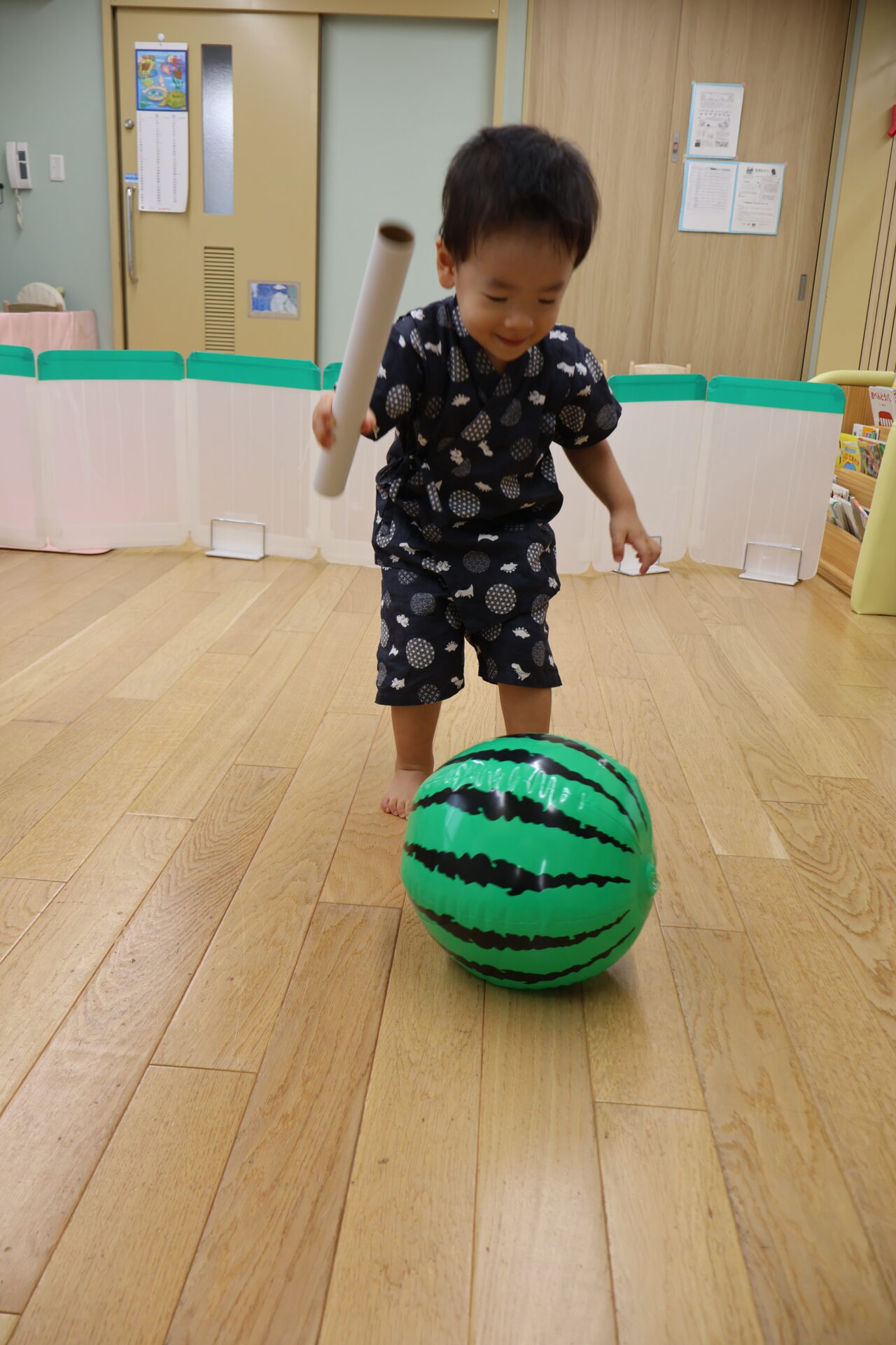 うみ組・だいち組(0歳児・1歳児)では、毎年スイカのビーチボールを使った「なんちゃってスイカ割」を楽しみます♪今年も上手にスイカめがけてパチンと出来ていました!