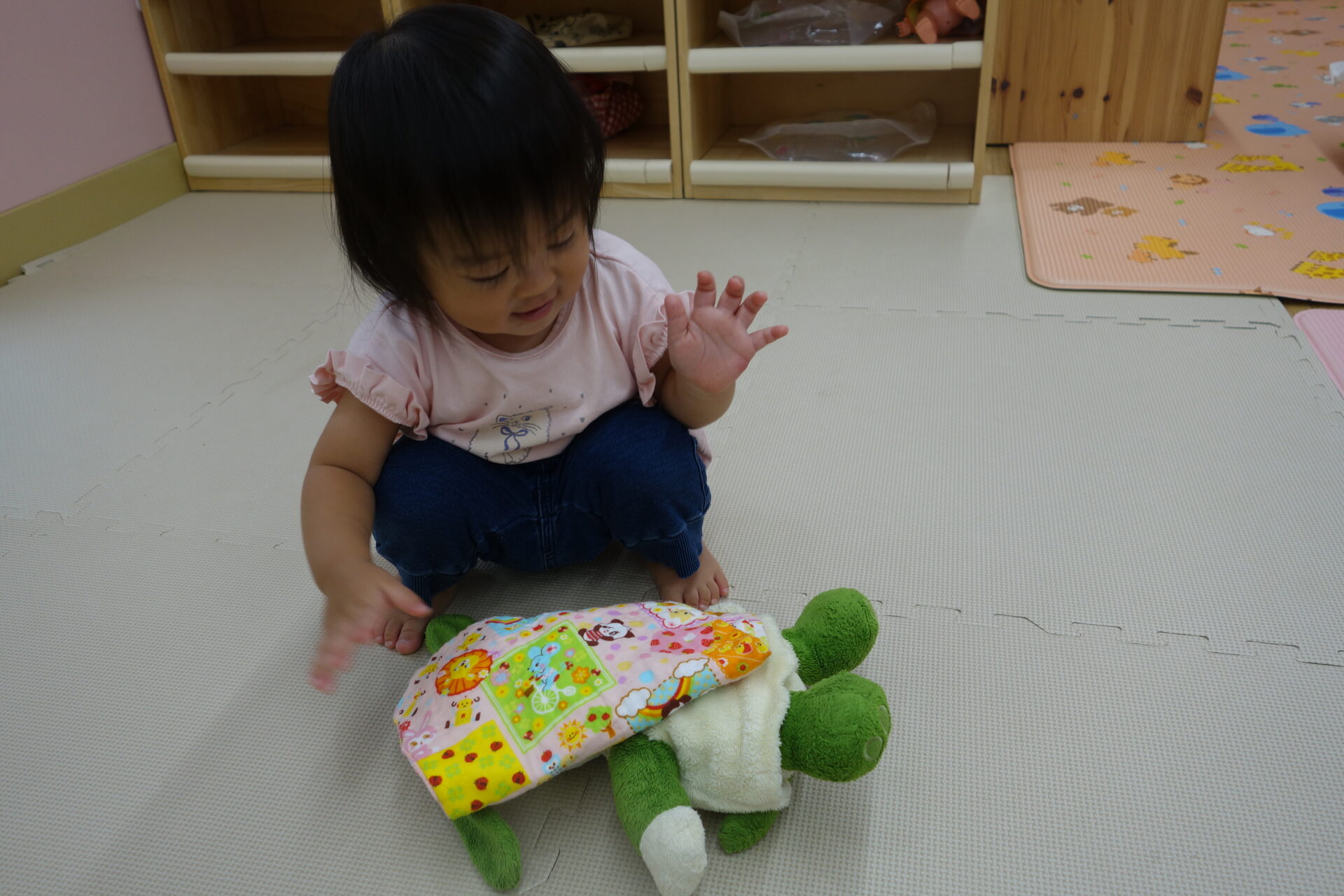 ぬいぐるみをトントンしてお世話遊びをすることも増えてきました。
