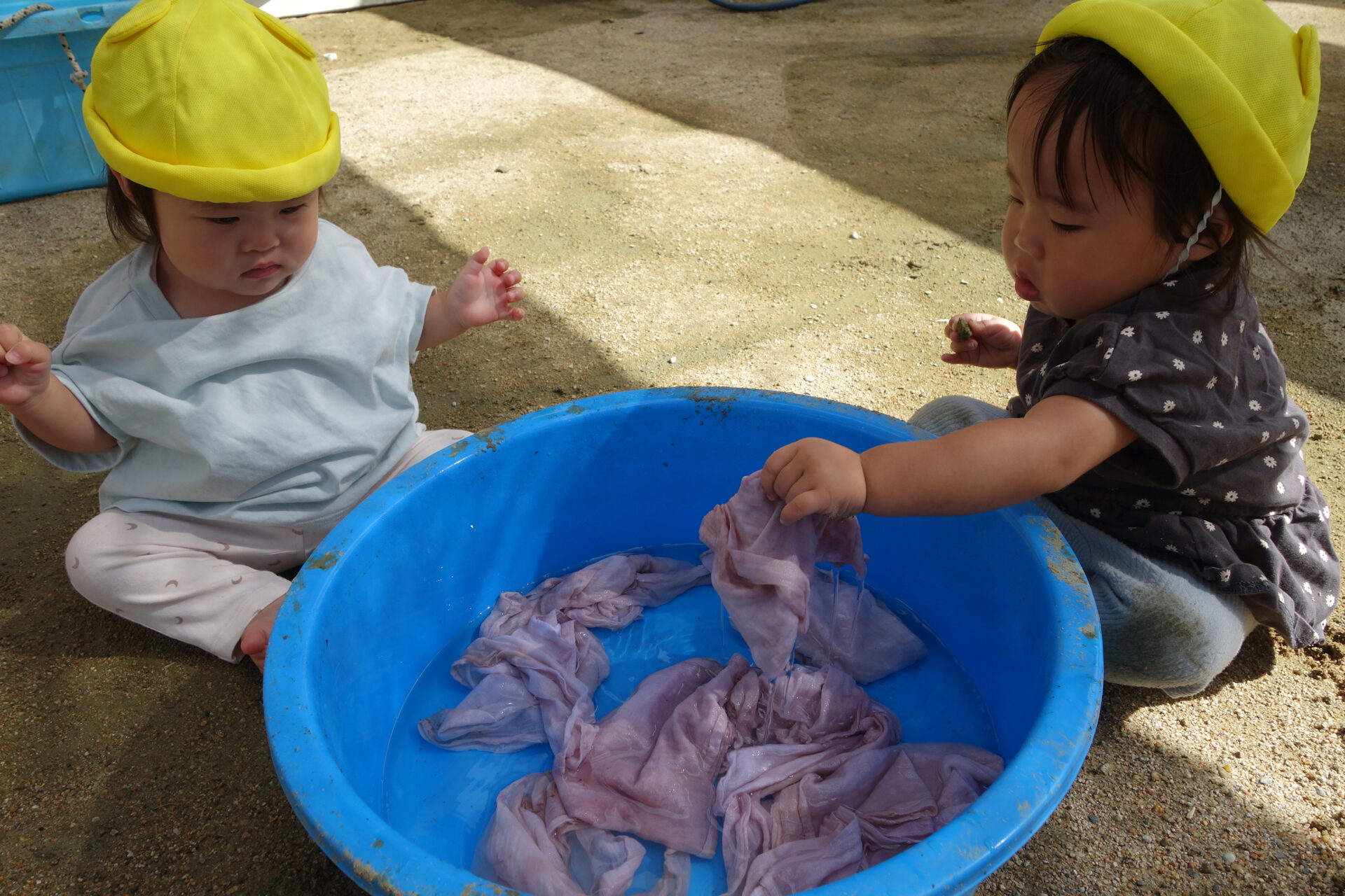 それを今回は子どもたちと一緒にお洗濯しました。ぐるぐると言いながらかき混ぜると、同じように「ぐるぐる」と言いながらまねっこしてくれます。