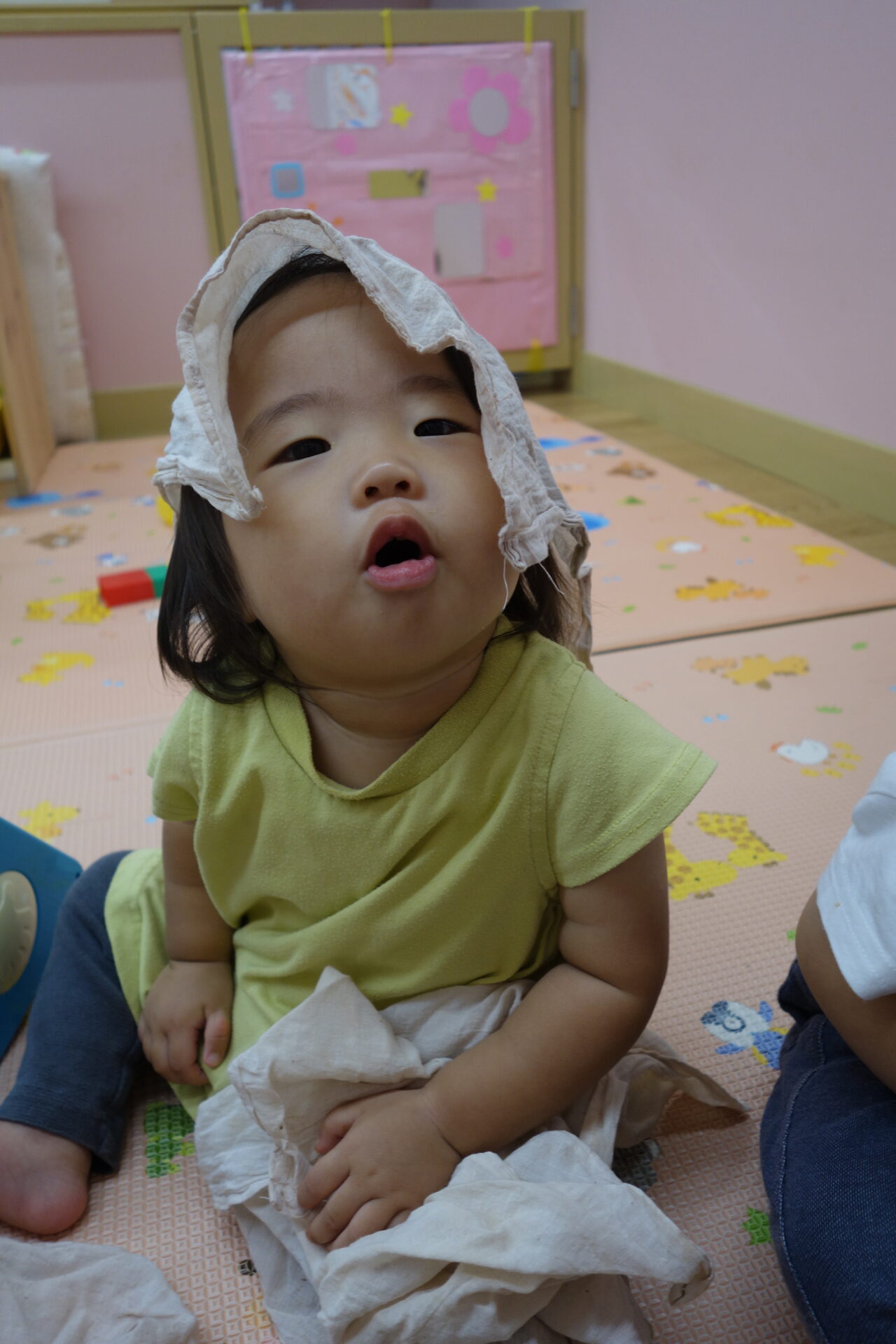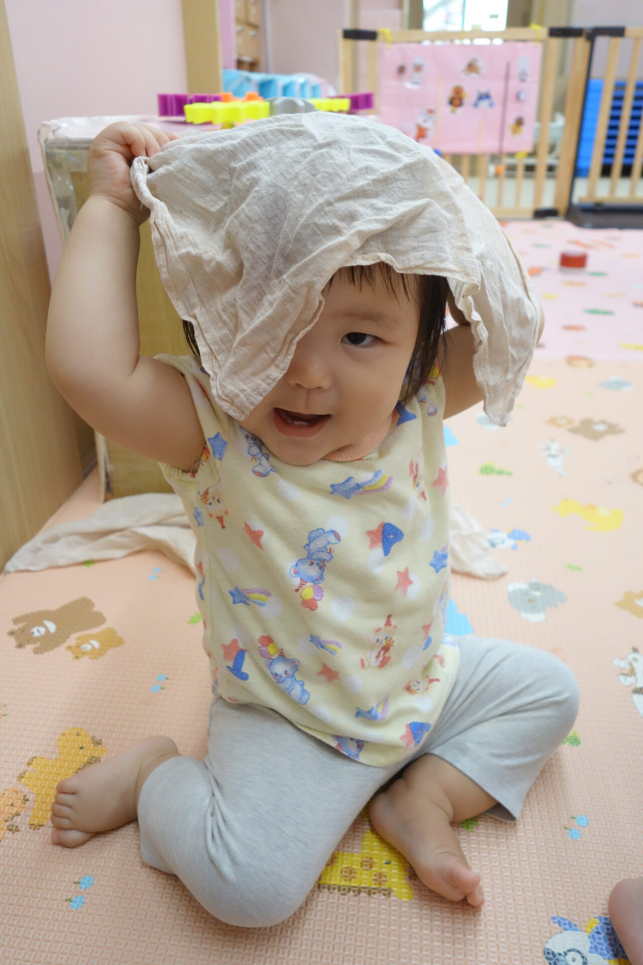 さっそく布を使って遊びました。「どうぞ」と渡すとどうするかな?と見ていたら頭にかぶったりいないいないバァをしたりして遊び始めていました。
