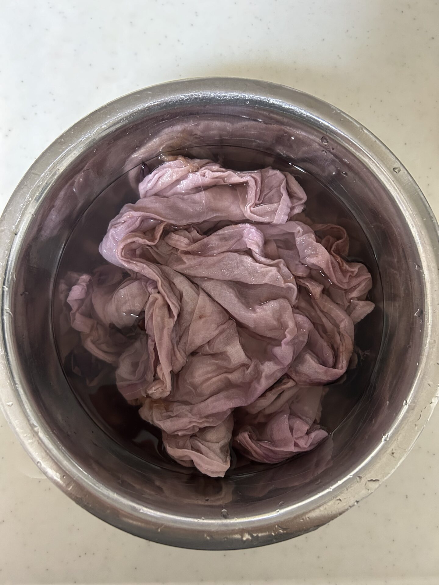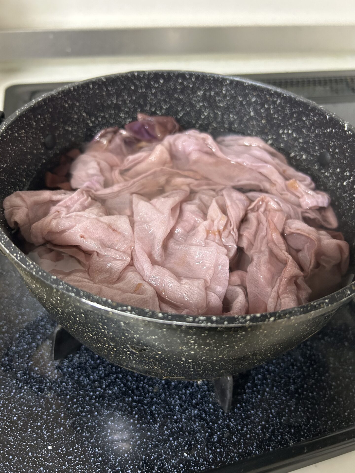 先日ブドウを使って子どもたちが染めた布をお鍋でグツグツ煮るととってもきれいな色になりました。