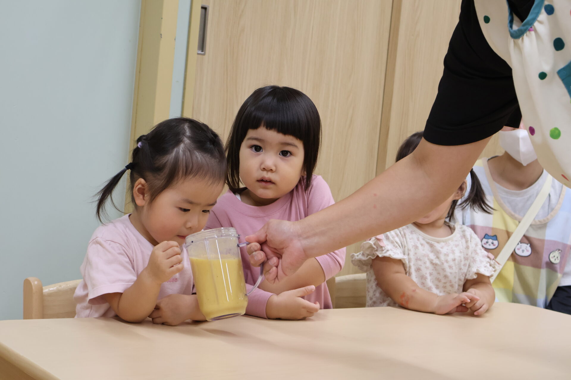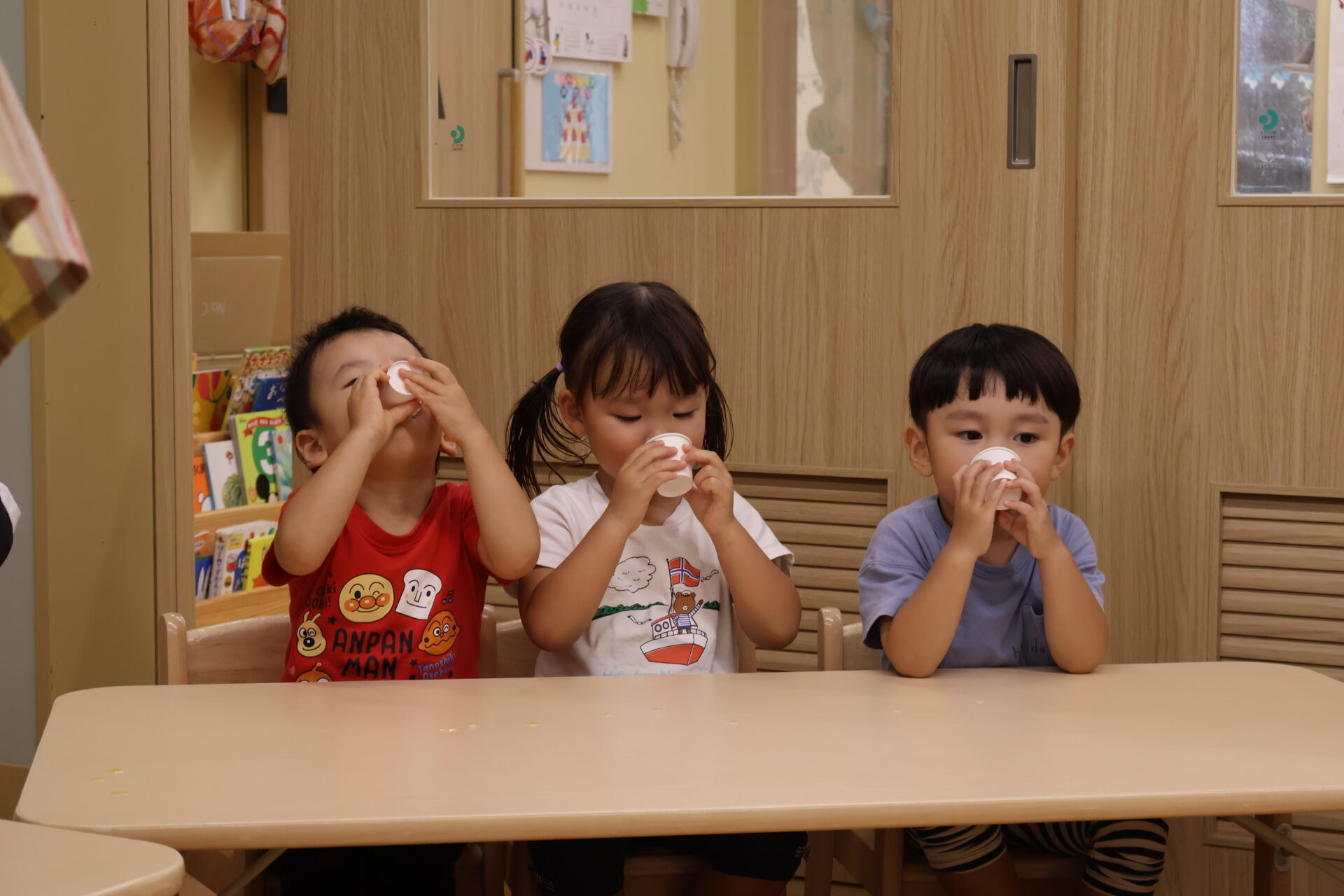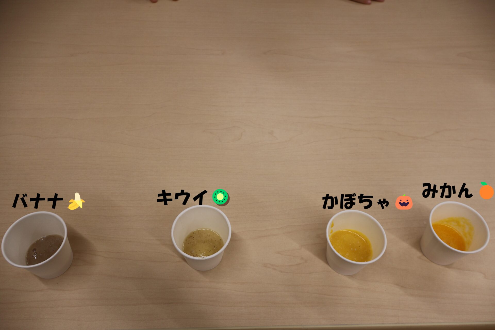「甘い」や「酸っぱい」などと飲みながら感想を言っていて、コップが空になると子ども達から「おかわりー!」「もっかい♡(もう一回)」の声が止まりませんでした。