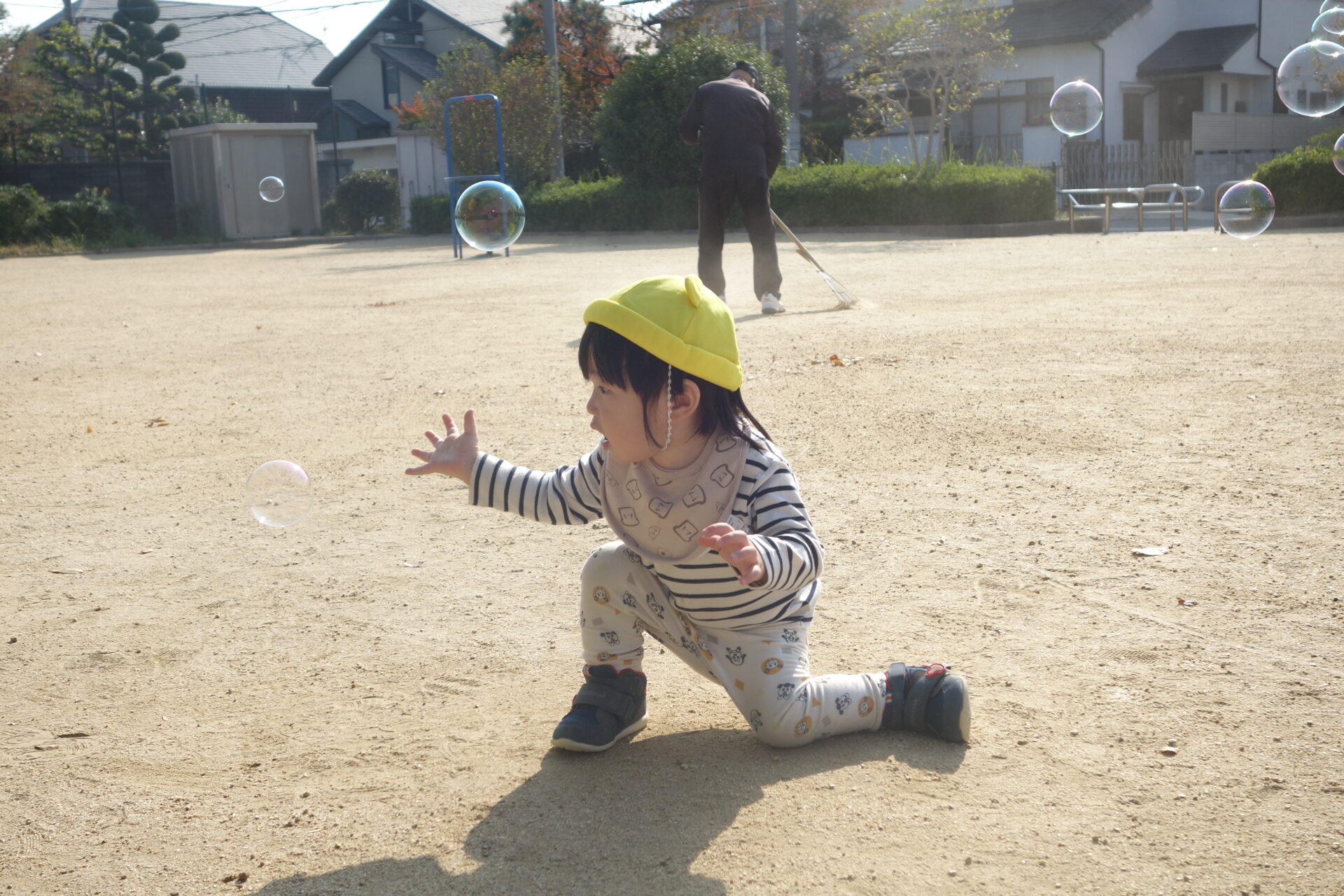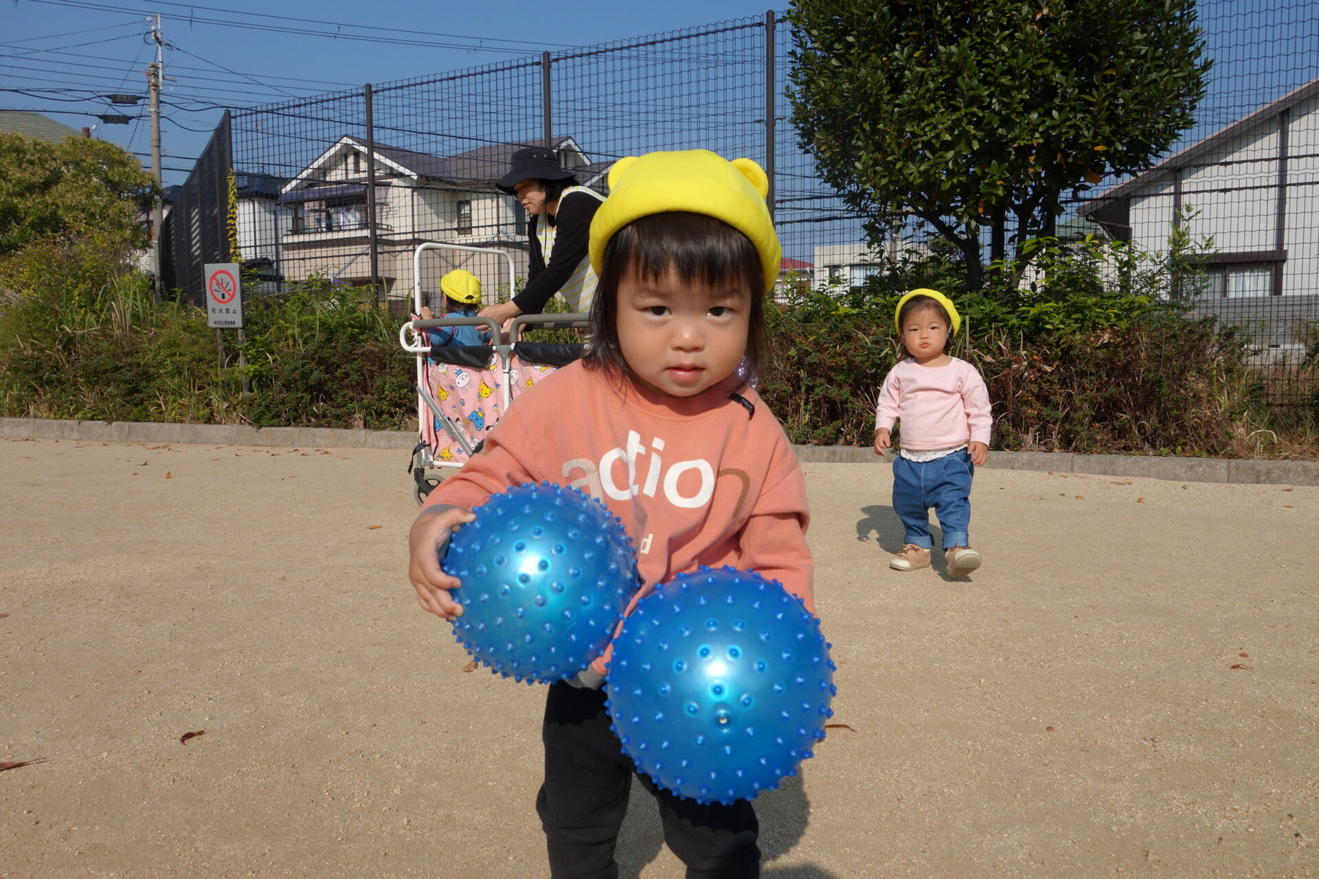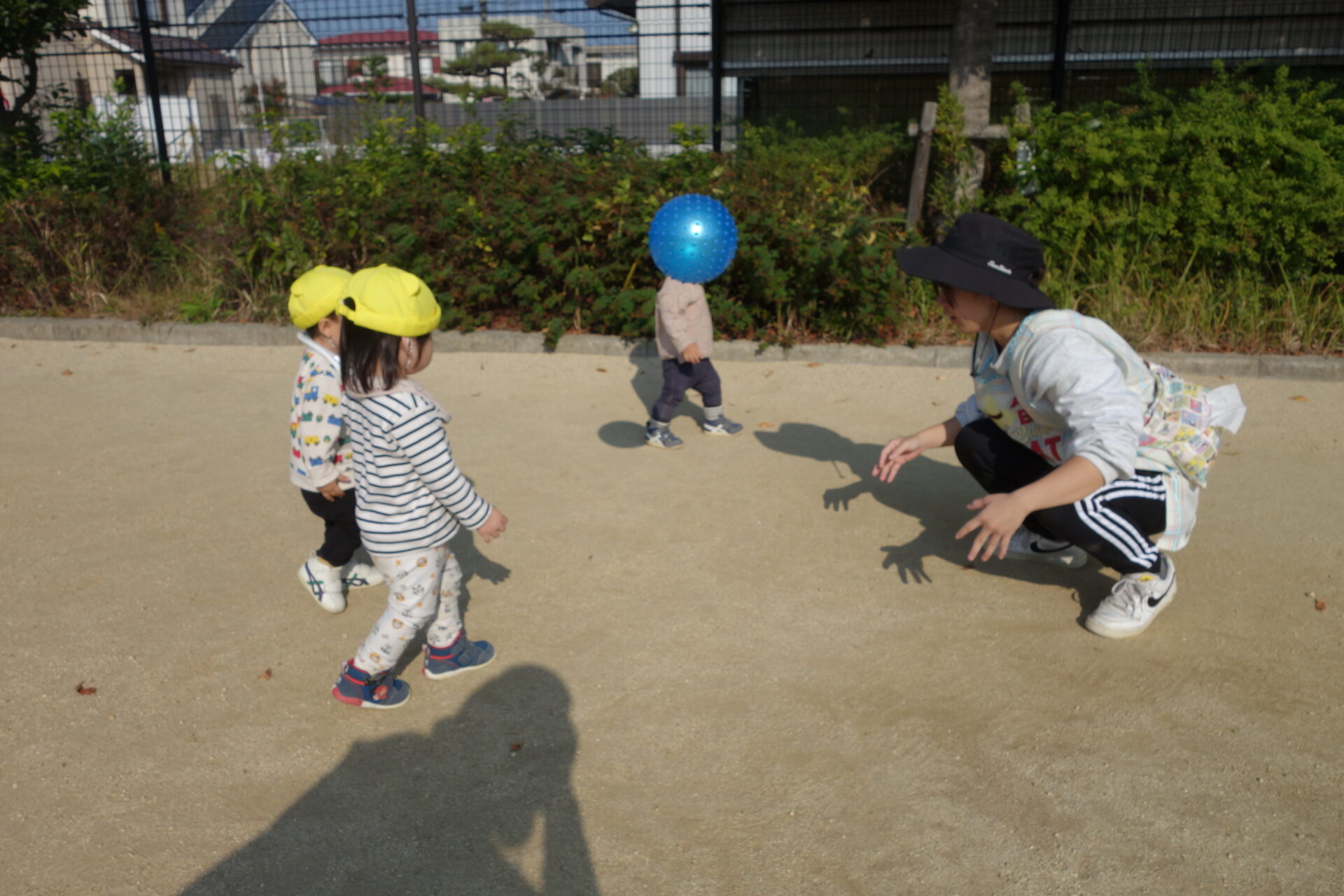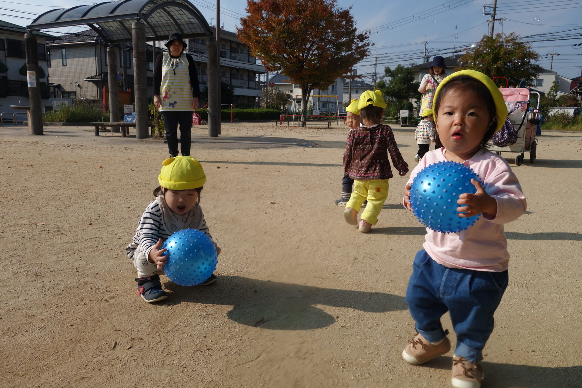 公園に着くと、みんなすぐに遊び始めます。今日は保育園からボールとシャボン玉を持って行きました。