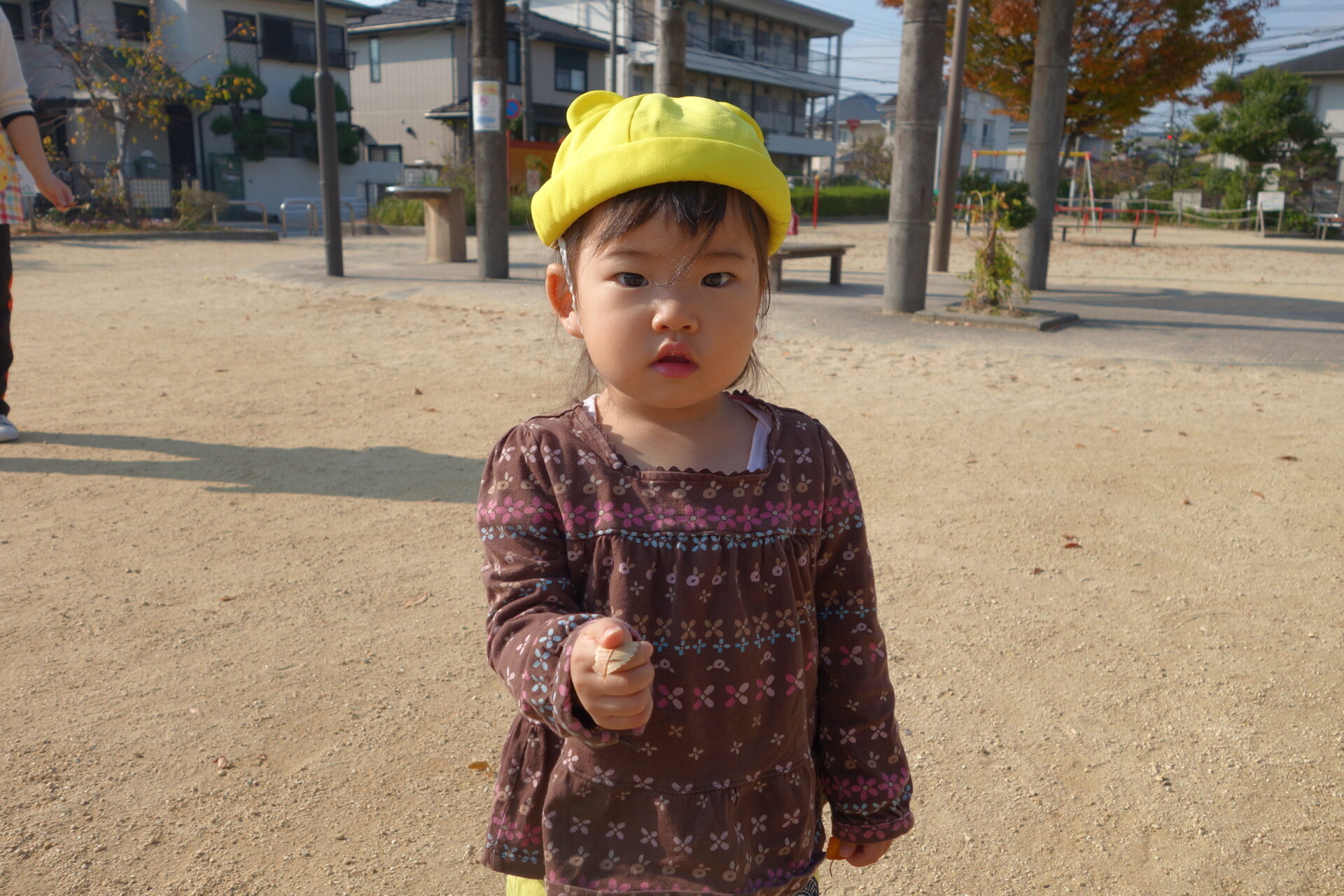 落ち葉を見つけて持ってきてくれました。子どもたちにとっては小さな落ち葉でも大発見です。