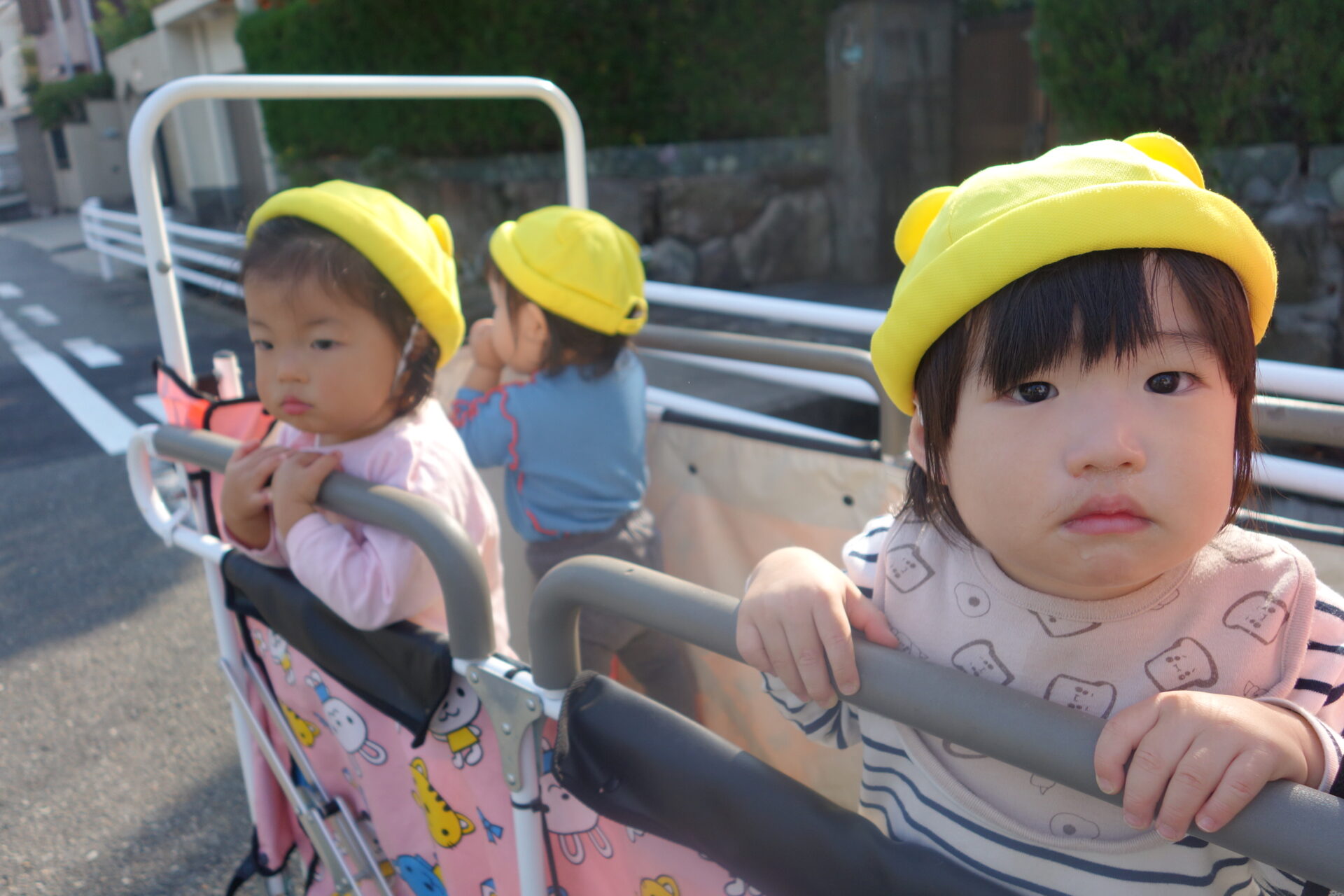 他の子どもたちはバギーに乗って行きます。バギーに乗るといつもよりも目線が高くなって、こちらも子どもたちにとってはとても楽しい様子です。