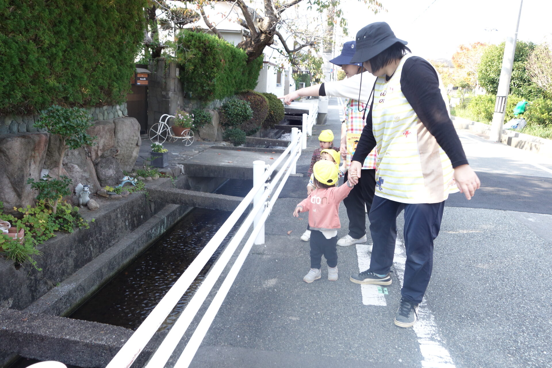 子どもたちは保育士と手を繋いで歩きます。手を繋いで歩くと、いつもの道でもいろいろな発見があるようです。途中まで歩いたら他のお友達と交代!順番に手を繋いで歩きます。