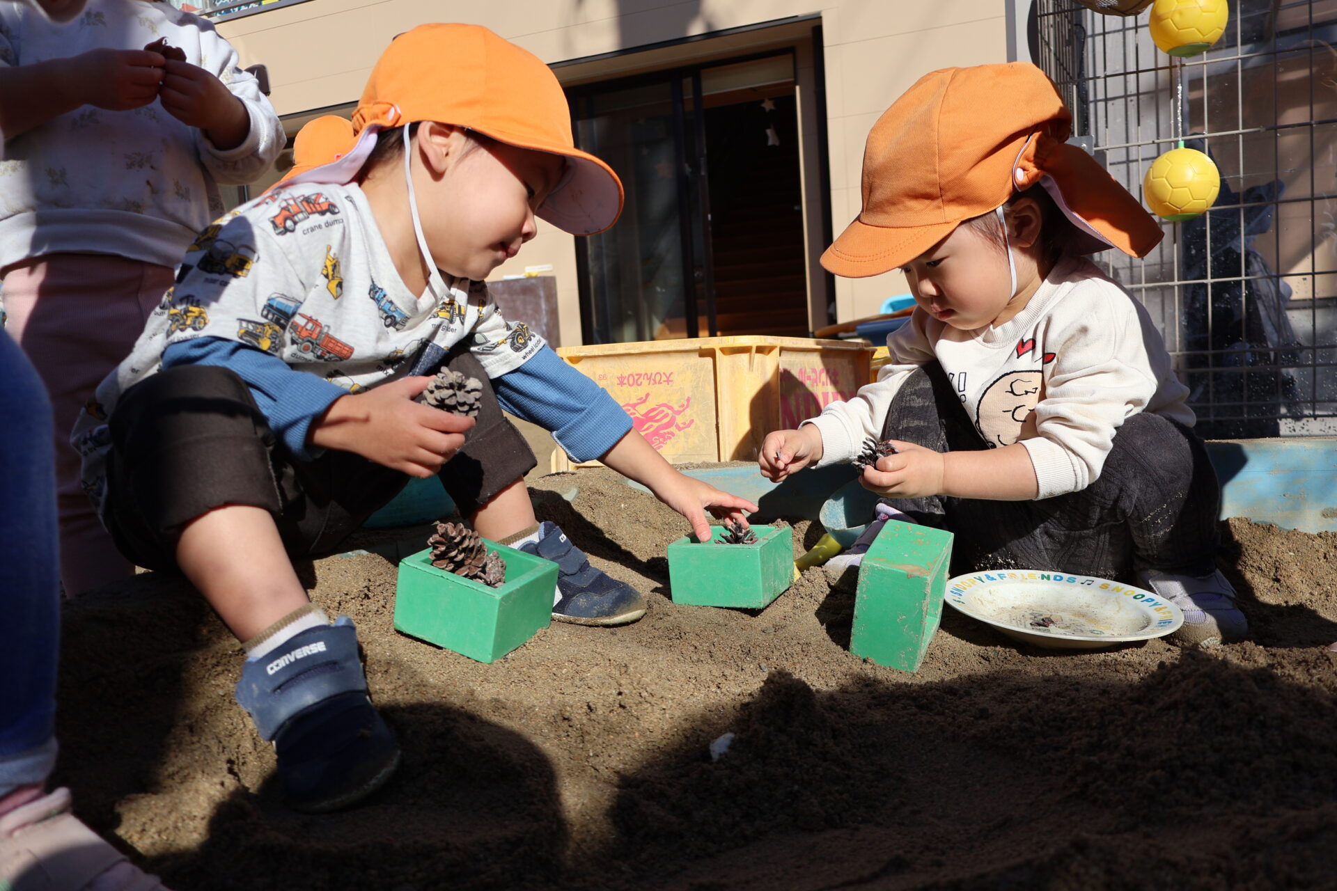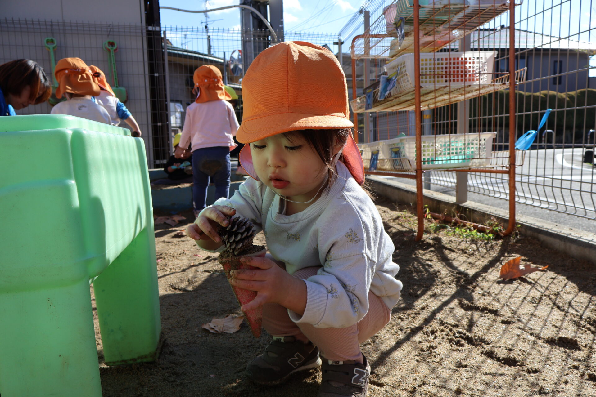 「いっしょ~」と松ぼっくりを見せ合っているうちに、「ケーキつくろー!」と砂をすくって器に入れていました。