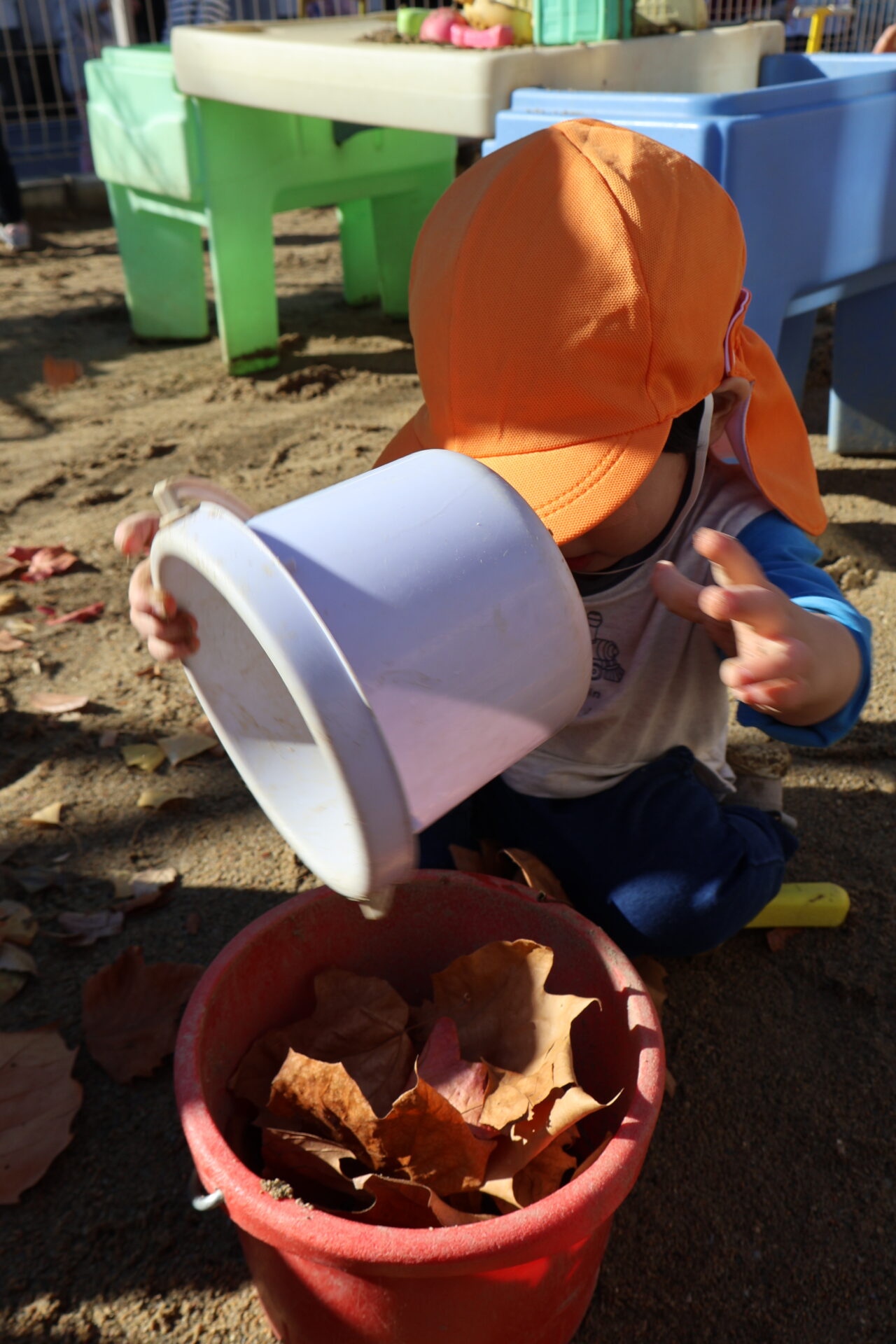 溢れそうな落ち葉を見てもっとたくさん集めるにはどうすればいいかな?と考え、大きなバケツに移し替えていました!