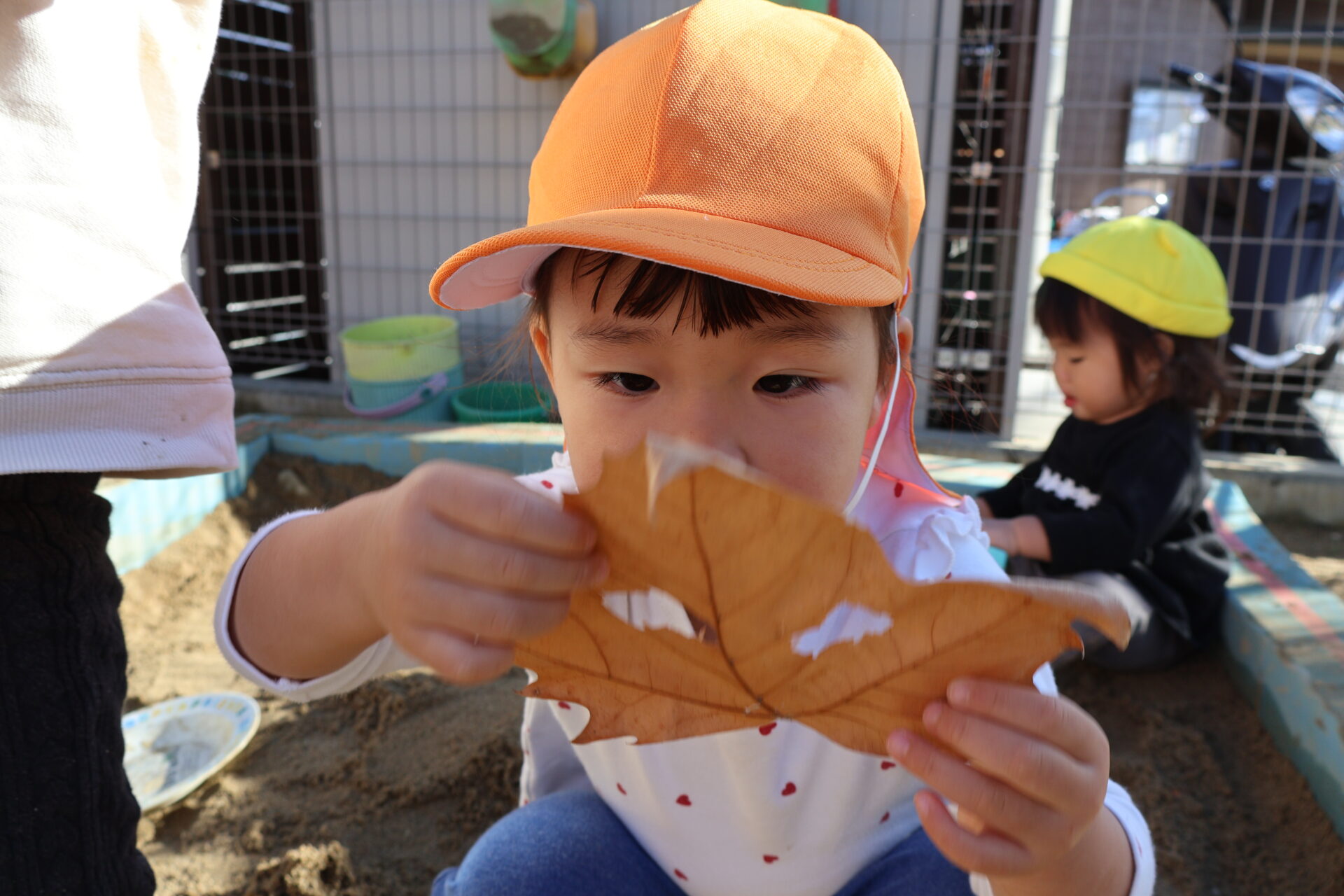 保育者が作った葉っぱのお面を不思議そうに見ています。