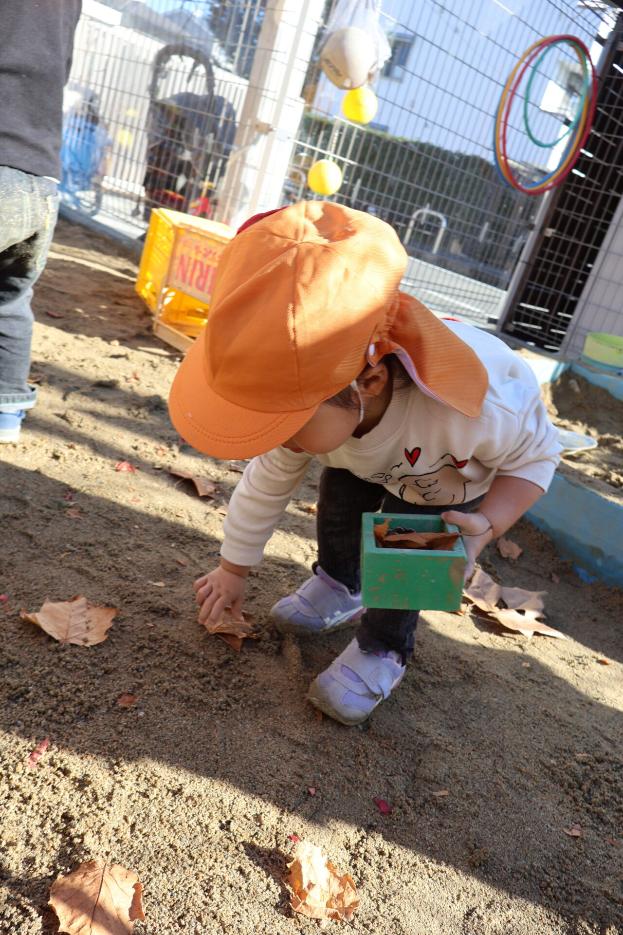 園庭に落ち葉を広げると、ミニバケツを持って来て集め始めました。