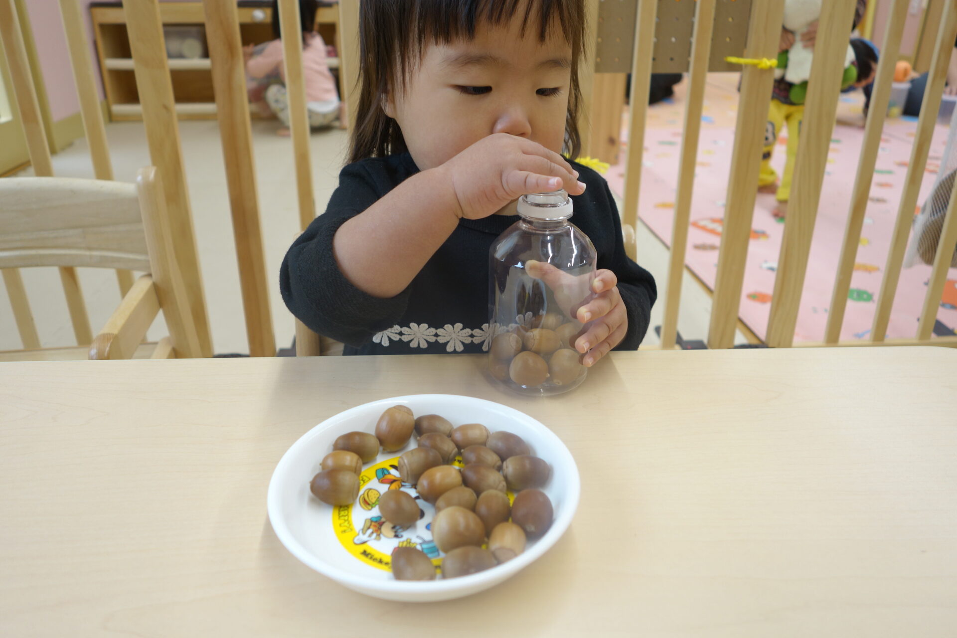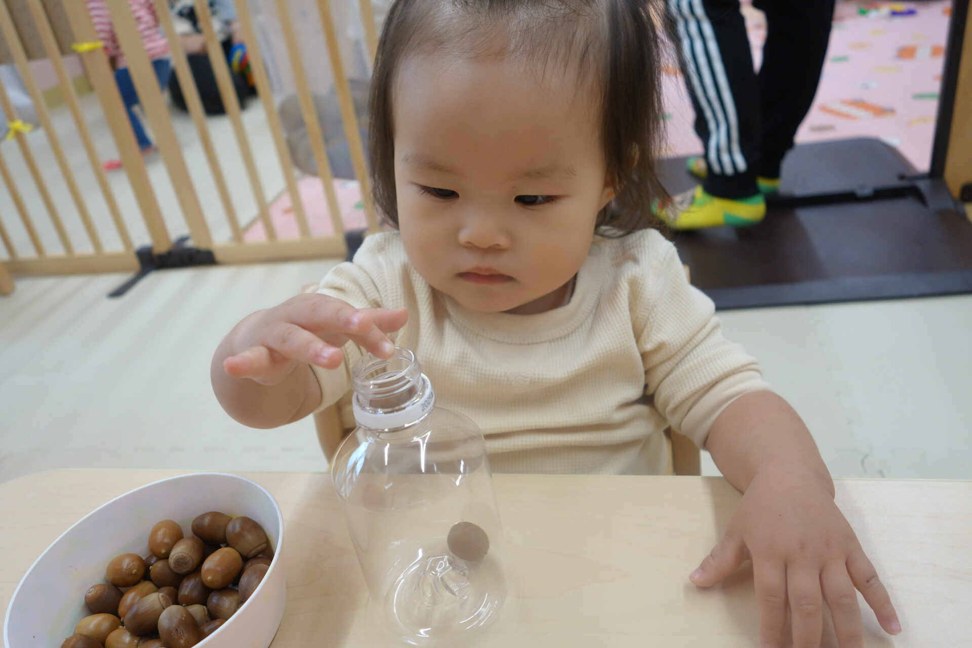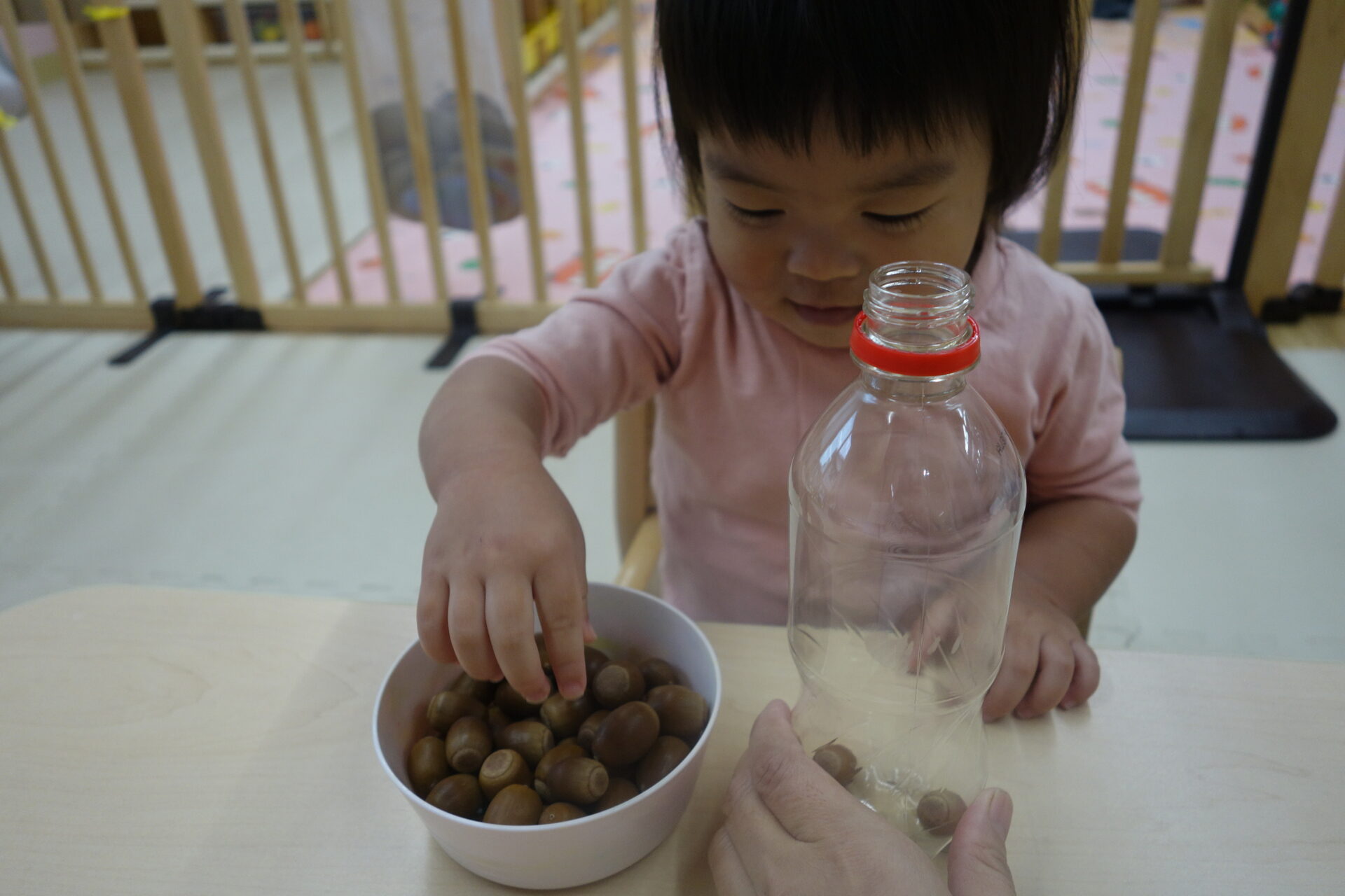 小さなどんぐりをもっと小さなペットボトルの穴に入れていきます。まずは保育者が何個かやって見せると、早くやりたそうにすぐにどんぐりを手に取っていました。さぁ入るでしょうか。
