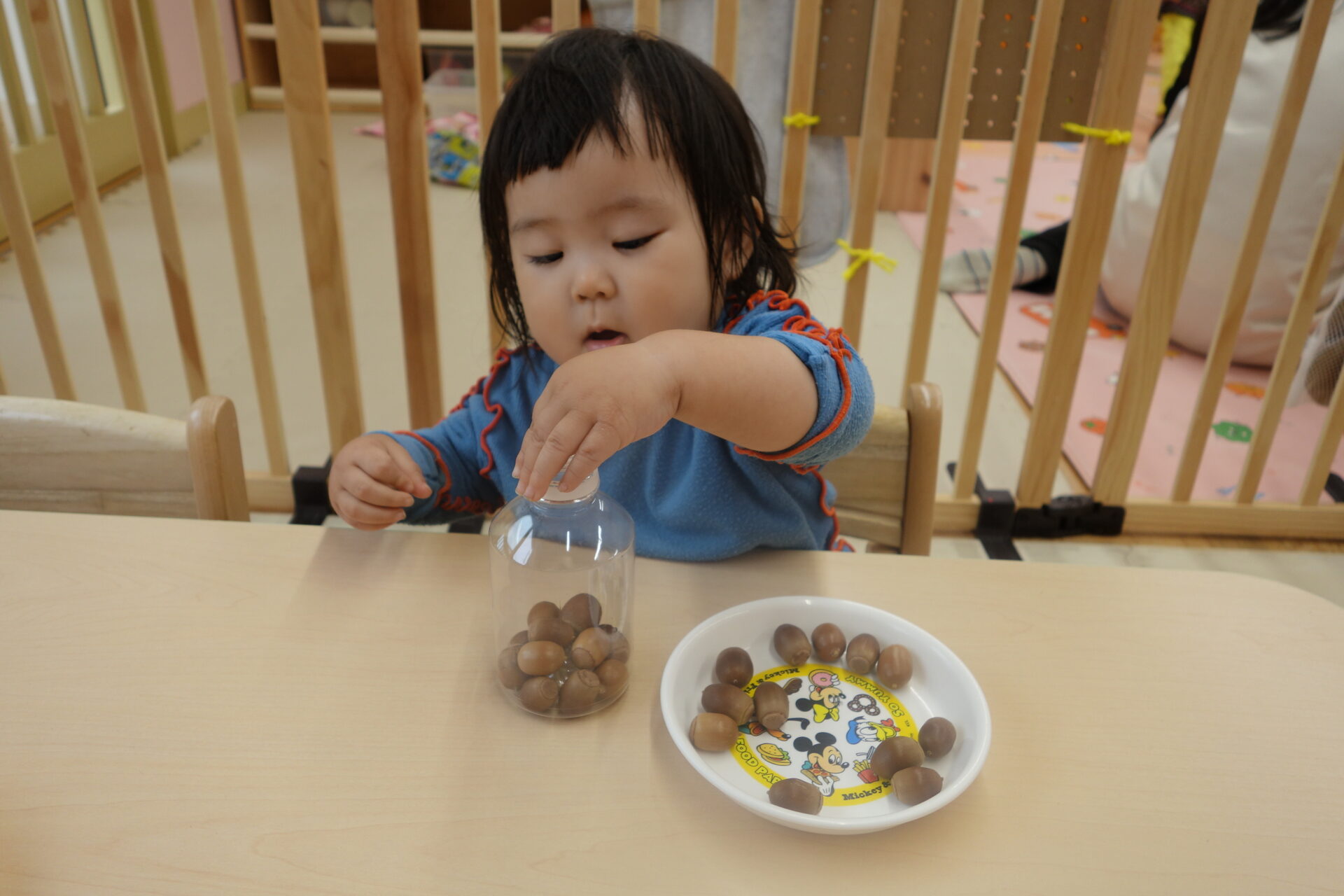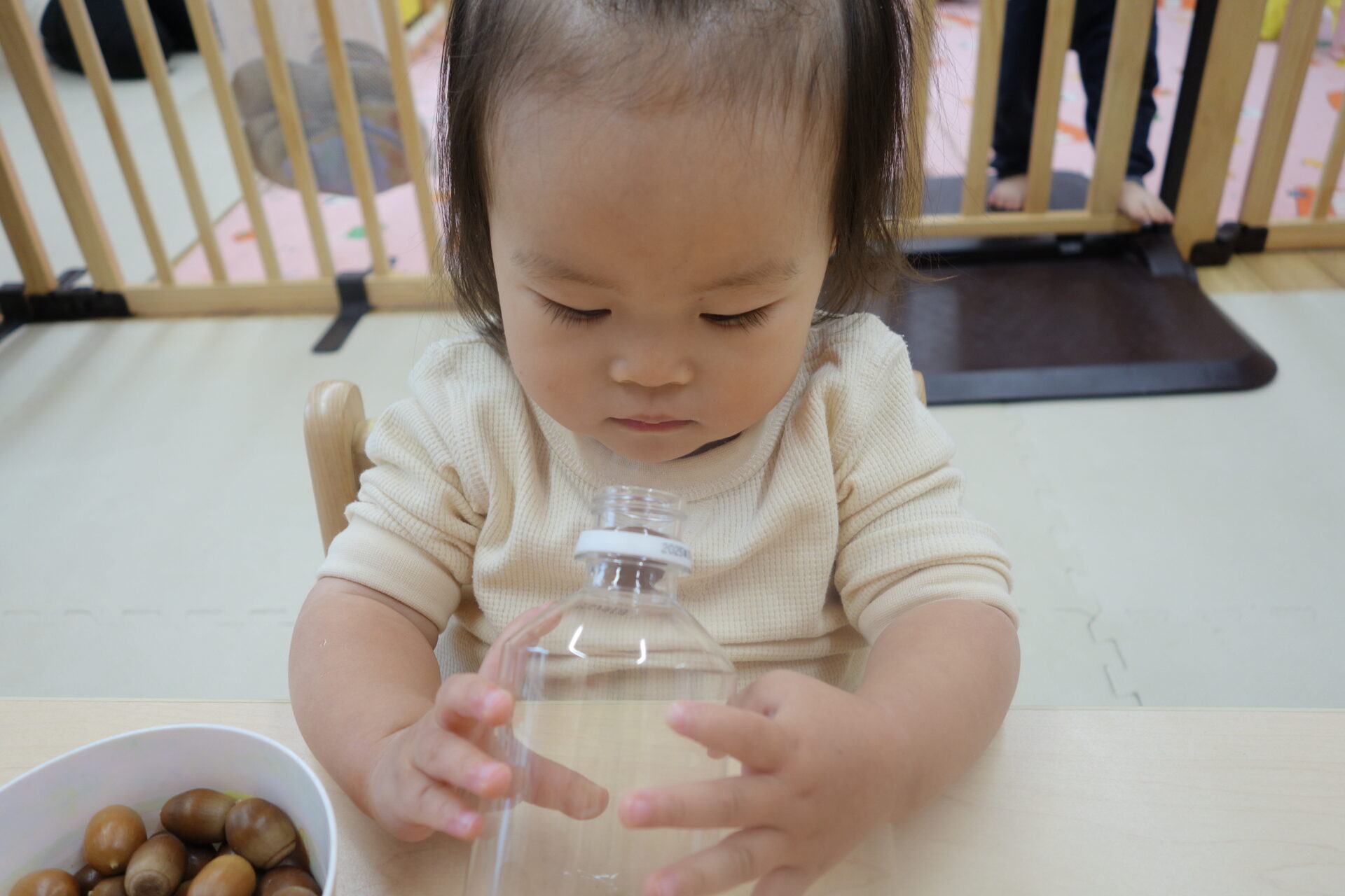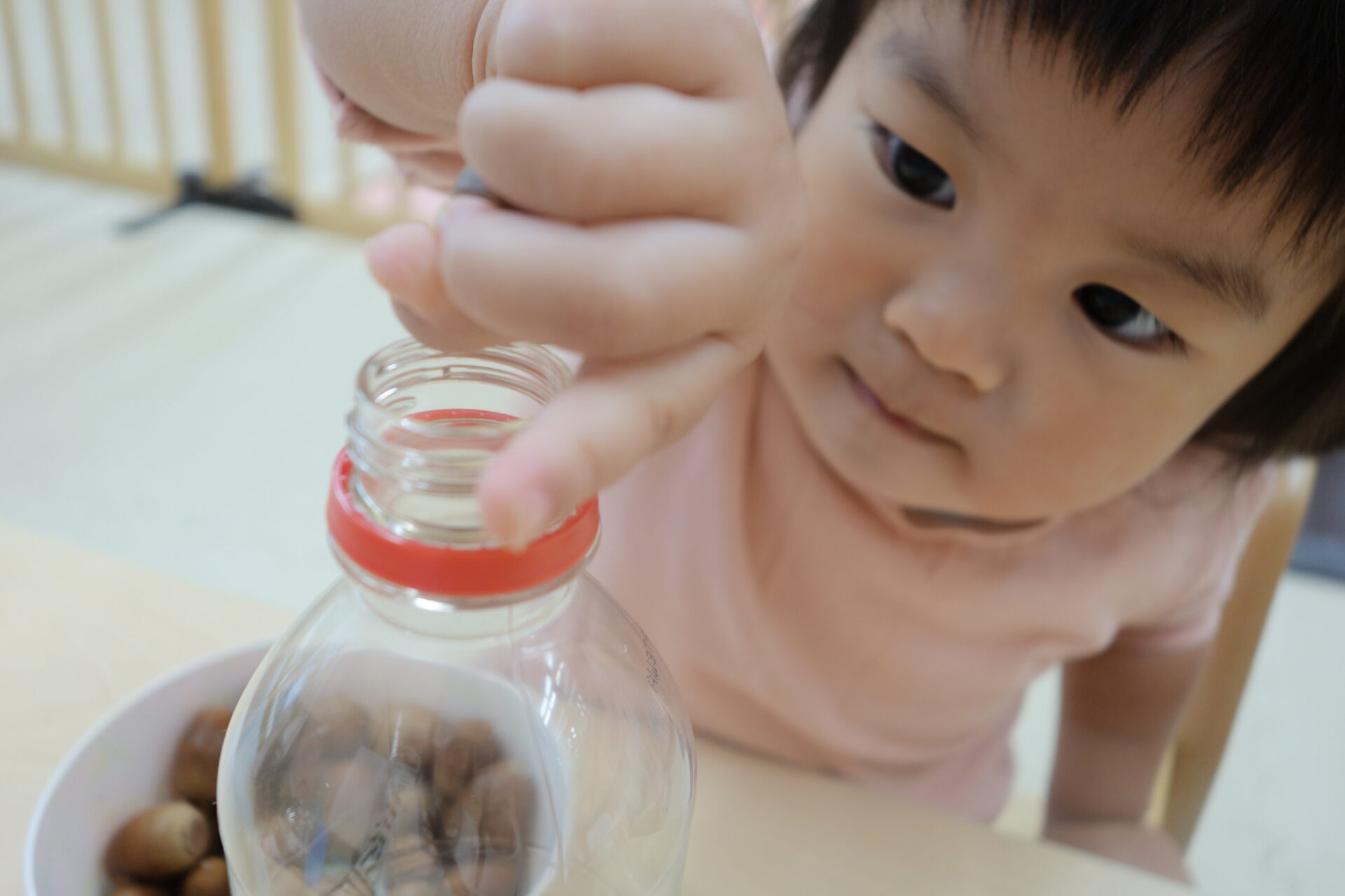 小さなどんぐりをもっと小さなペットボトルの穴に入れていきます。まずは保育者が何個かやって見せると、早くやりたそうにすぐにどんぐりを手に取っていました。さぁ入るでしょうか。