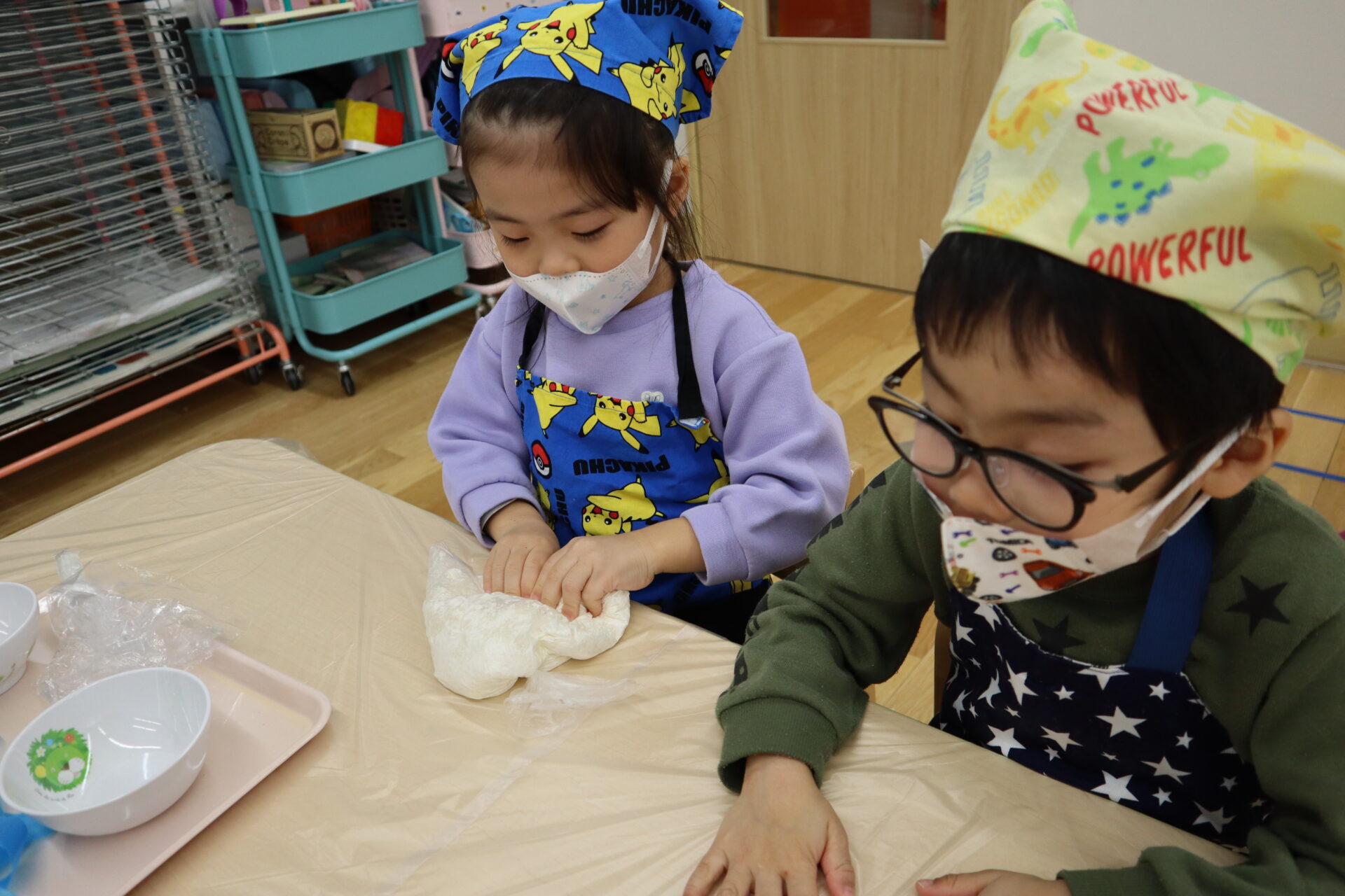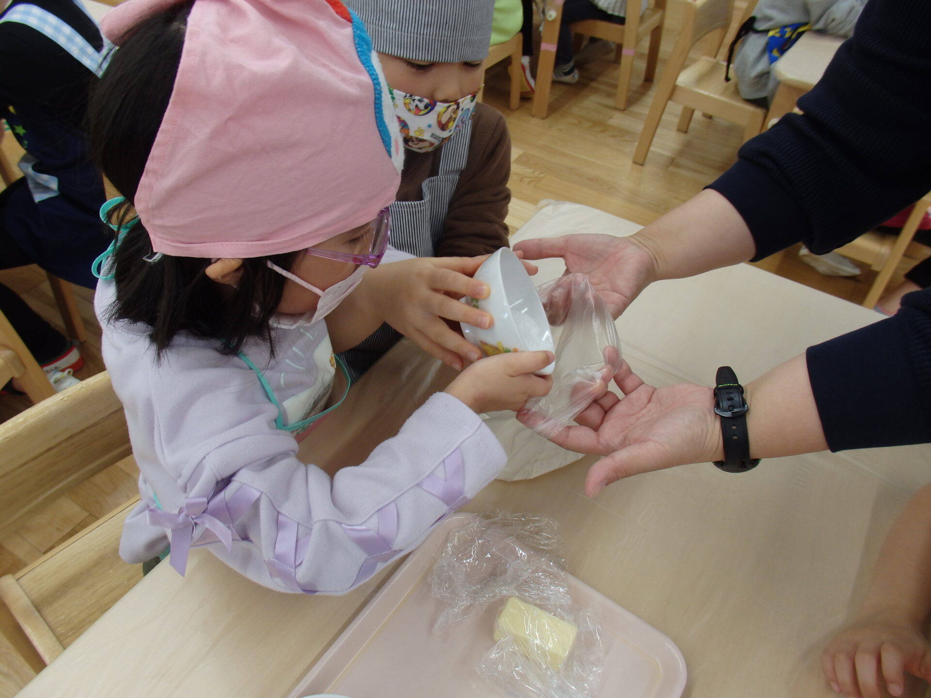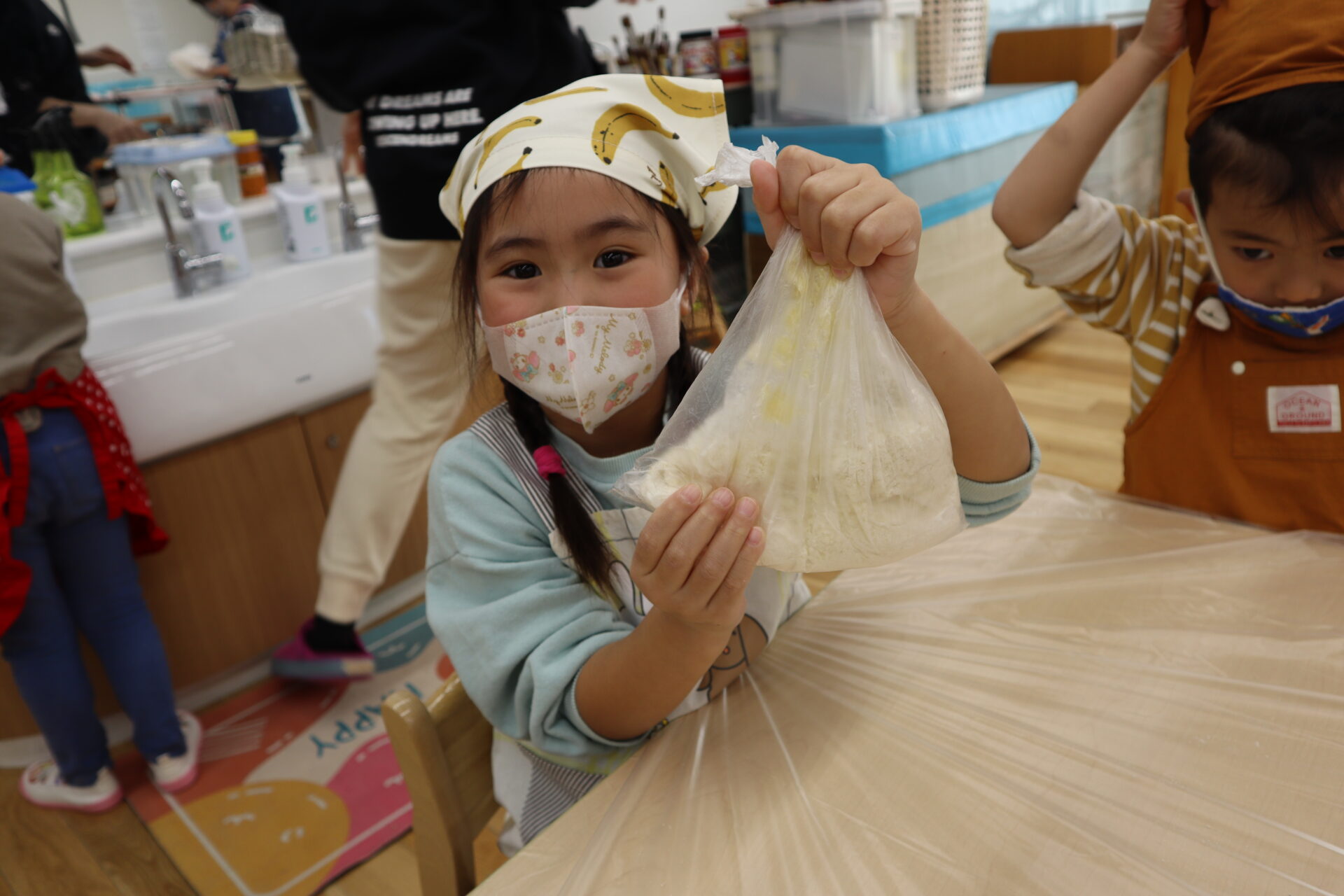 硬さや色が変わってくると、「なんかムニムニしてきた~」「黄色くなってきたよ~!」と様々な変化に興味津々の子ども達です☺