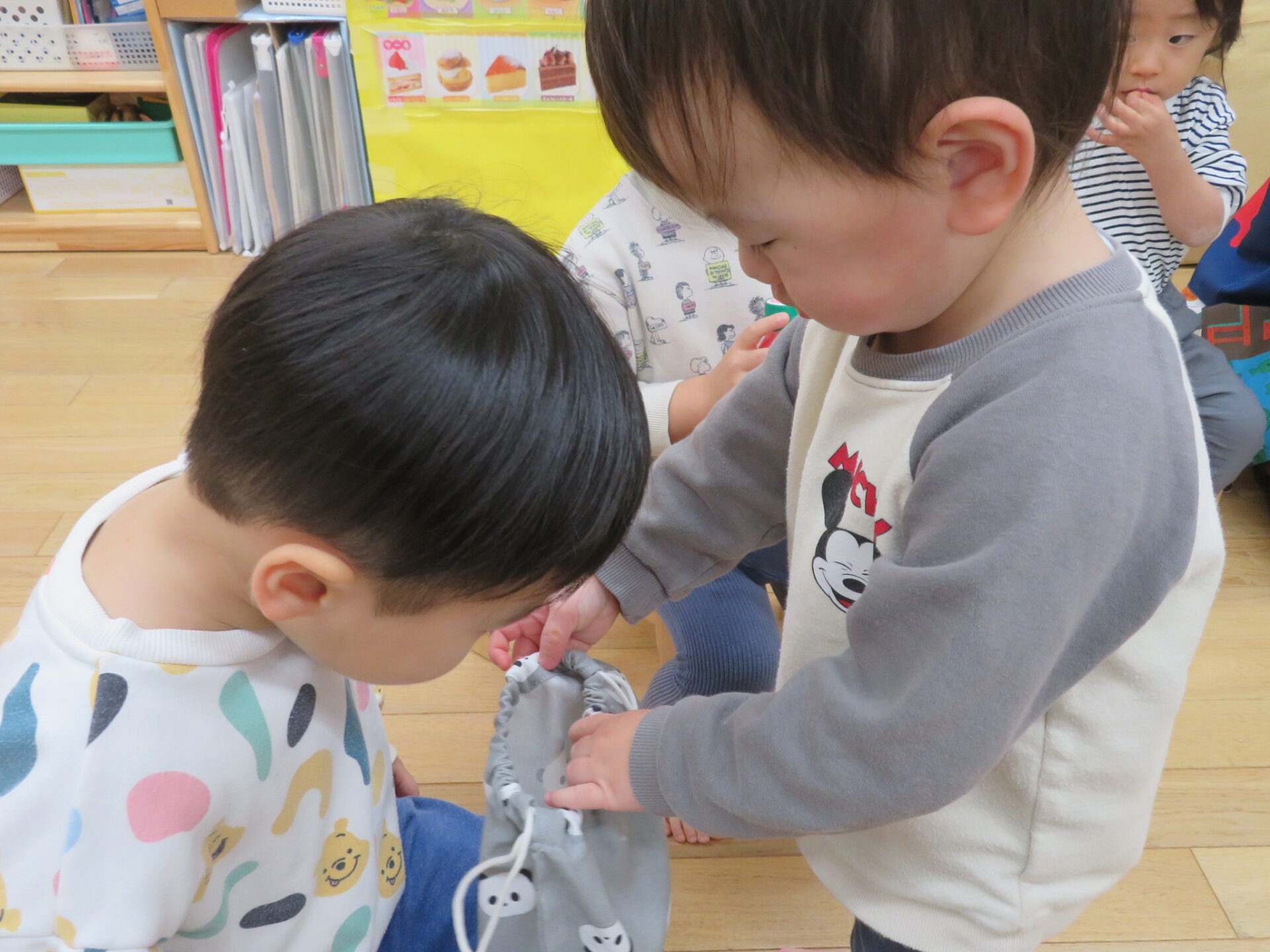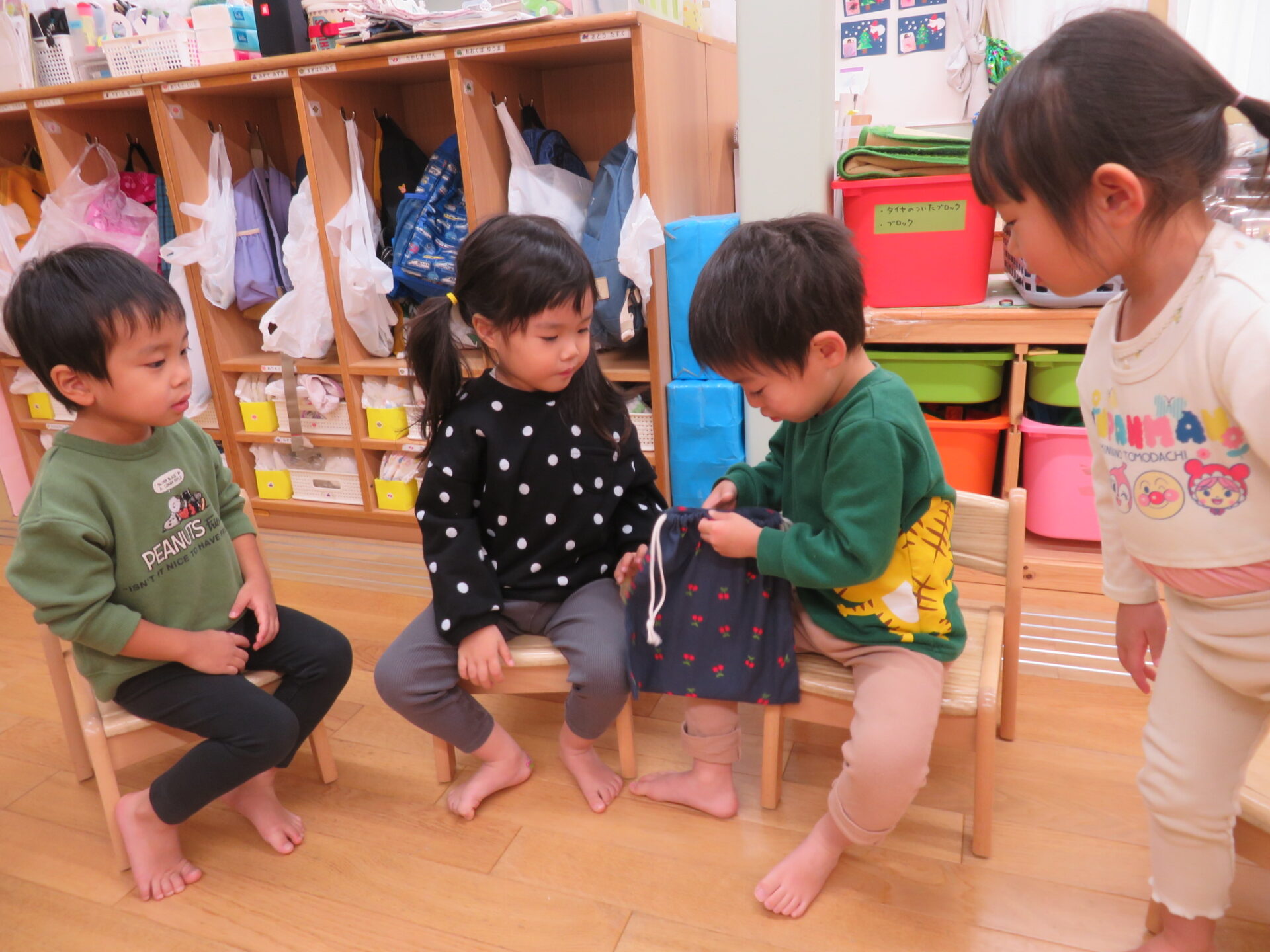 保育者が「このプレゼント選んだのだ〜れ」と聞くと「は〜い」と手を挙げて教えてくれました。そのお友だちのそばに行き、一緒に見ようと誘うお友だちもいてほっこりしました。