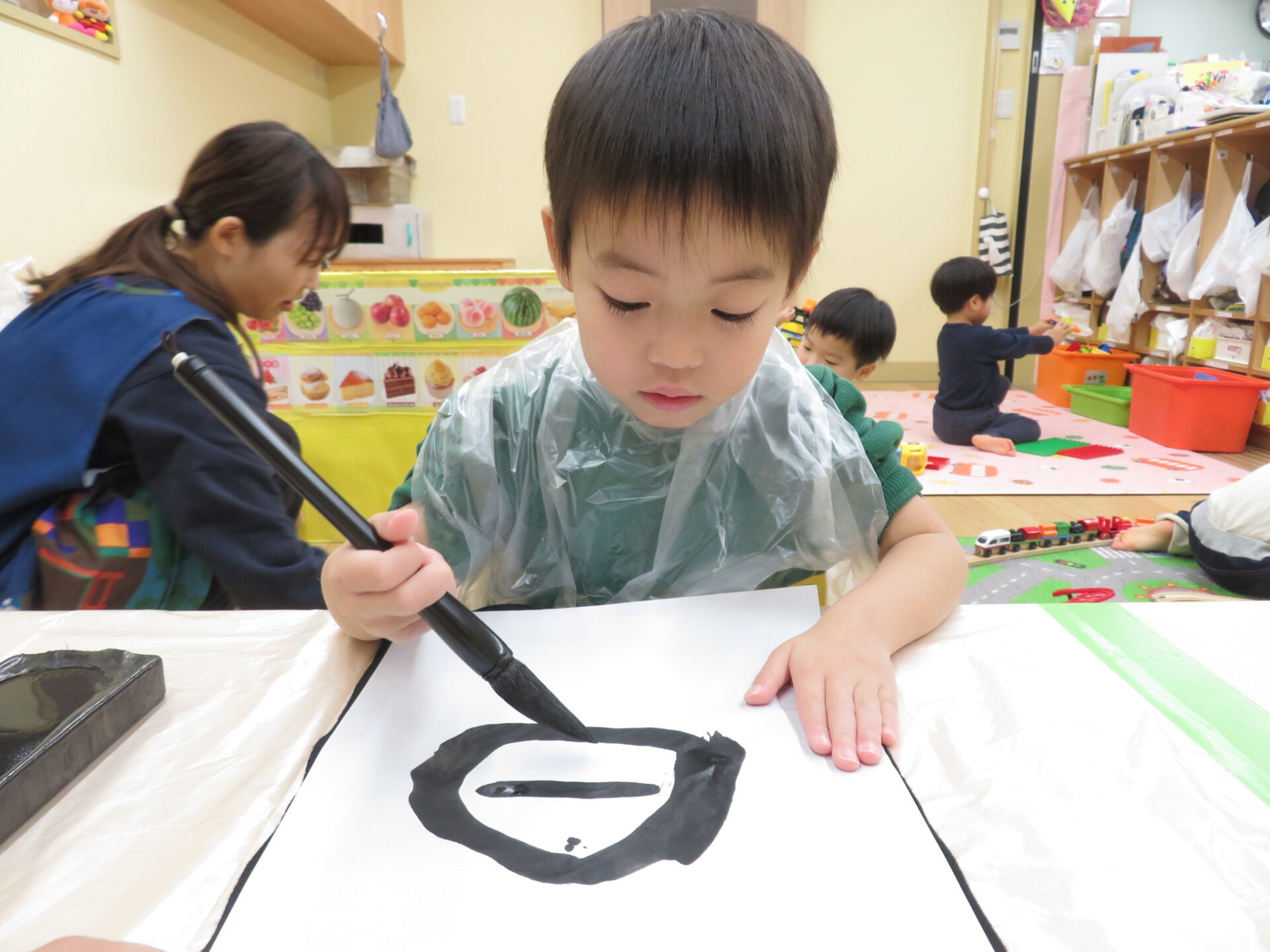 お正月の日本の文化に触れてみようということで「書き初め」「福笑い」「凧揚げ」の3つの正月遊びを行いました。