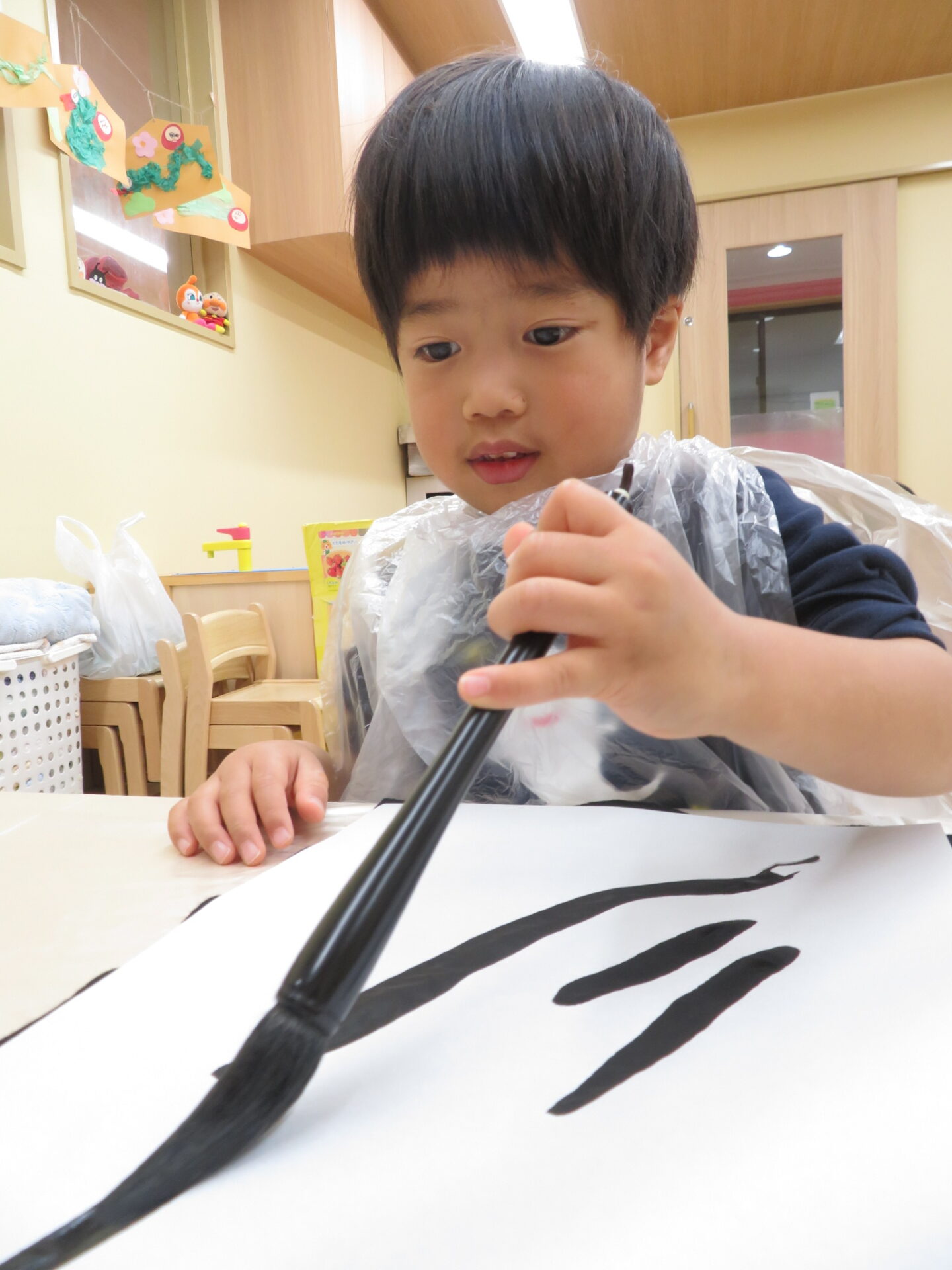 本物の硯を使い、墨でするところからスタート。墨をすると水から黒い墨へと変わっていき墨ならではのいい香りがしてきました。筆に墨をつけて、、半紙へ思いを込めて線・丸・顔を書き、絵の具で使う筆や刷毛とはまた違った感覚を味わいました。