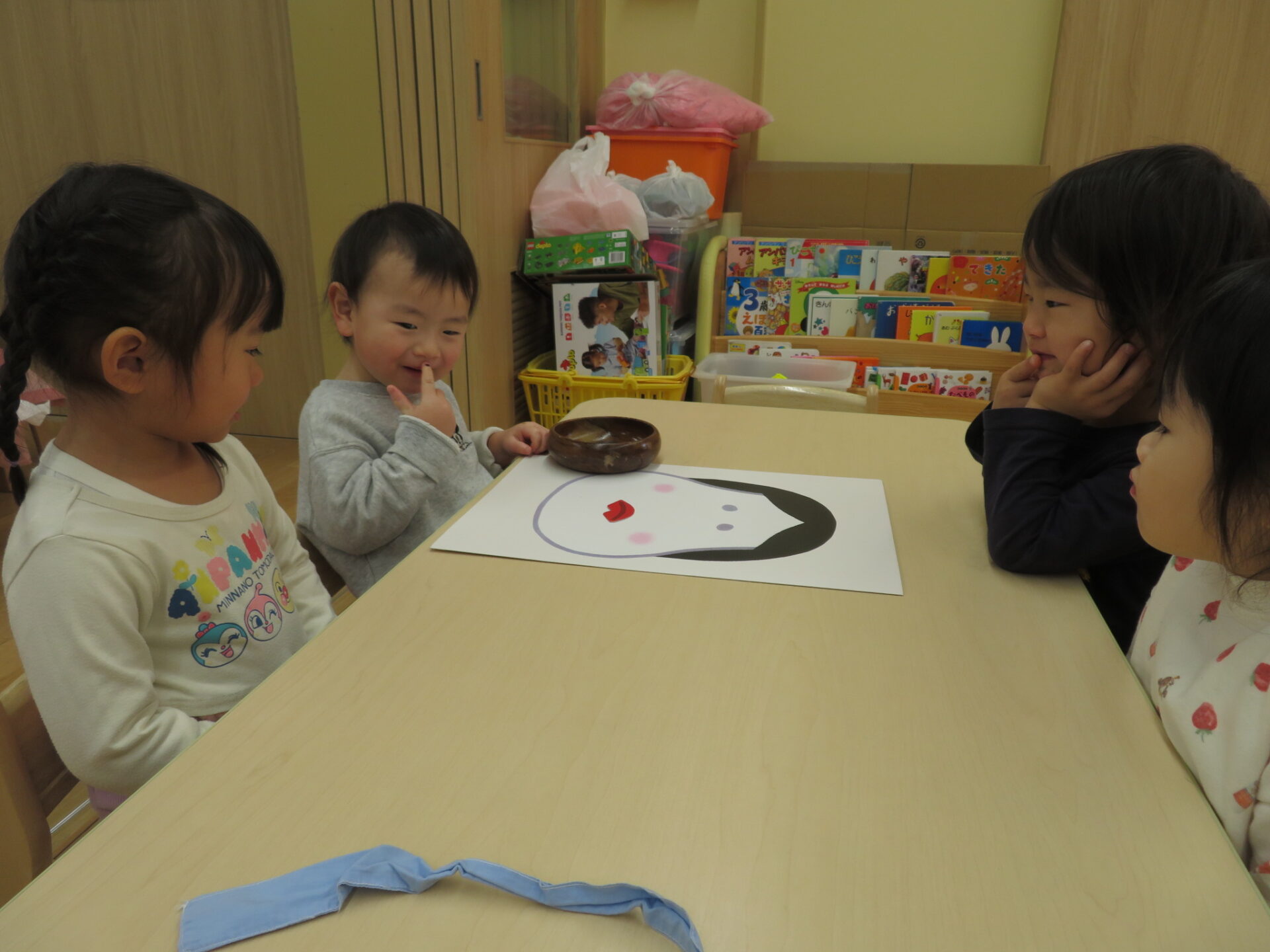 福笑いでは「おかめ」と「ひょっとこ」を使用しました。「これ誰か知ってる?」と聞くと「誰やろ?」と。まずは名前を覚えるところからスタートしました‼︎