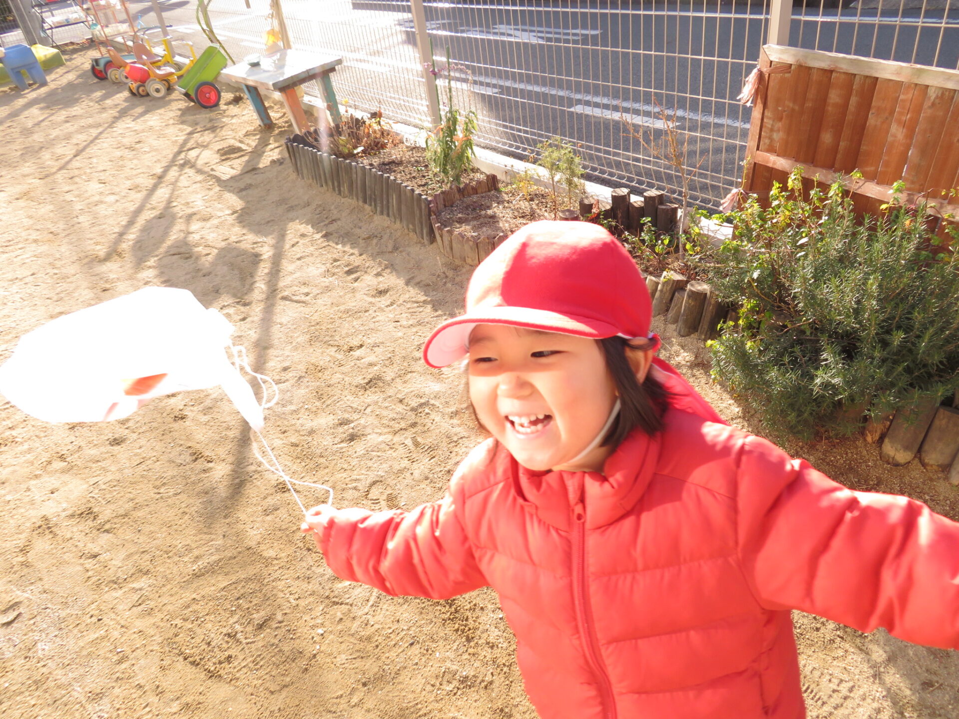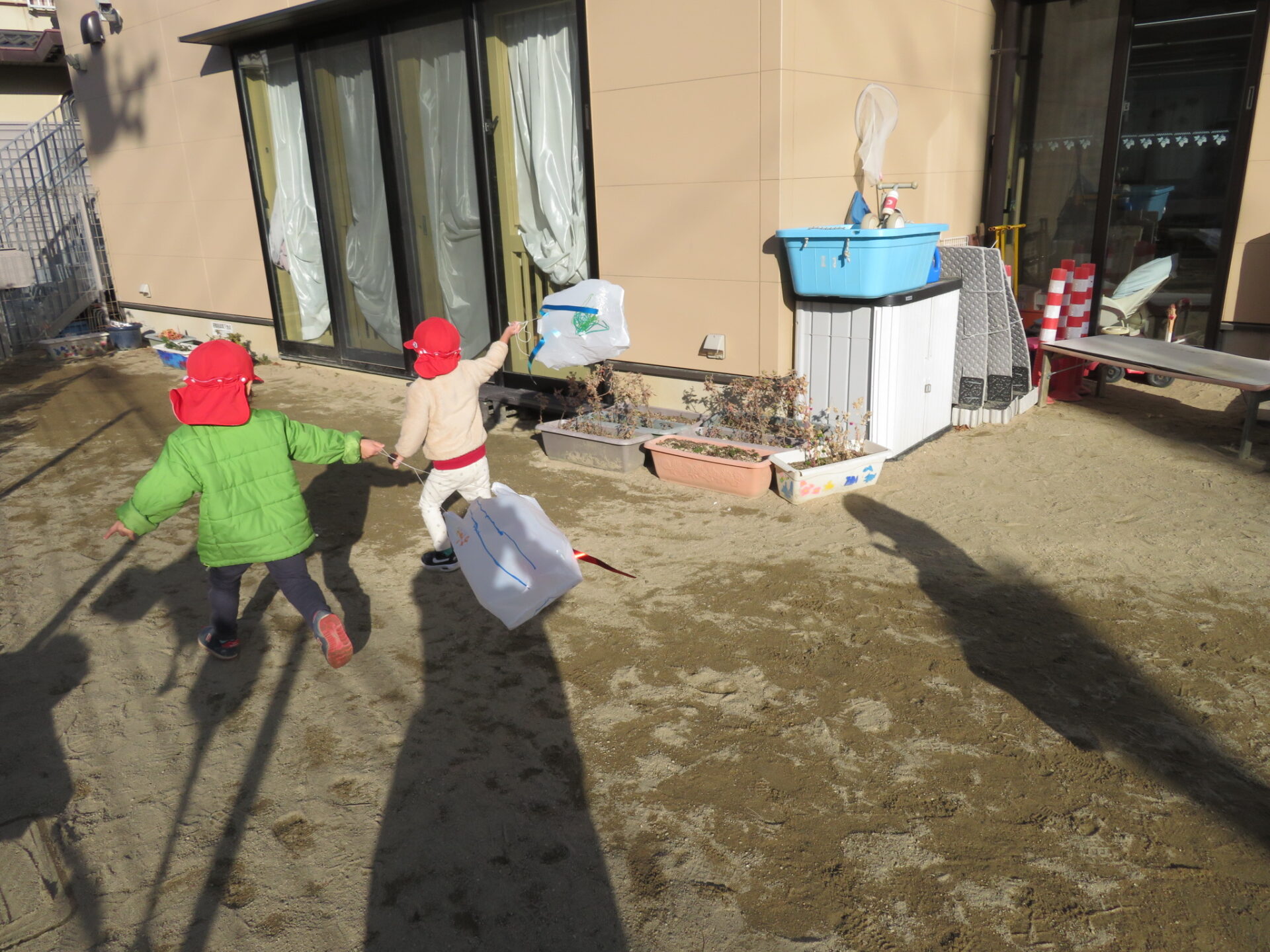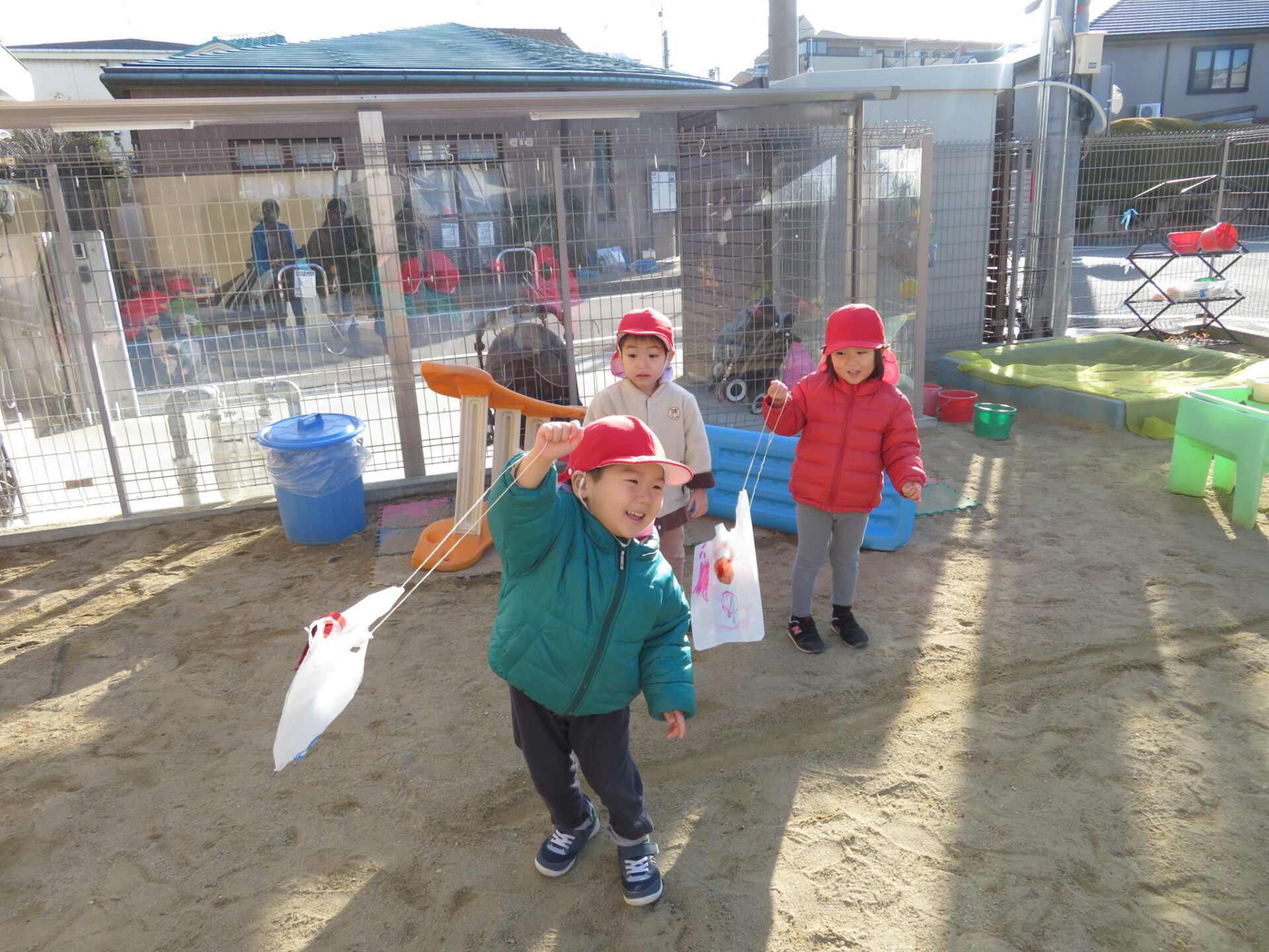 凧の製作をしている時から「いつ凧揚げするん?」と心待ちにしていた子どもたち。「おしょうがつ」の歌にも出てくる「おしょうがつにはたこあげて〜」というフレーズが出てきて「凧揚げ」が子どもたちの身近にあり、「凧揚げ」をするのを楽しみにしている子どもが多く「あと2回寝たら凧揚げ」「次の次保育園行ったらする」などとお家の人にもお話ししていたようです😊