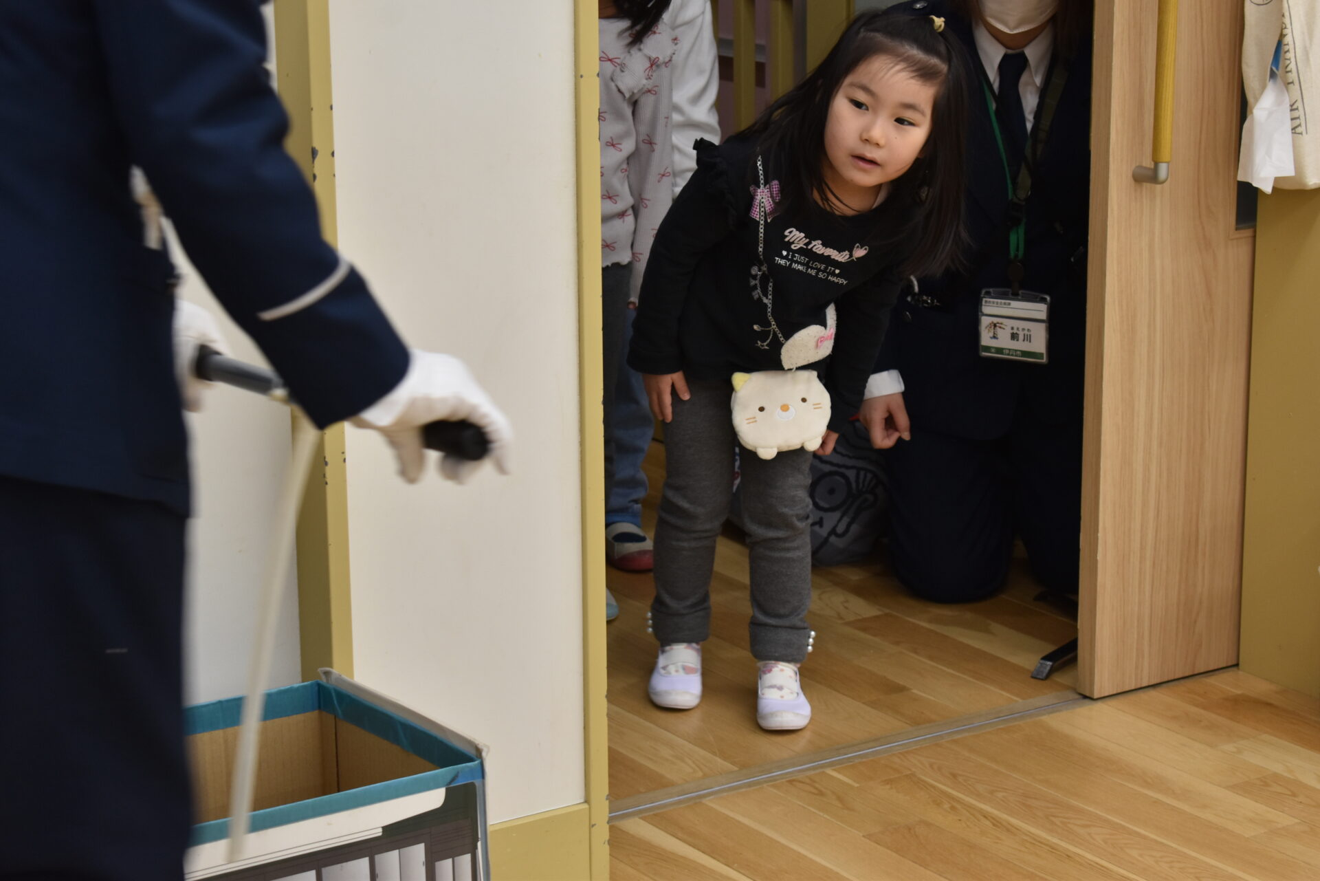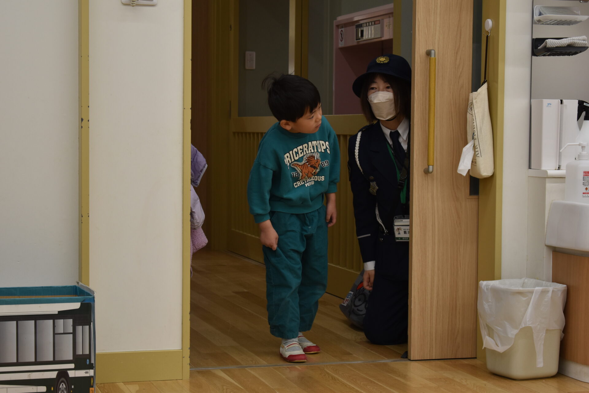 かっこいい制服のおまわりさんを見て、少し緊張気味に挨拶をする子ども達です。